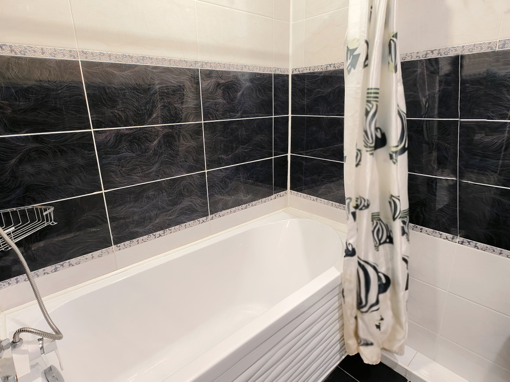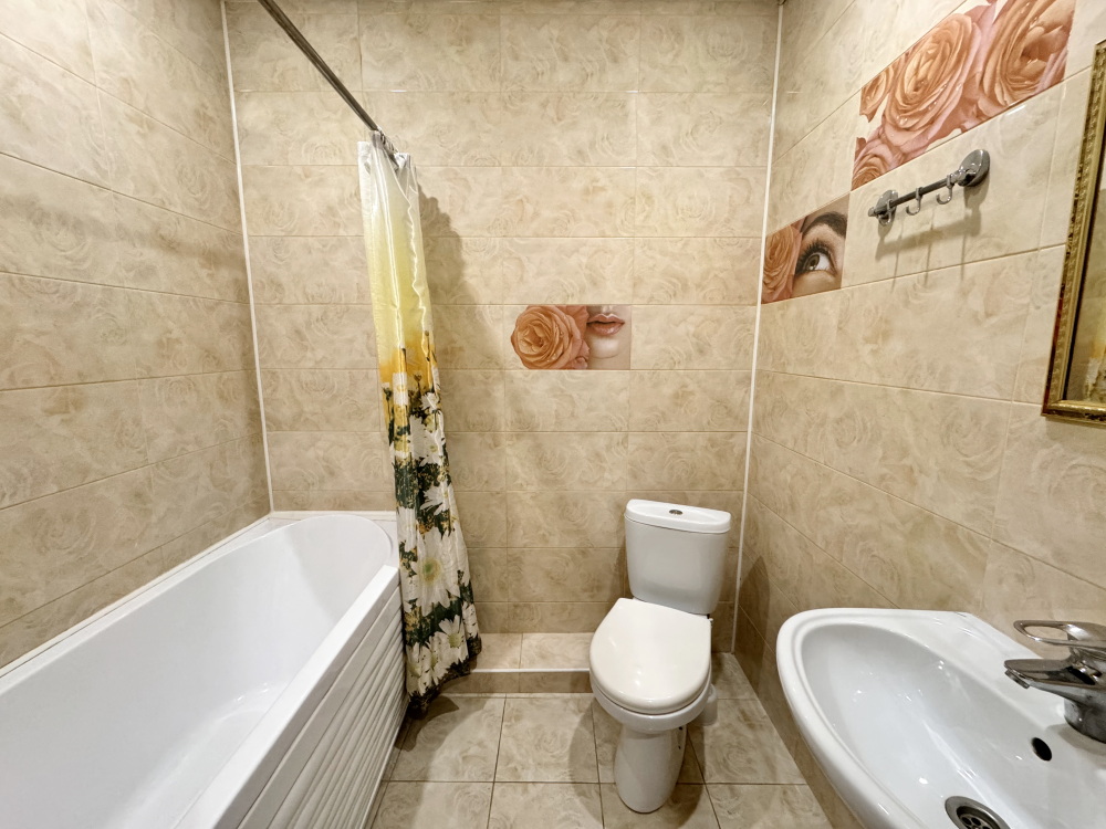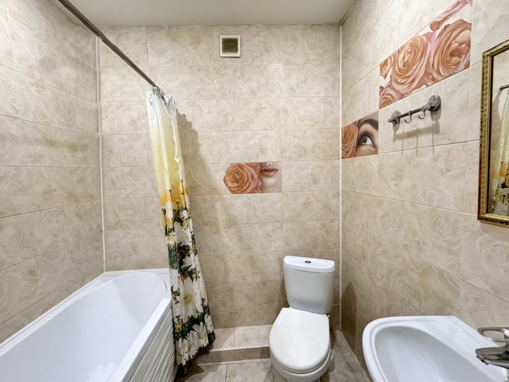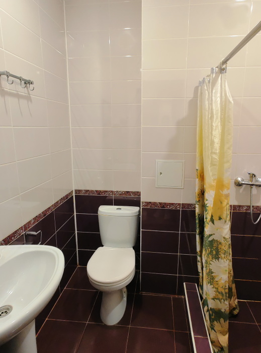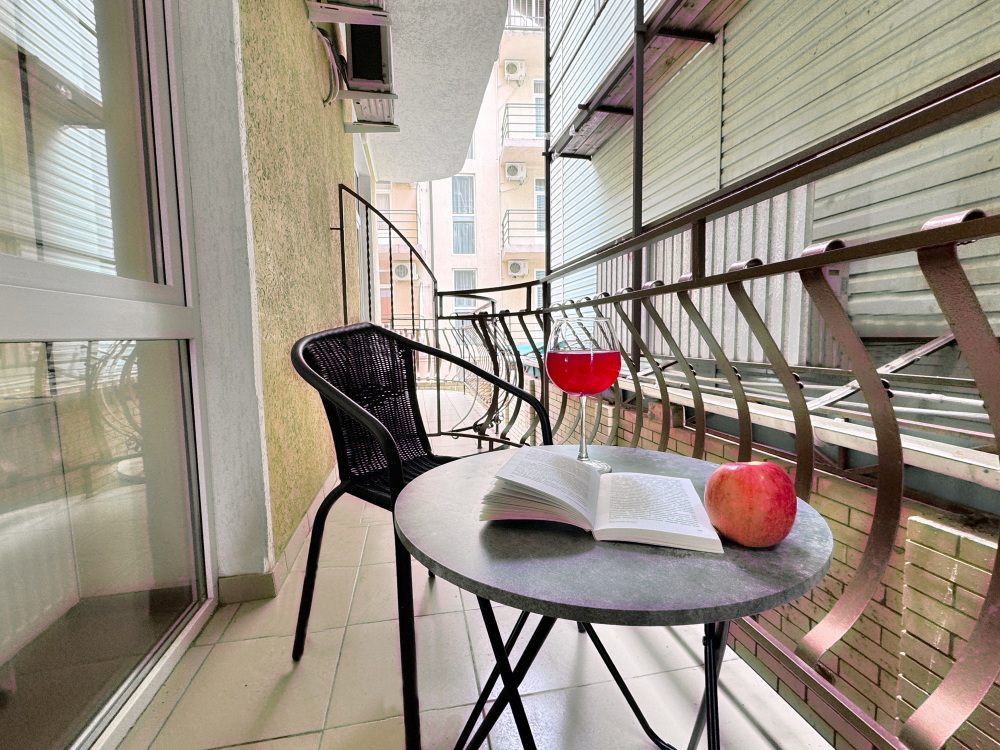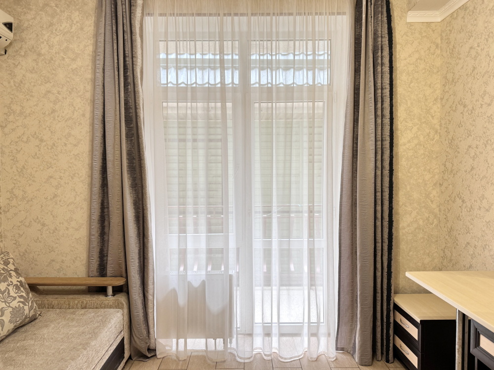 Двуспальная кровать(140*200), двуспальный диван-кровать, прикроватные тумбочки, бра, кондиционер, телевизор, журнальный столик, туалетный столик, зеркало, мини-холодильник, сейф. В прихожей находится вешалка для одежды, шкаф для хранения вещей. Балкон с видом на соседнее здание оборудован летней мебелью для отдыха, стол и стулья. Ванная комната: душ или ванная, фен, раковина и санузел.