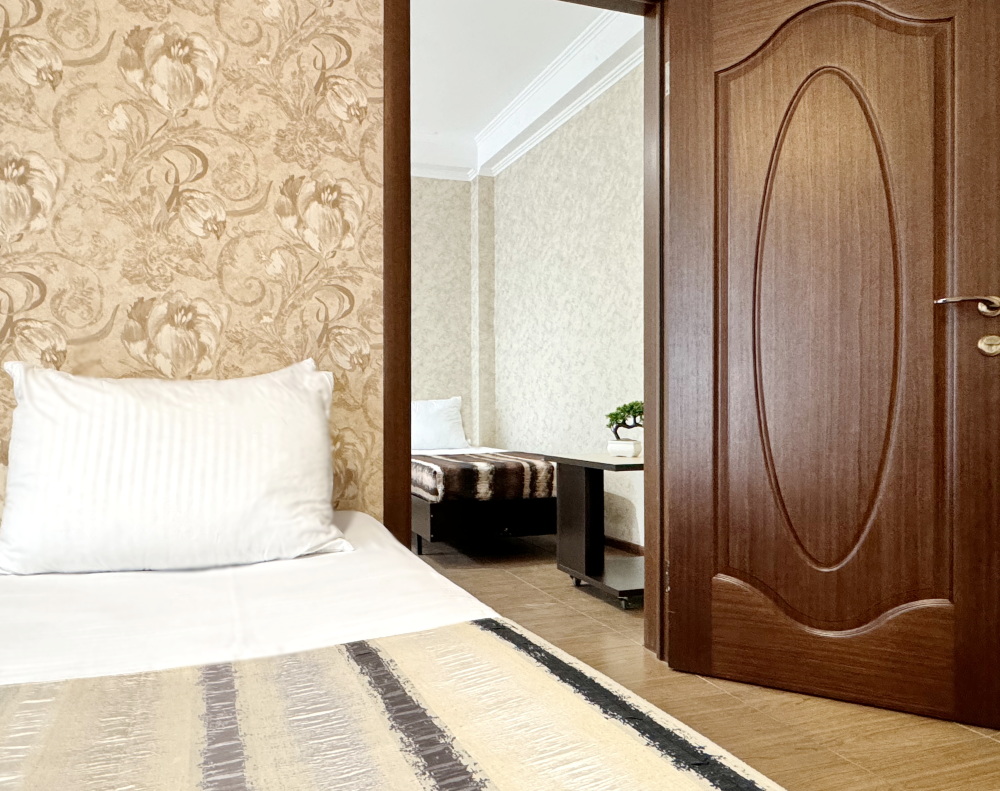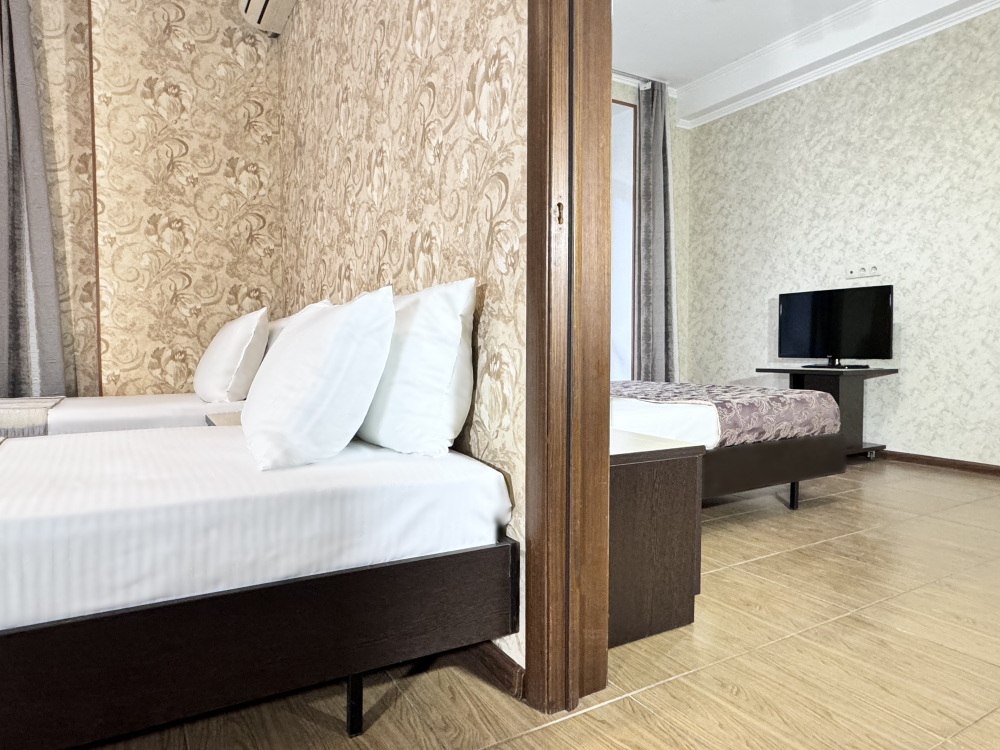 Двухкомнатный номер. В первой спальне находится двуспальная кровать, односпальная кровать, туалетный столик, ТВ. Во второй спальне находится две односпальные кровати, стол, ТВ, мини-холодильник, кондиционер. В прихожей находится вешалка для одежды, шкаф, сейф. Ванная комната: душ или ванная, фен, раковина и санузел. В каждой спальне имеется свой балкон с летней мебель с видом на соседнее здание.