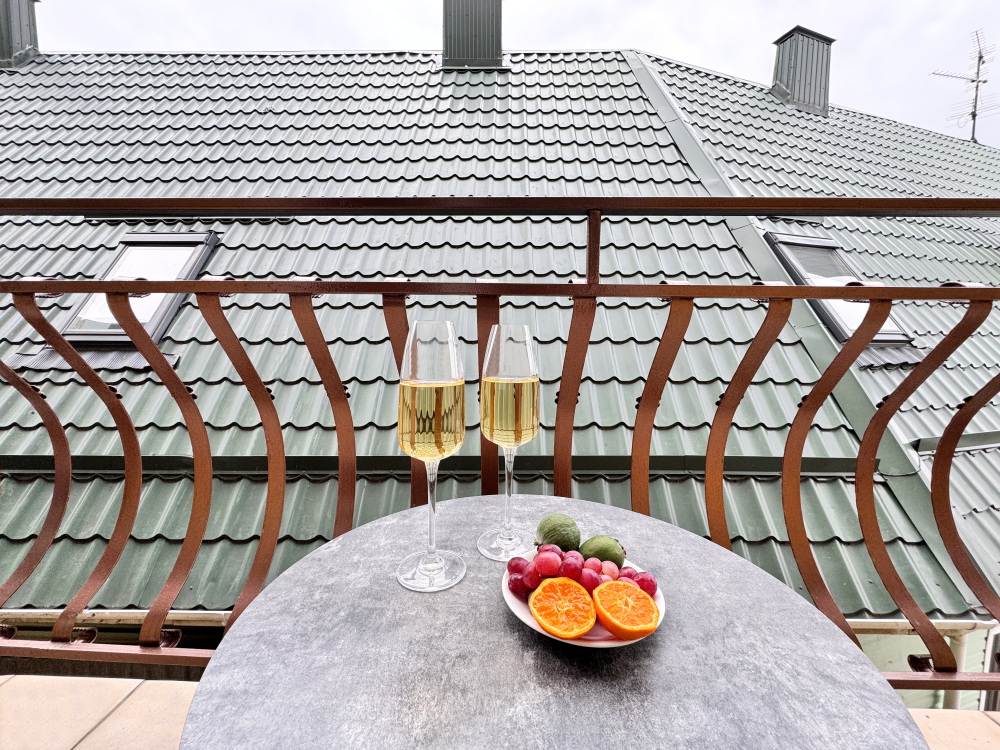 Двухкомнатный номер. В первой спальне находится двуспальная кровать, односпальная кровать, туалетный столик, ТВ. Во второй спальне находится две односпальные кровати, стол, ТВ, мини-холодильник, кондиционер. В прихожей находится вешалка для одежды, шкаф, сейф. Ванная комната: душ или ванная, фен, раковина и санузел. В каждой спальне имеется свой балкон с летней мебель с видом на крышу.