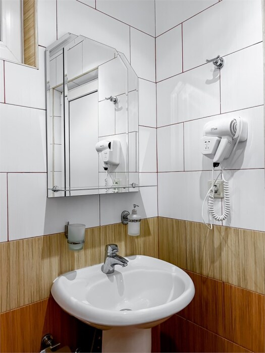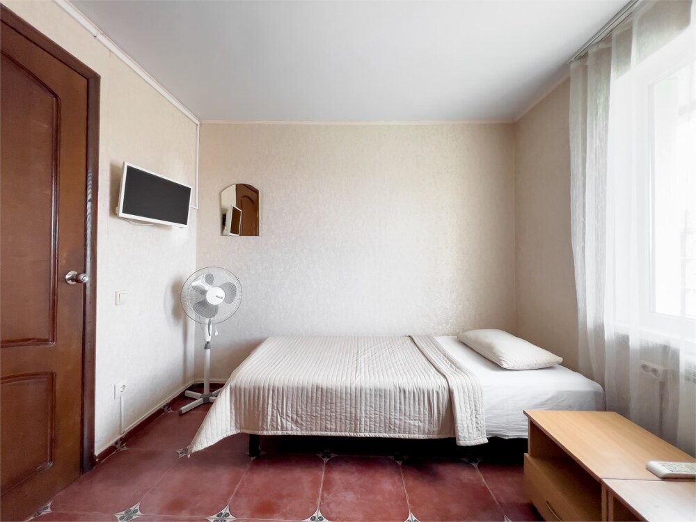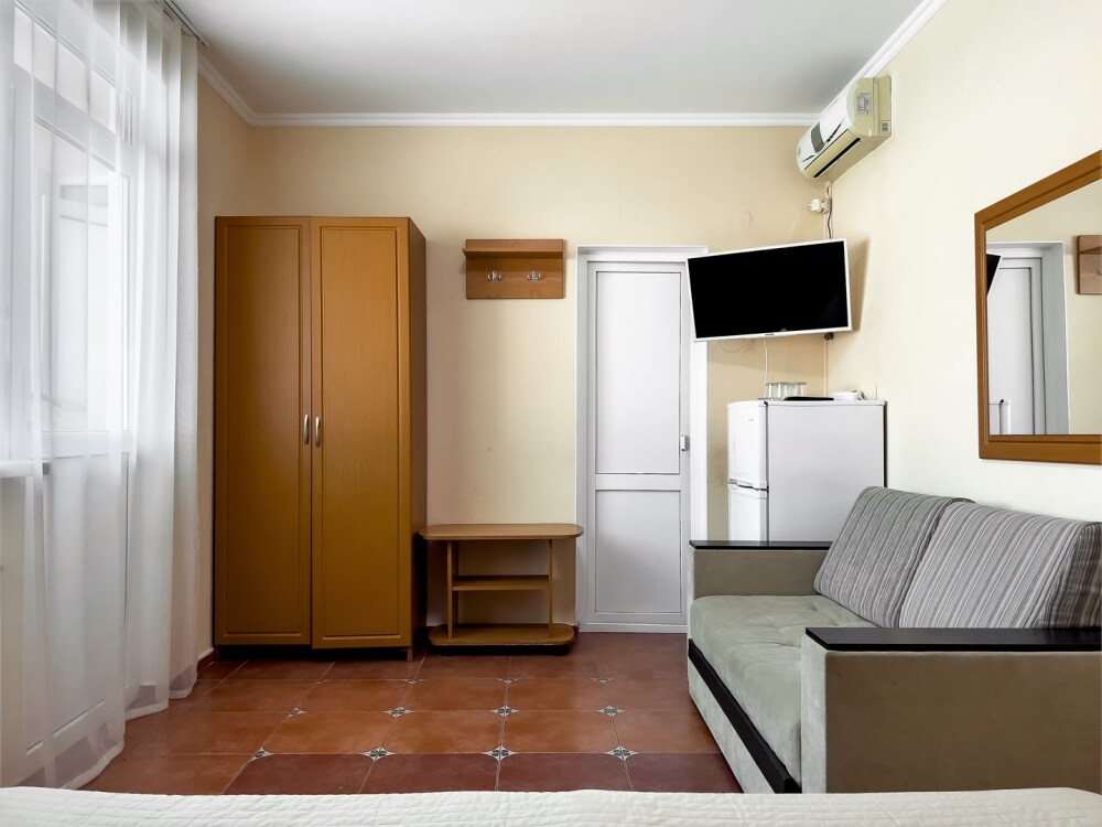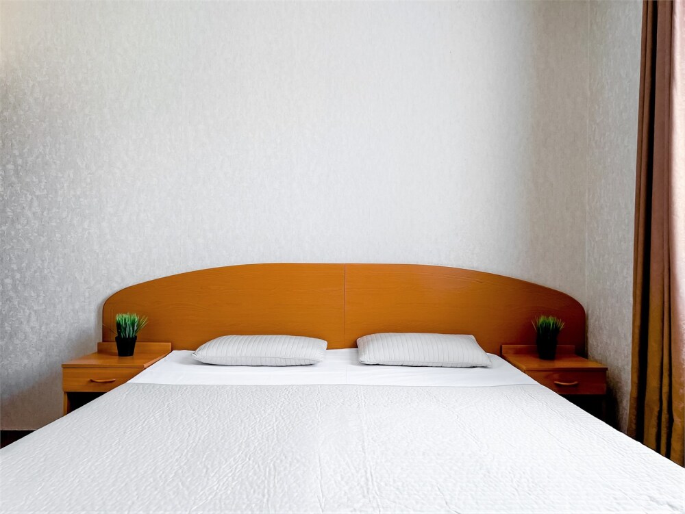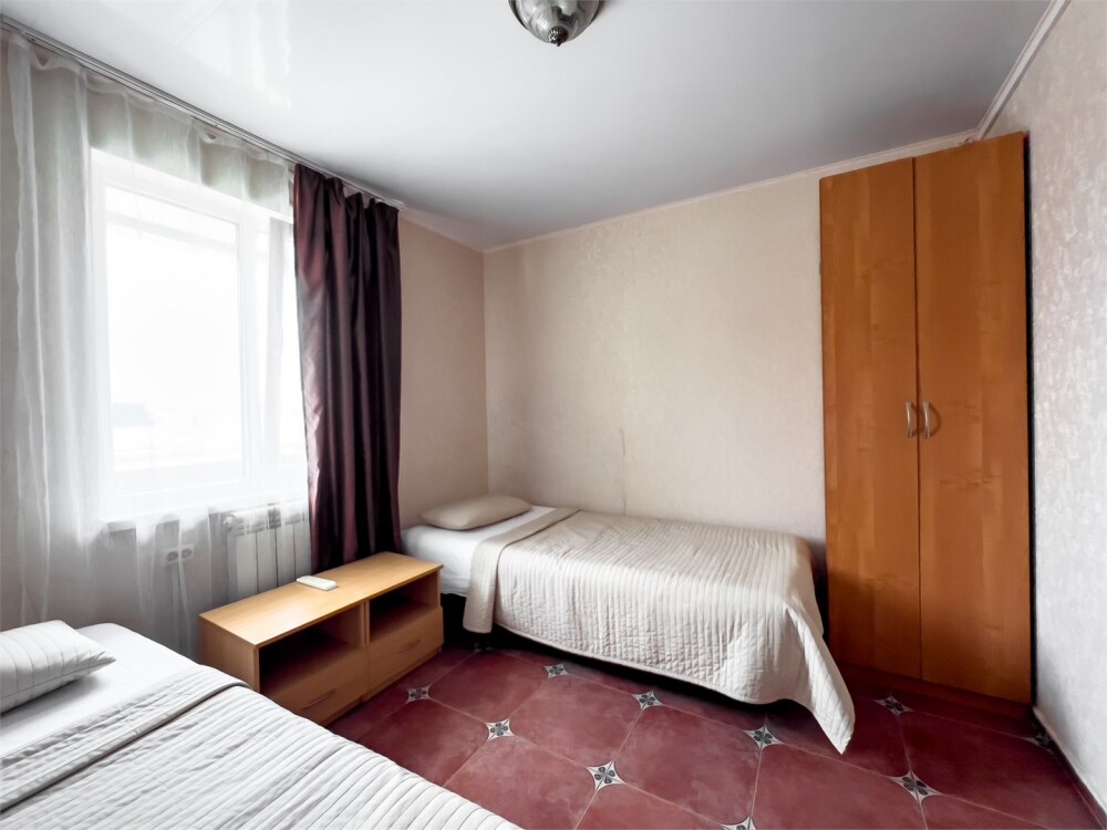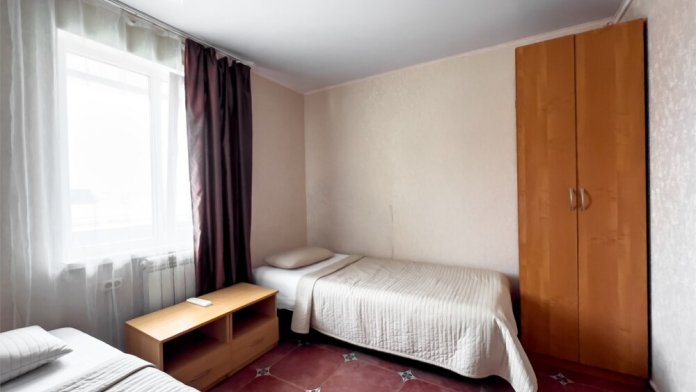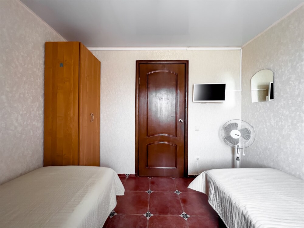 Небольшой, уютный номер эконом- класса. Для вашего удобства в номере представлены 2 односпальные кровати, 2 тумбочки, шкаф для одежды, вешалки, телевизор, вентилятор, комплект постельного белья, полотенец. Душ и туалет находится рядом с номером, в пользовании гостей фен. Номера расположены на 4 этаже. Кухня для самостоятельного приготовления пищи на 3 этаже.