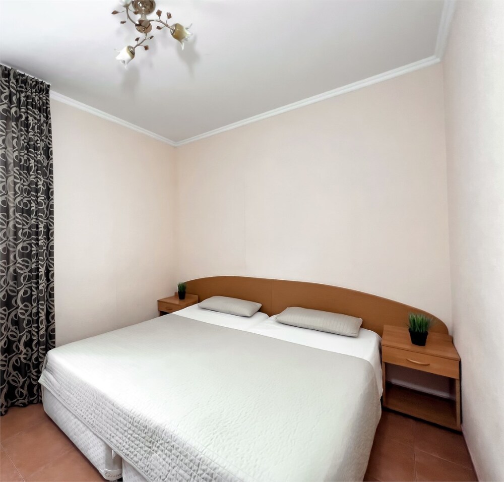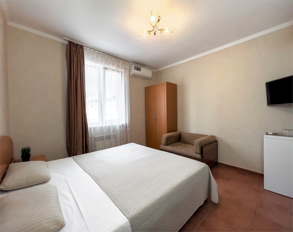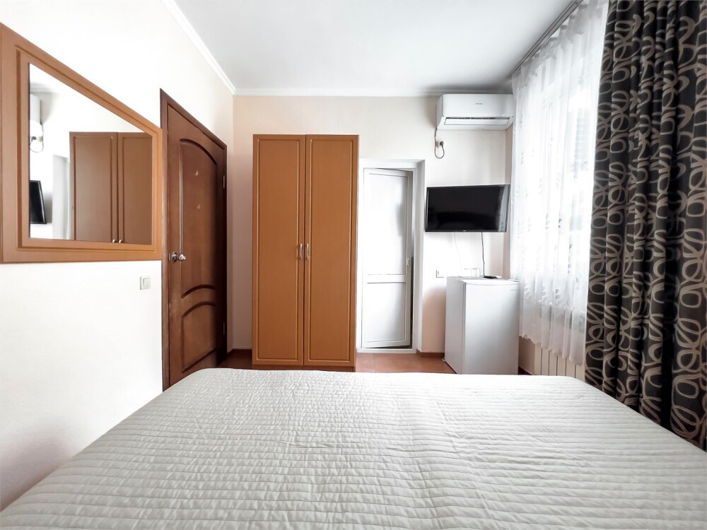 Для вашего удобства в номере представлены 2 односпальные кровати или одна двухспальная, 2 тумбочки, шкаф для одежды, телевизор, кондиционер, холодильник, набор посуды, комплект постельного белья, полотенец, фен, собственная ванная комната.