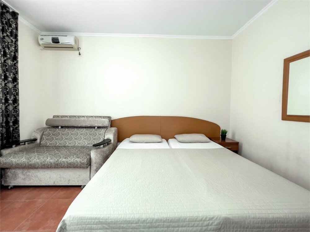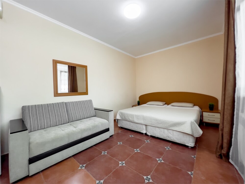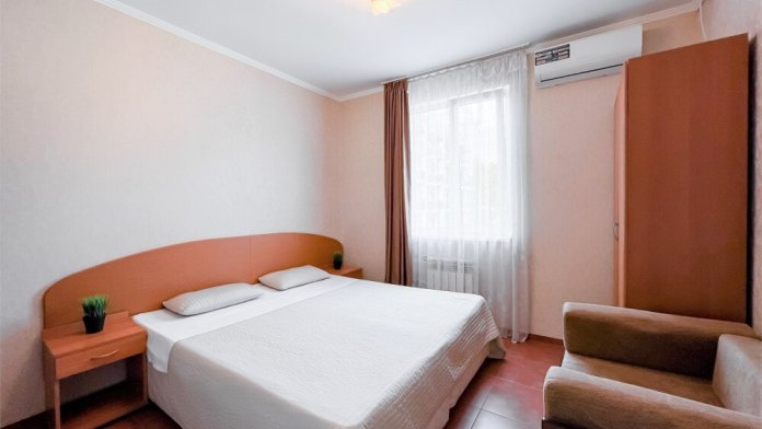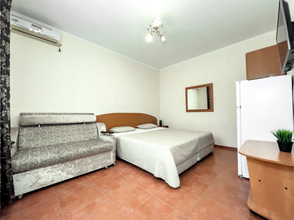 В семейном номере может разместиться до 4 гостей. Для вашего удобства в номере двуспальная кровать или две односпальные, диван - кровать, 2 тумбочки, шкаф для одежды, телевизор, кондиционер, холодильник, собственная ванная комната, комплект постельного белья, набор полотенец, посуды.