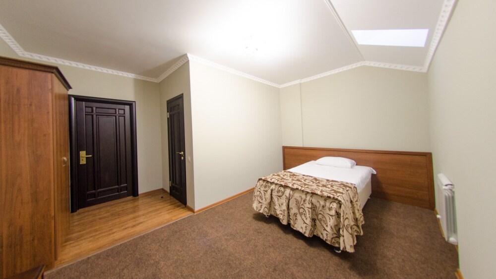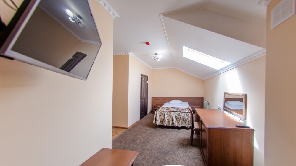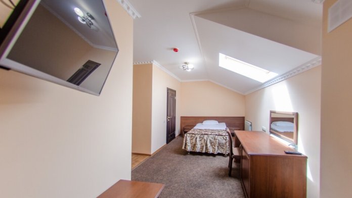 Просторный светлый номер с односпальной кроватью. Матрас кровати – высокий. Покрытие пола – ковролин. Номер выполнен в приятных бежевых тонах, в отделке использованы неаллергенные материалы. Для поддержания комфортной температуры в номере установлена индивидуальная сплит-система и радиатор отопления. Санузел оборудован душевой кабиной, унитазом, раковиной, полотенцесушителем. Горячая вода подается круглосуточно.