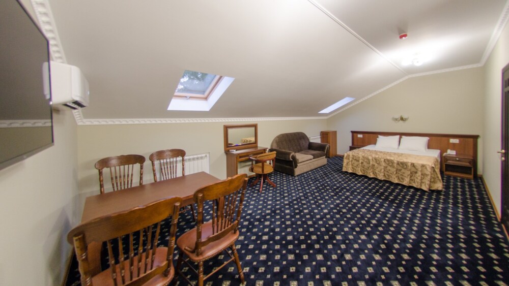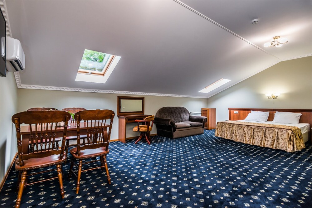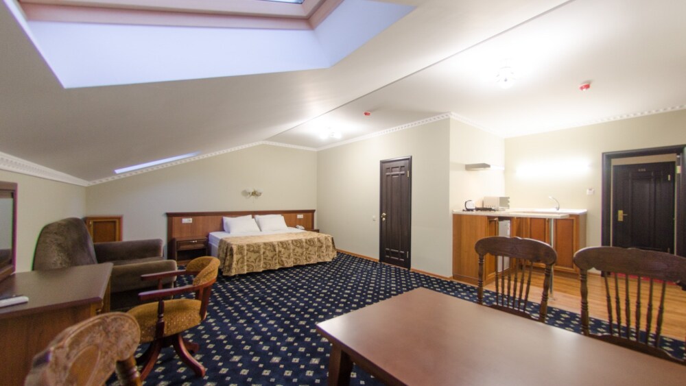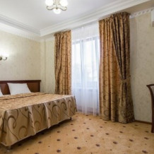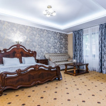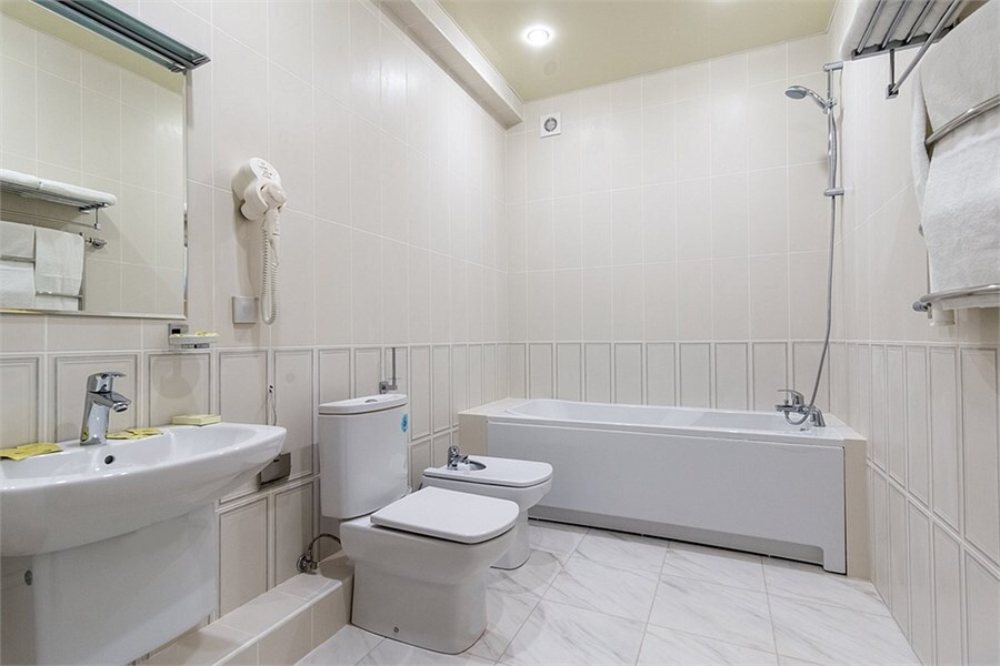 Просторный светлый номер с большой кроватью с высоким матрасом и гостиным уголком. Отлично подойдет для размещения 2 взрослых гостей. Возможно размещение дополнительного места. Покрытие пола – ковролин, на стенах – обои. Номер выполнен в приятных бежевых тонах, в отделке использованы неаллергенные материалы. Для поддержания комфортной температуры в номере установлена индивидуальная сплит-система и радиатор отопления. Санузел оборудован ванной, унитазом, биде, раковиной, полотенцесушителем. Горячая вода подается круглосуточно.