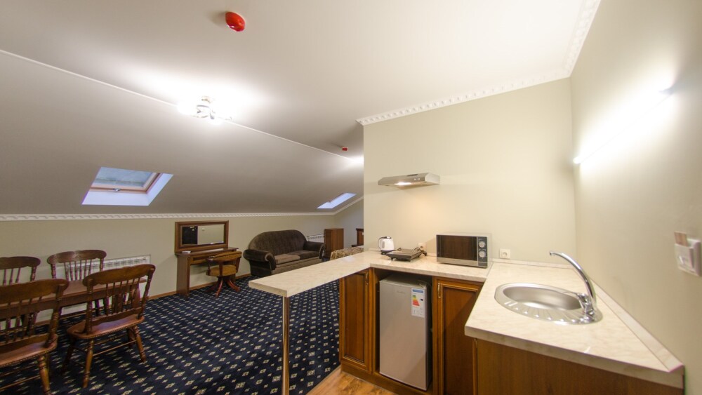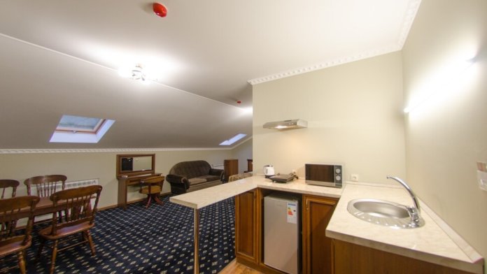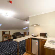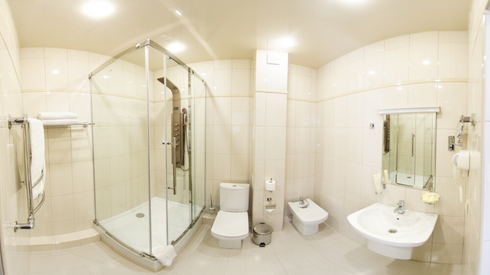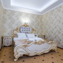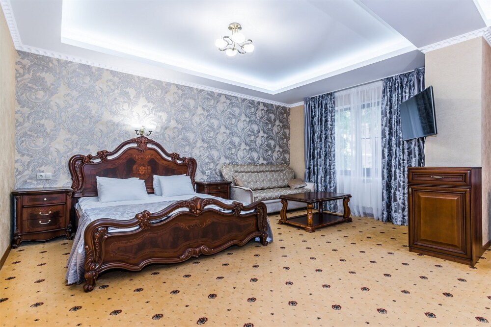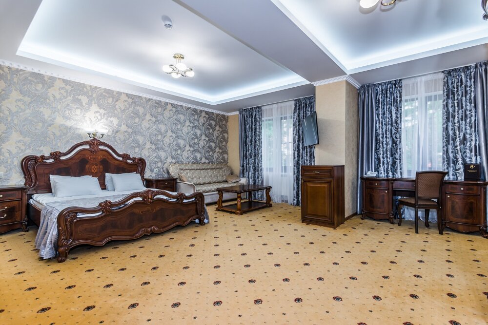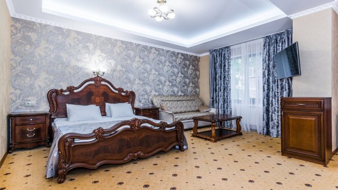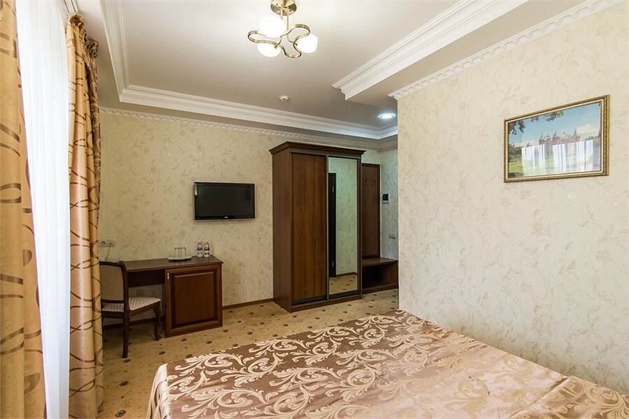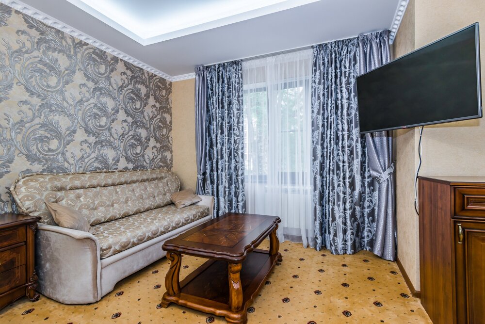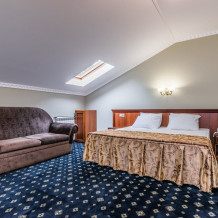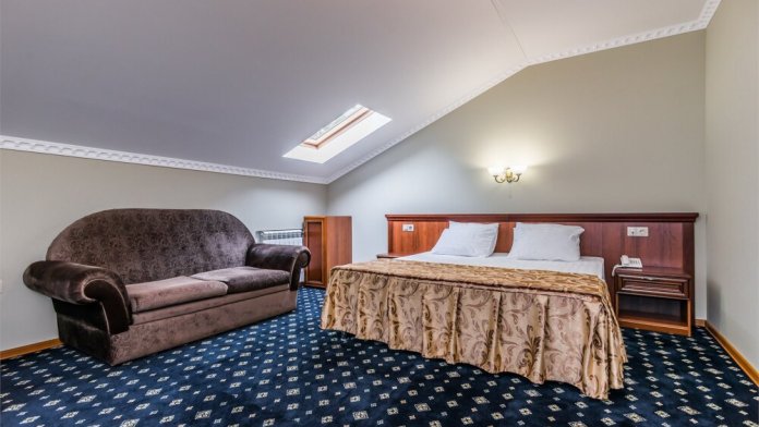 Просторный светлый номер с большой кроватью с высоким матрасом и раскладным диваном. Покрытие пола – ковролин. Номер выполнен в приятных бежевых тонах, в отделке использованы неаллергенные материалы. Для поддержания комфортной температуры в номере установлена индивидуальная сплит-система и радиатор отопления. Санузел оборудован душевой кабиной, унитазом, биде, раковиной, полотенцесушителем. Горячая вода подается круглосуточно.
