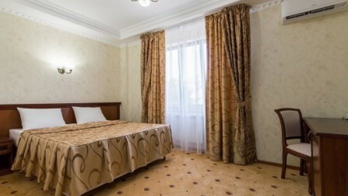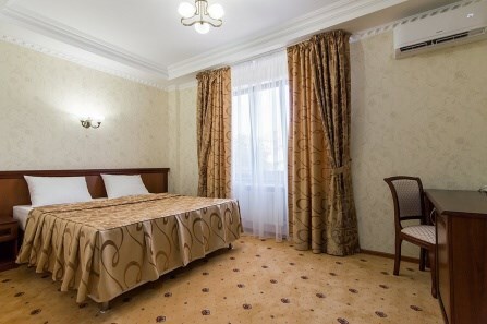 Просторный светлый номер с большой кроватью с высоким матрасом. Покрытие пола – ковролин, на стенах – обои. Номер выполнен в приятных бежевых тонах, в отделке использованы неаллергенные материалы. Для поддержания комфортной температуры в номере установлена индивидуальная сплит-система и радиатор отопления. Санузел оборудован душевой кабиной, унитазом, раковиной, полотенцесушителем. Горячая вода подается круглосуточно.