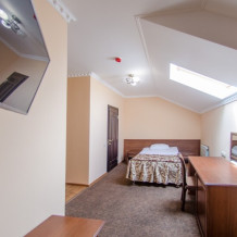 Просторный светлый номер с большой кроватью с высоким матрасом. Отлично подойдет для размещения 2 взрослых гостей. Возможно размещение 1 дополнительного места. Покрытие пола – ковролин, на стенах – обои. Номер выполнен в приятных бежевых тонах, в отделке использованы неаллергенные материалы. Для поддержания комфортной температуры в номере установлена индивидуальная сплит-система и радиатор отопления. Санузел оборудован душевой кабиной, унитазом, раковиной, полотенцесушителем. Горячая вода подается круглосуточно.