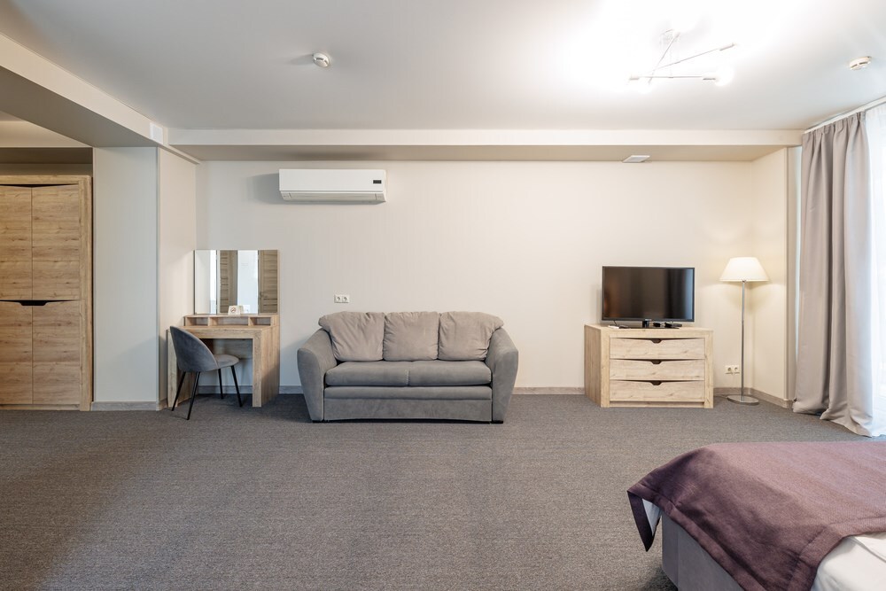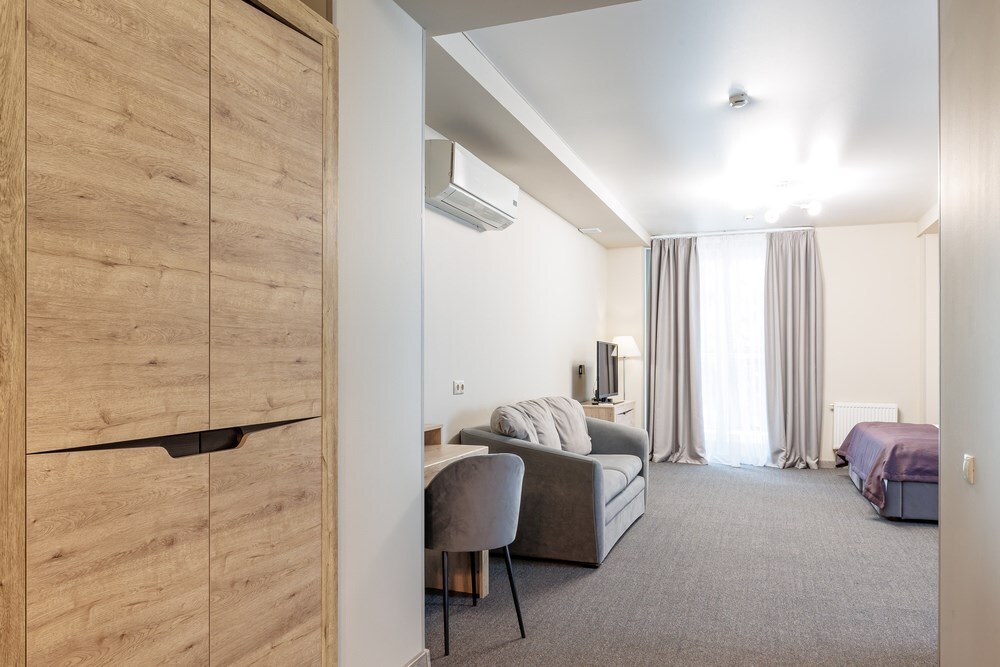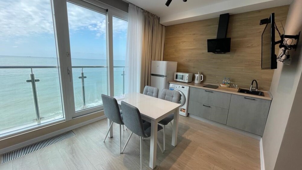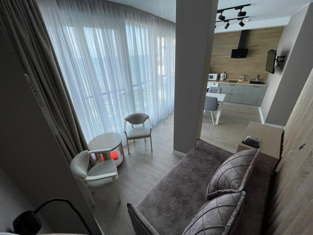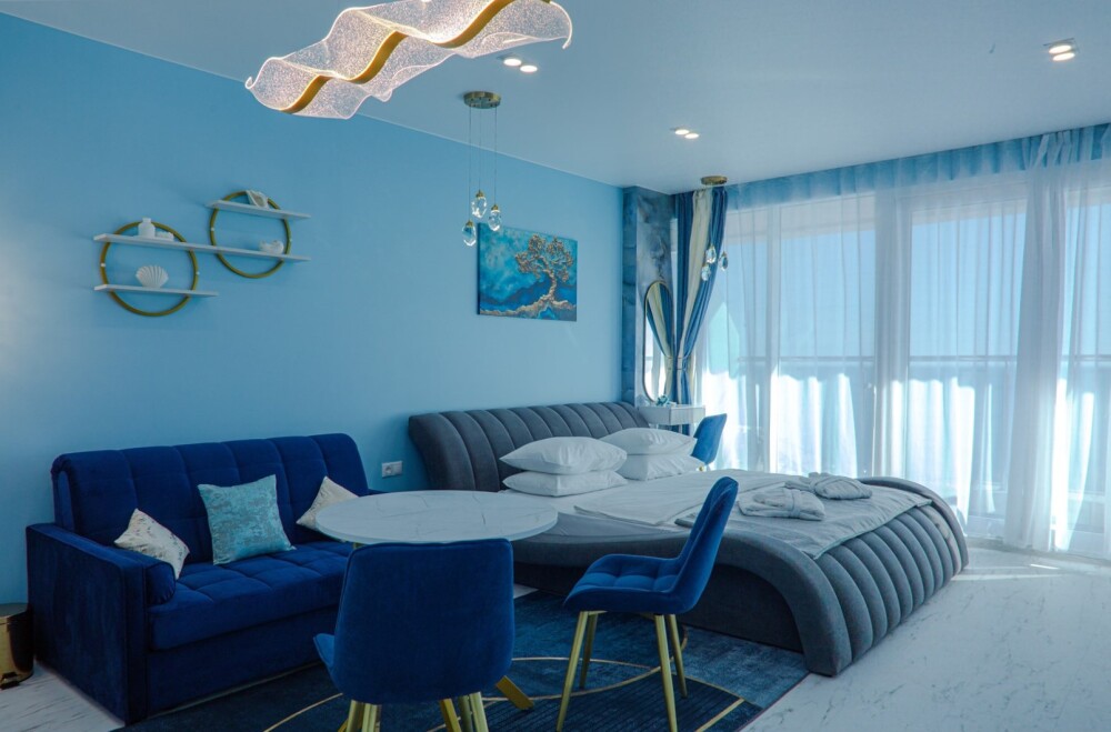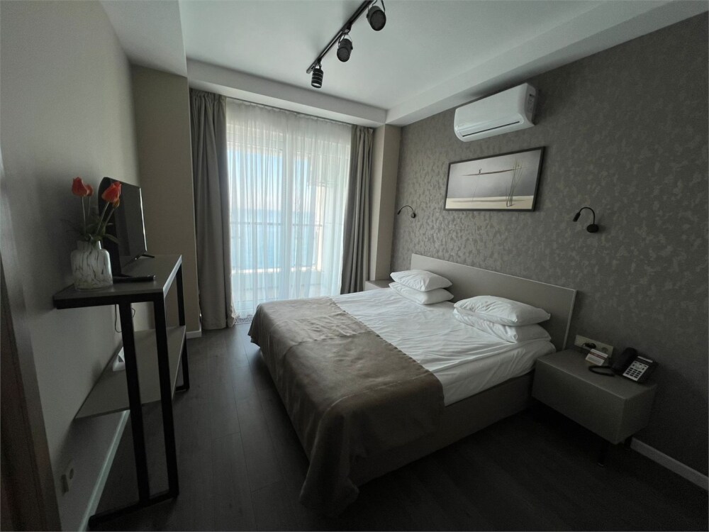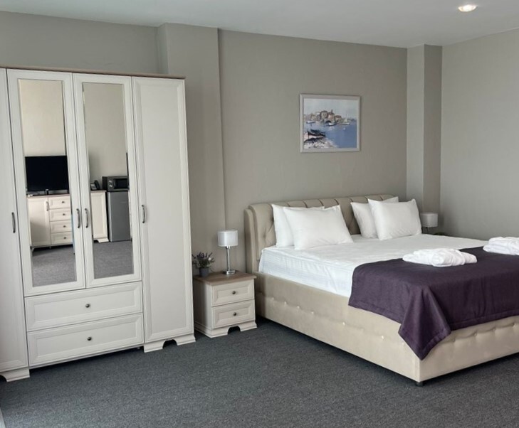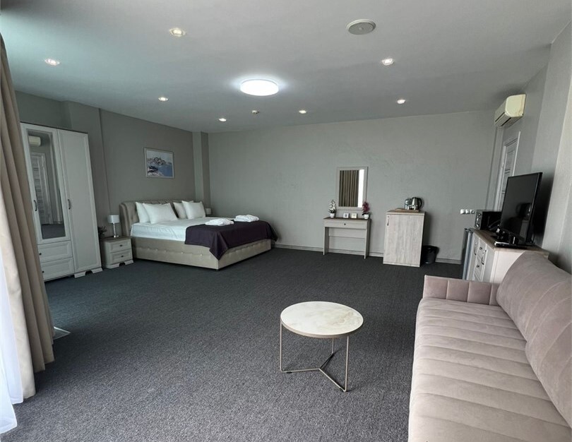 Уютный номер с большой двуспальной кроватью и раскладным двуспальным диваном, уютная кухонная зона с прямым видом на море. Без балкона. В стоимость входит: вода бутилированная, краснодарский чай, премиальная косметика Sargan, пользование оборудованным пляжем в летний сезон.