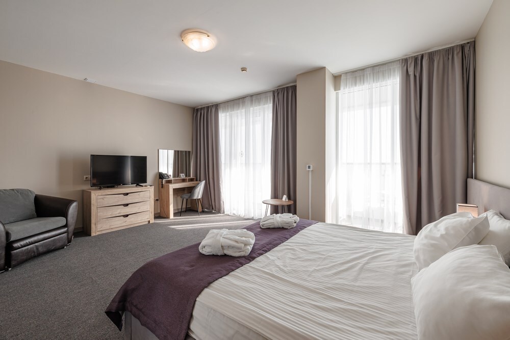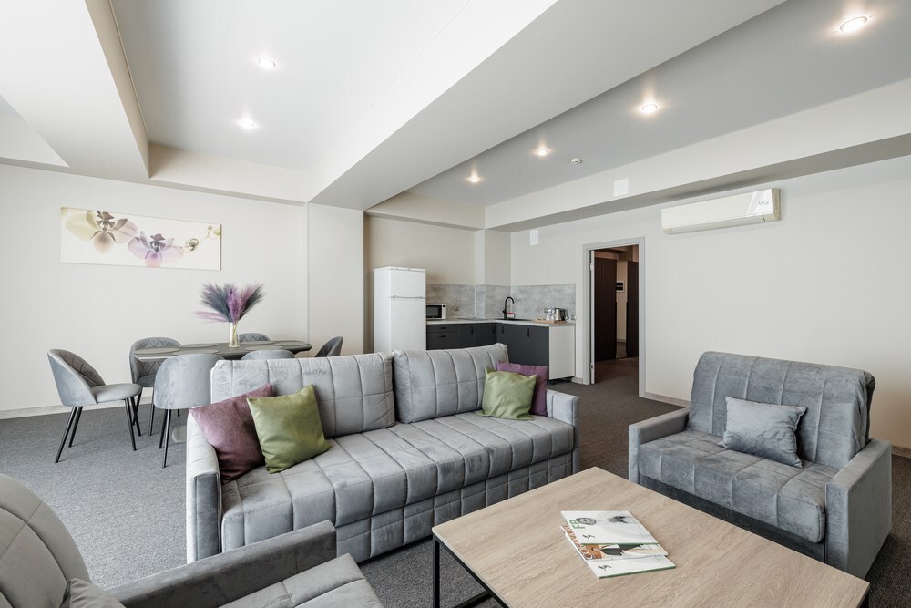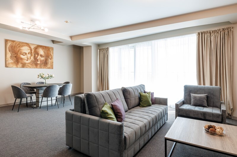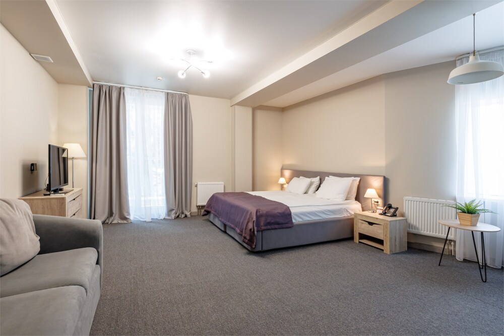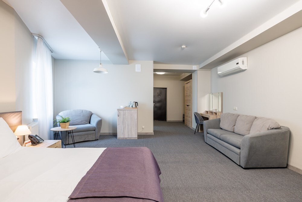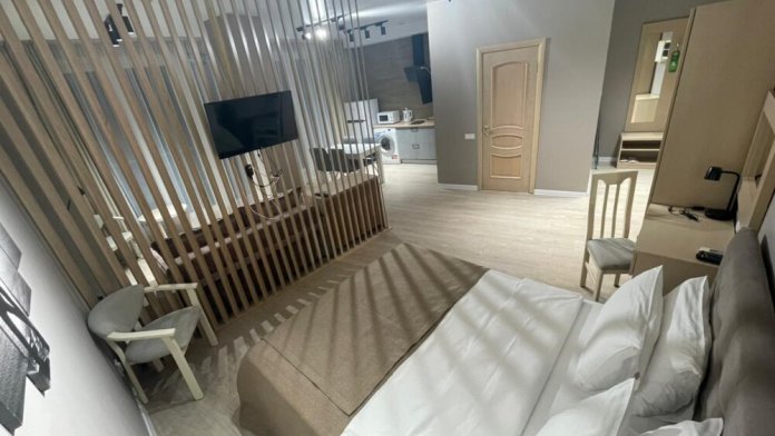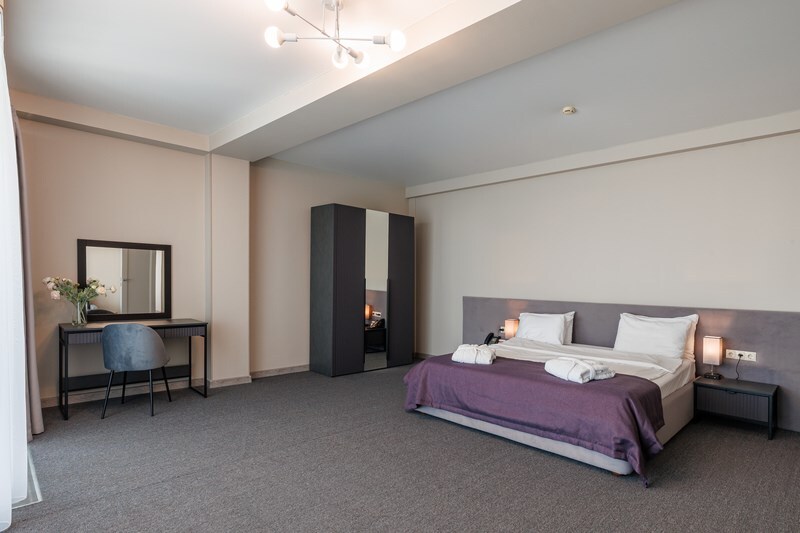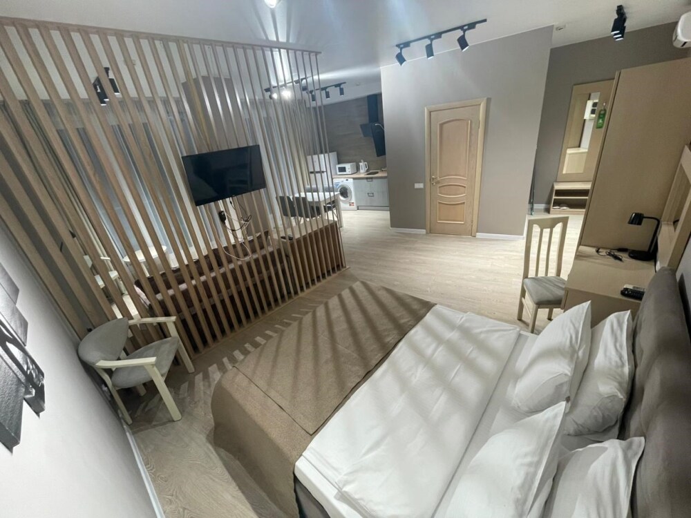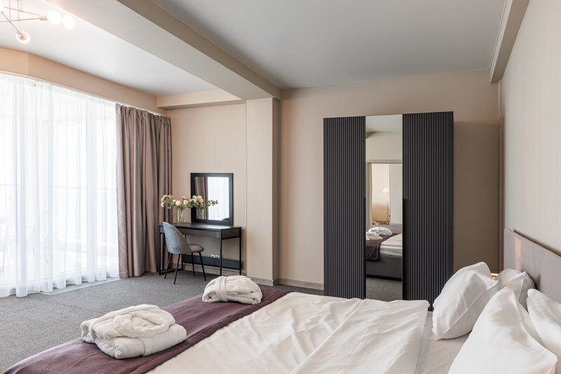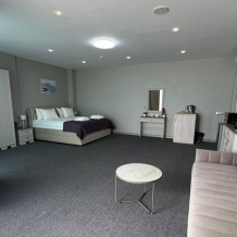 Двухкомнатный просторный номер, состоящий из спальни, гостиной с кухней и 2 ванных комнат. Просторный балкон с видом на море. В стоимость входит: вода бутилированная, краснодарский чай, кофе, премиальная косметика Sargan, пользование оборудованным пляжем в летний сезон.