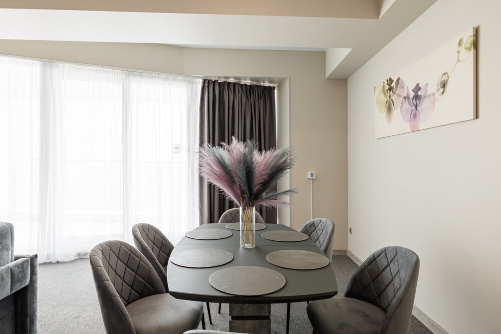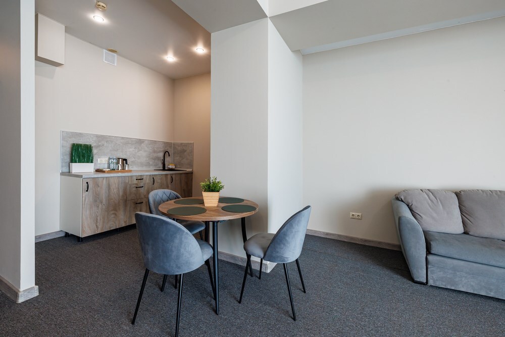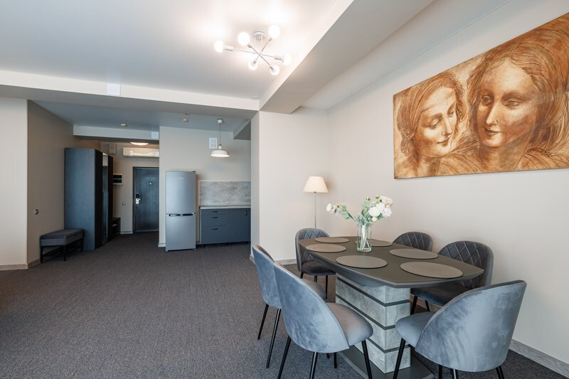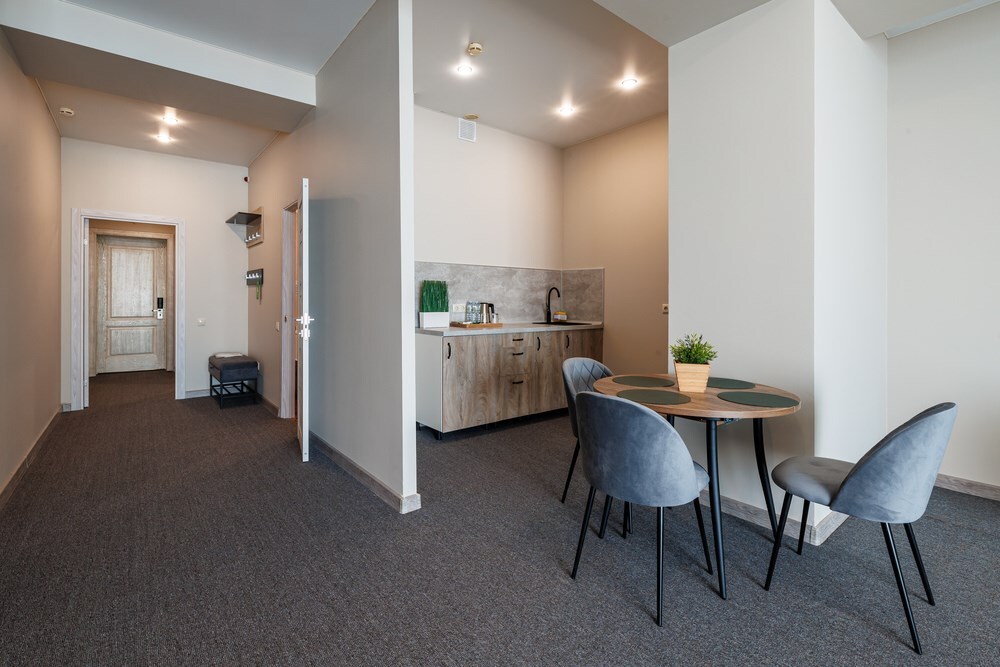 В номере: телевизор со Smart TV, телефон, утюг, кофемашина, система климат-контроля, сенсорные панели для управление освещением, джакузи на террасе, теплый пол, затемняющая штора, обеденный стол, пуфики, раскладной диван, стул, вешалки-плечики, зеркало, шкаф для одежды/комод, набор посуды, сушилка для белья, звуконепроницаемые стены и окна, косметическое зеркало, бутилированная вода, гладильная доска, набор для приготовления чая и кофе.