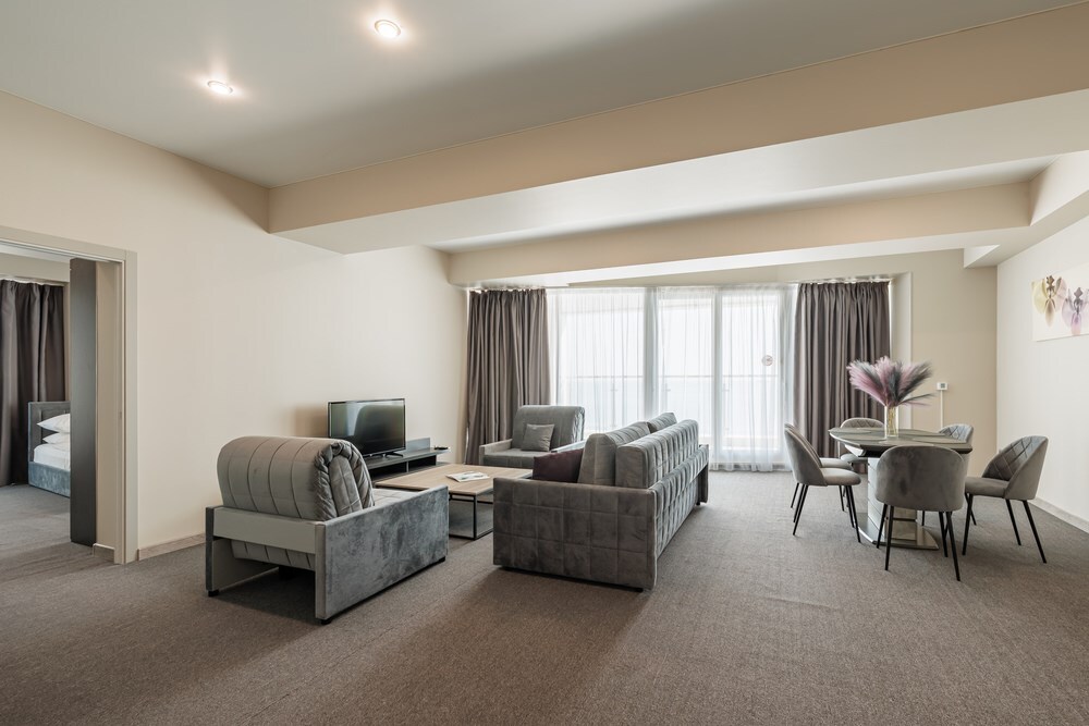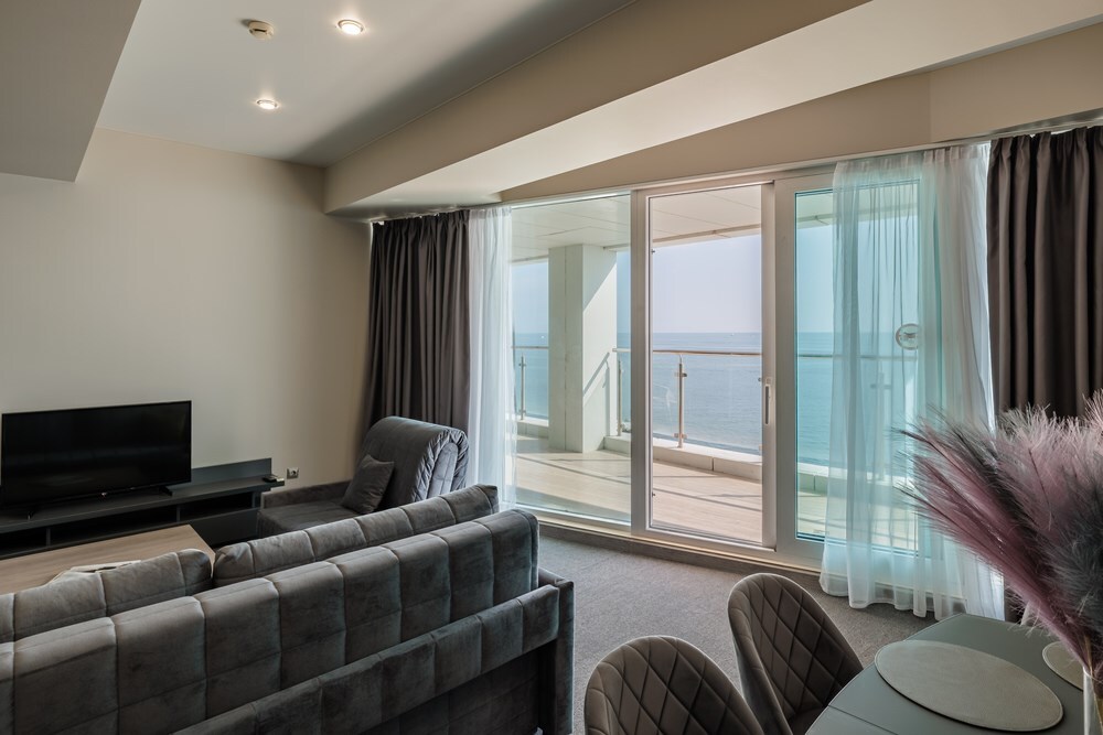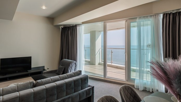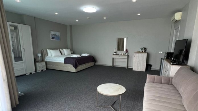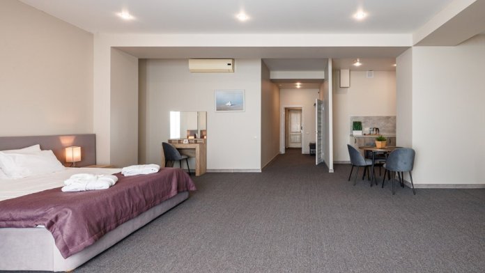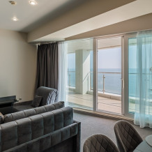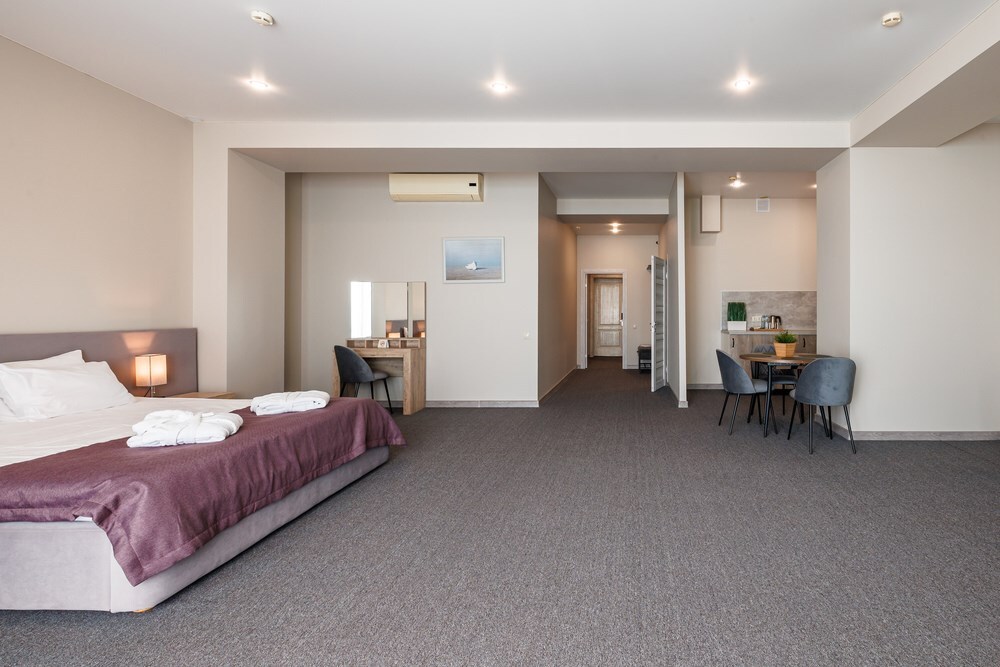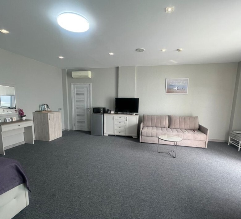 3-комнатный просторный номер состоящий из двух спален (с большой кроватью и двумя раздельными), большой гостиной с кухней ( есть электроплита) и двух ванных комнат. Просторный балкон с видом на море. В стоимость входит : вода бутилированная, краснодарский чай, кофе, премиальная косметика Sargan, пользование оборудованным пляжем в летний сезон.