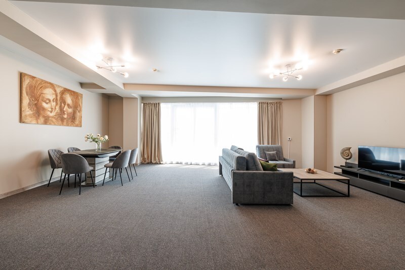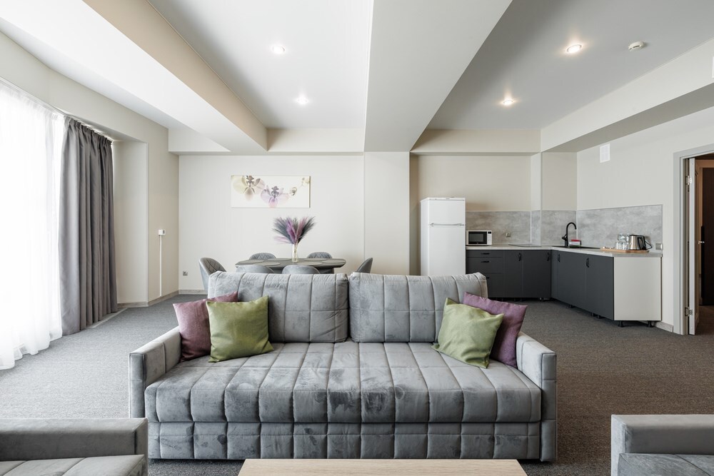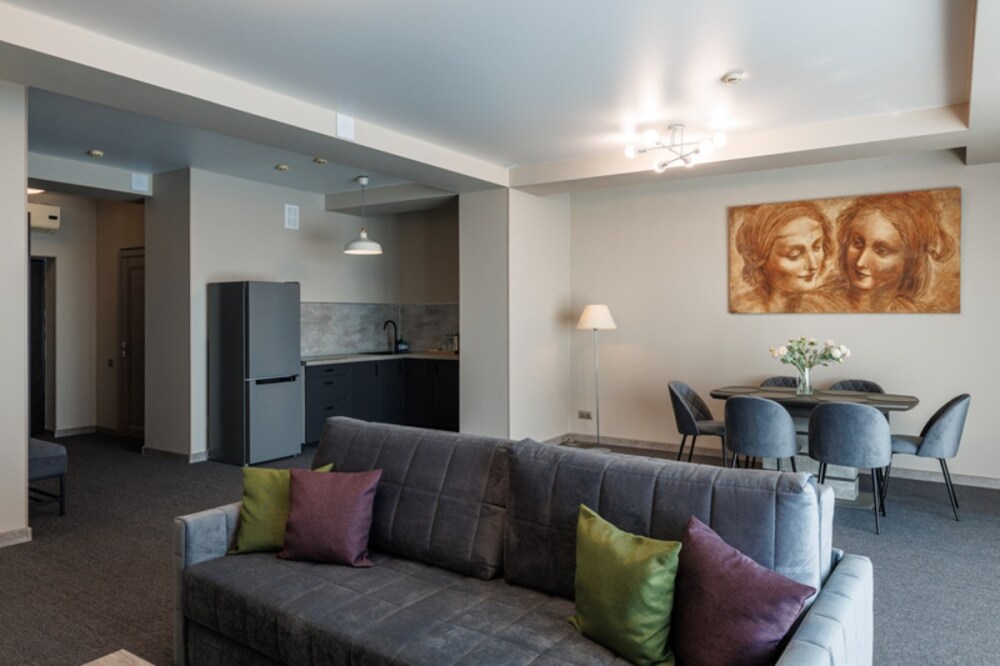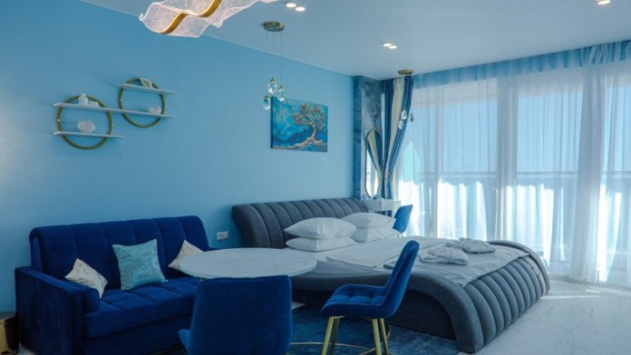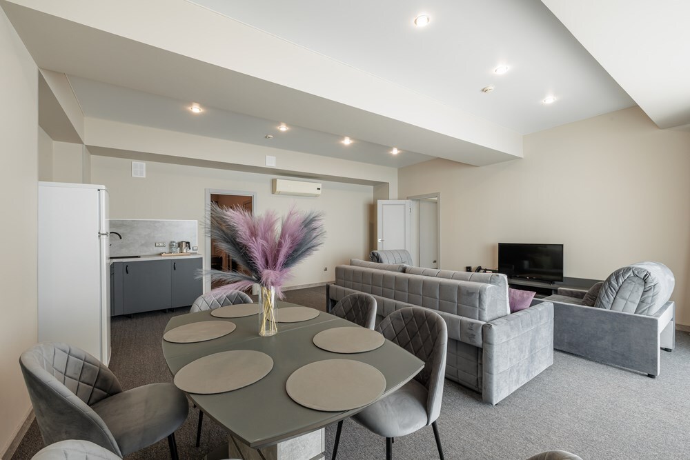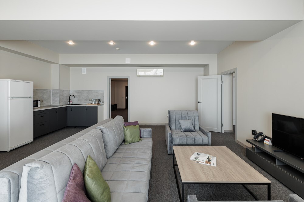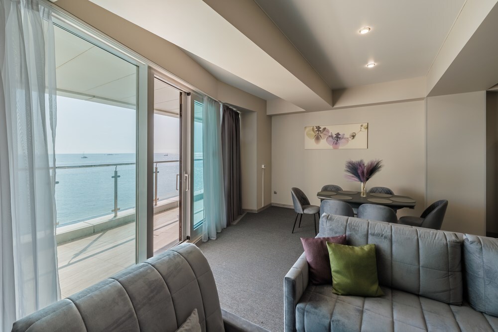 3-комнатный просторный номер состоящий из двух спален (с большой кроватью и двумя раздельными), большой гостиной с кухней ( есть электроплита) и двух ванных комнат. Просторный балкон с видом на море. В стоимость входит : вода бутилированная, краснодарский чай, кофе, премиальная косметика Sargan, пользование оборудованным пляжем в летний сезон.