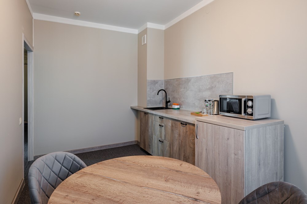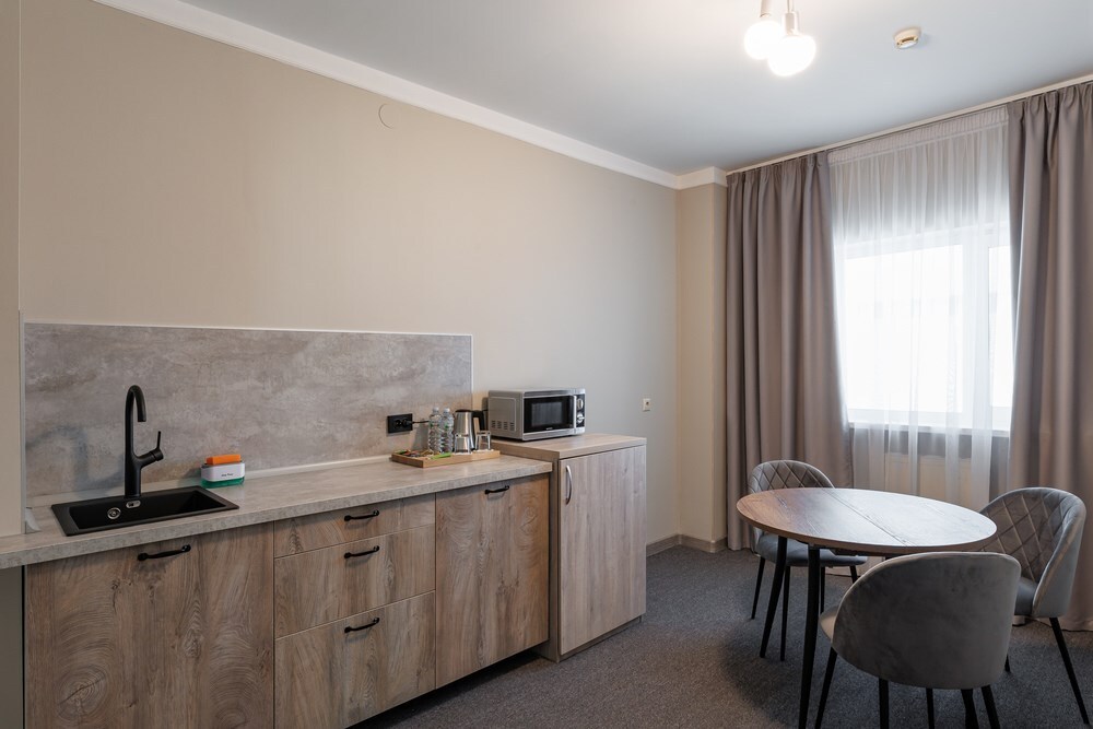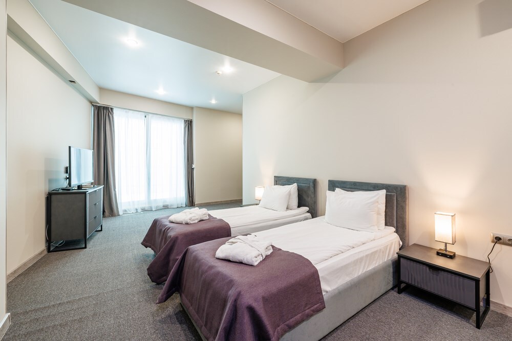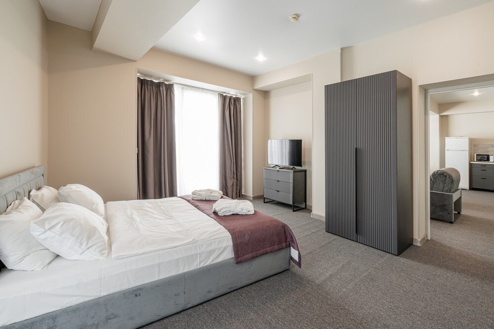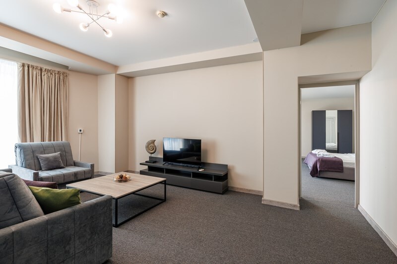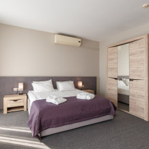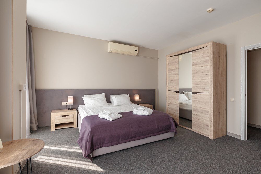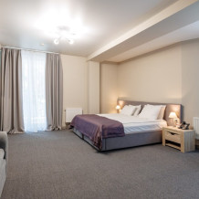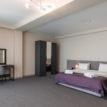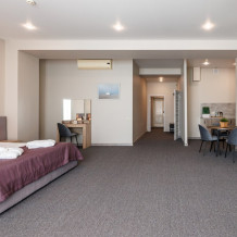 Просторный двухкомнатный номер с кухней. В первой комнате большой двуспальная кровать, вторая спальня с 2 односпальными кроватями и балконом с видом на море. Идеально подходят для отдыха большой семьи. В стоимость входит: вода бутилированная, краснодарский чай, кофе, премиальная косметика Sargan, пользование оборудованным пляжем в летний сезон.