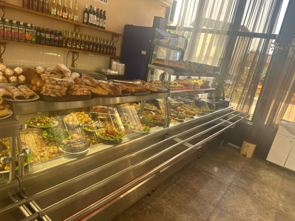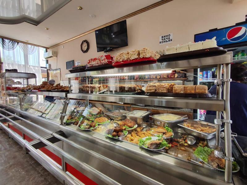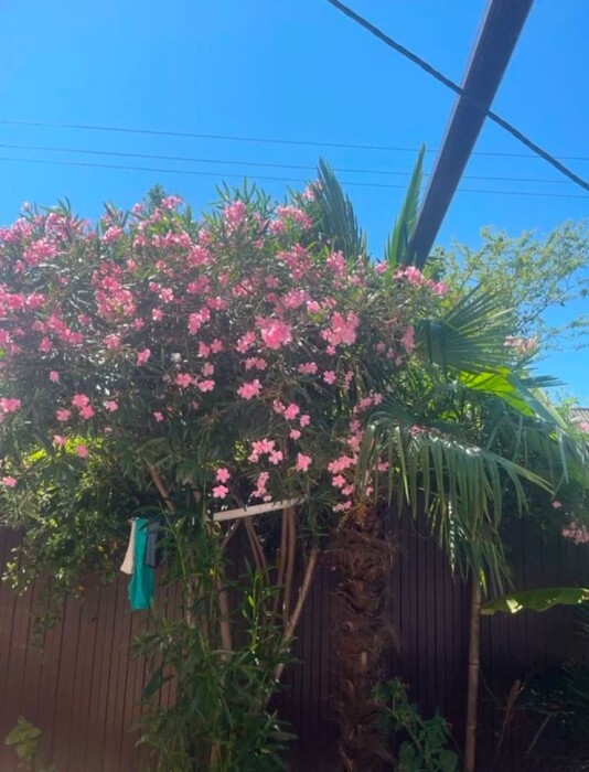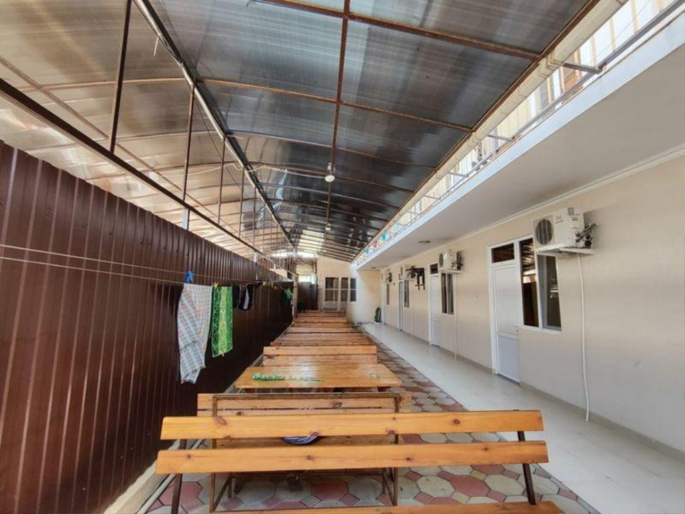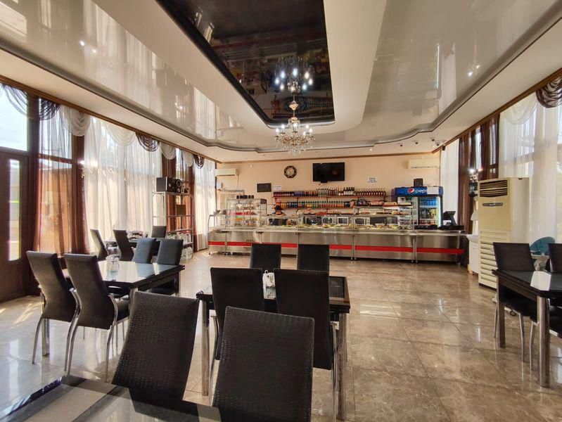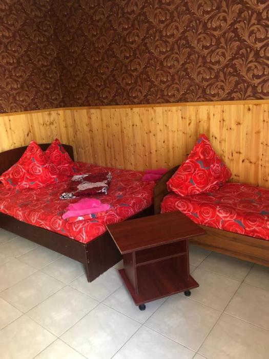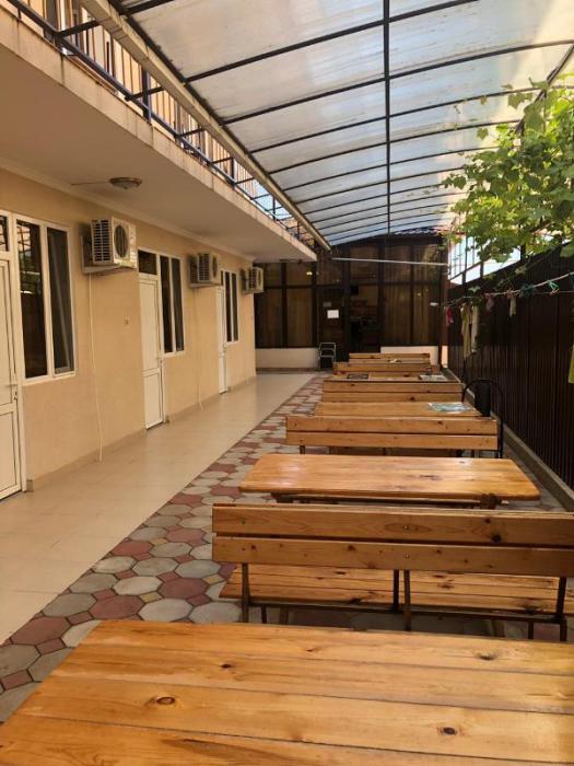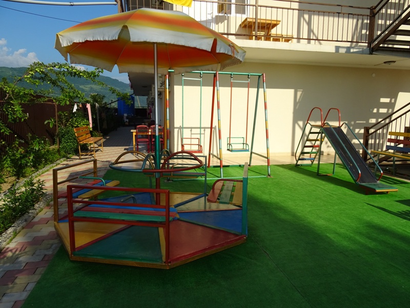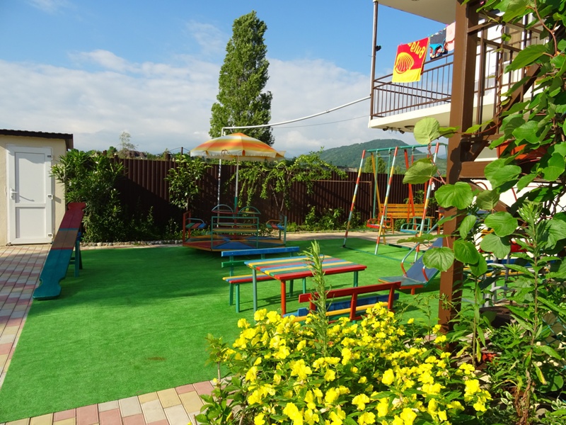Территория дома очень просторная, имеется бассейн, двор выложен тротуарной плиткой, в клумбах высажены экзотические цветы, имеется большой мангал, на котором готовятся вкусные шашлыки для гостей. Также на территории гостевого дома работает своя столовая, есть бесплатный Wi-Fi, детская площадка, охраняемая парковка.