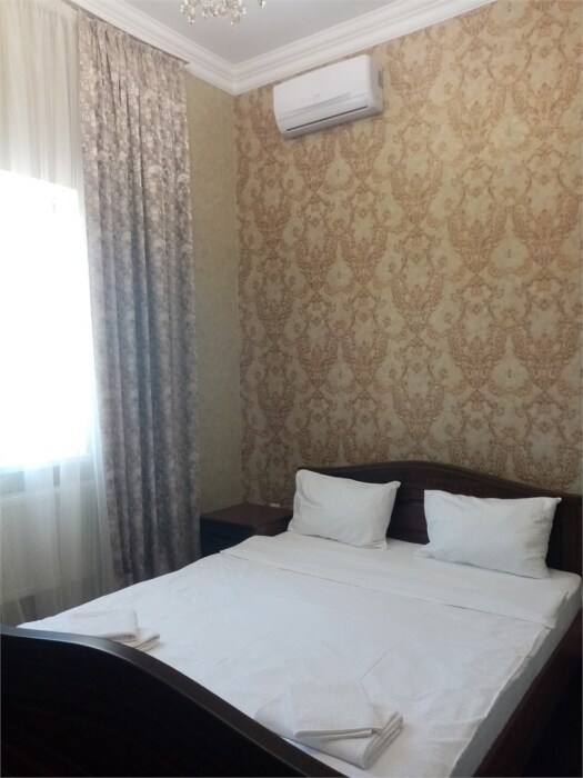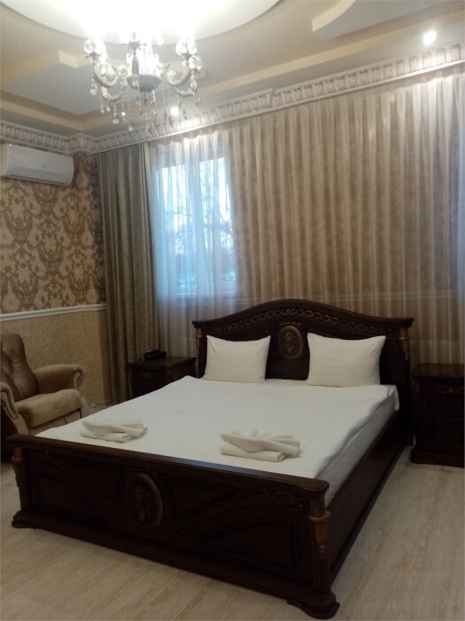 Интерьерный однокомнатный люкс подходит для размещения от 1 до 2 гостей. В номере большая двуспальная кровать, телевизор, кондиционер, бесплатный Wi-Fi, холодильник, чайник. Предоставляется комплект одноразовых туалетных принадлежностей: мыло, гель для душа, шампунь-кондиционер, зубной набор, тапочки и рожок для обуви.