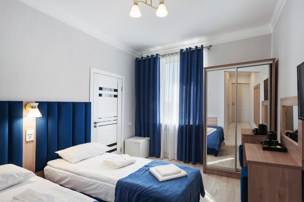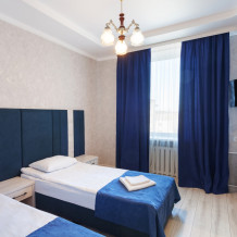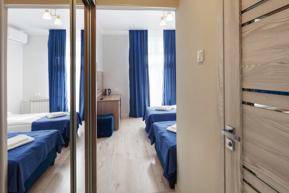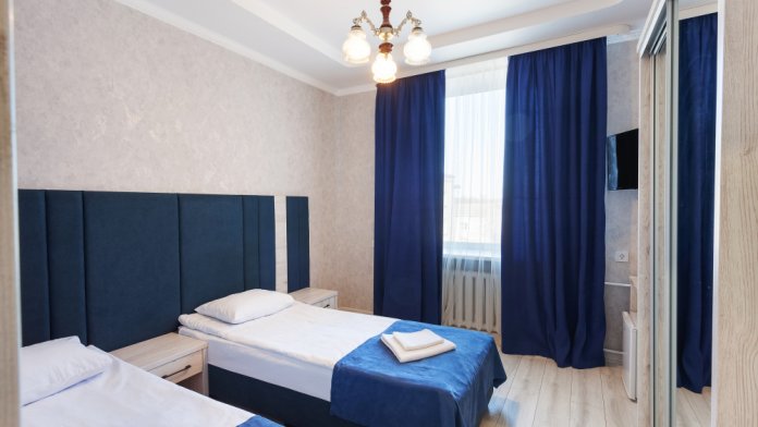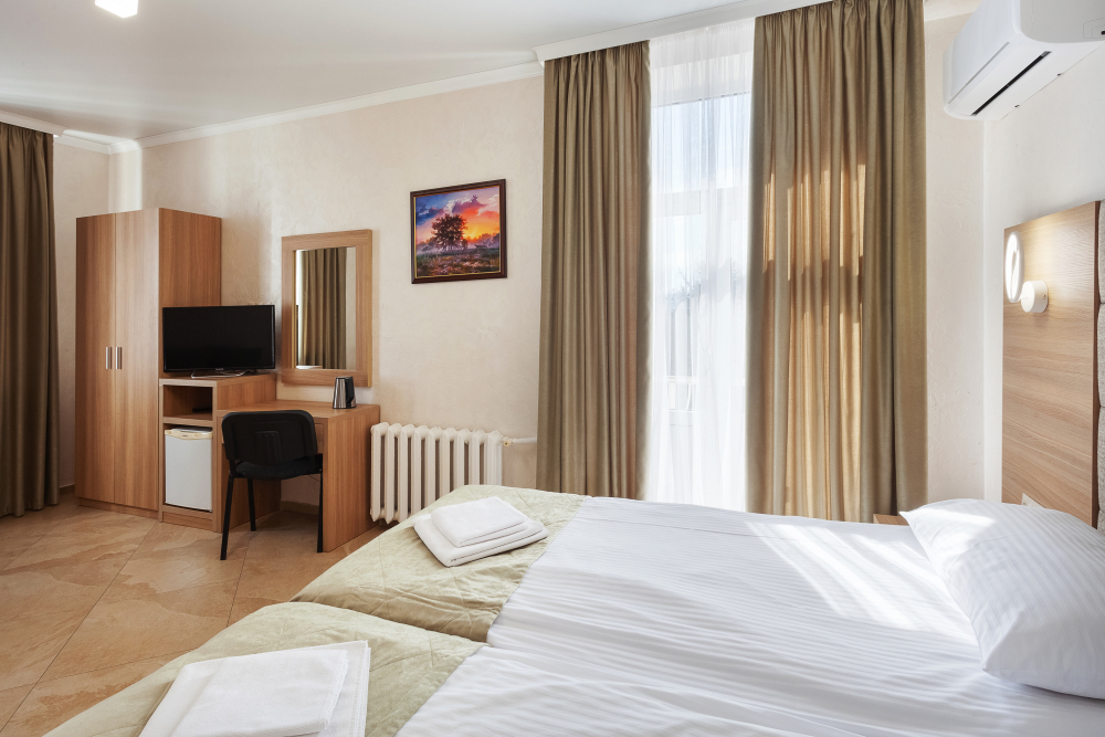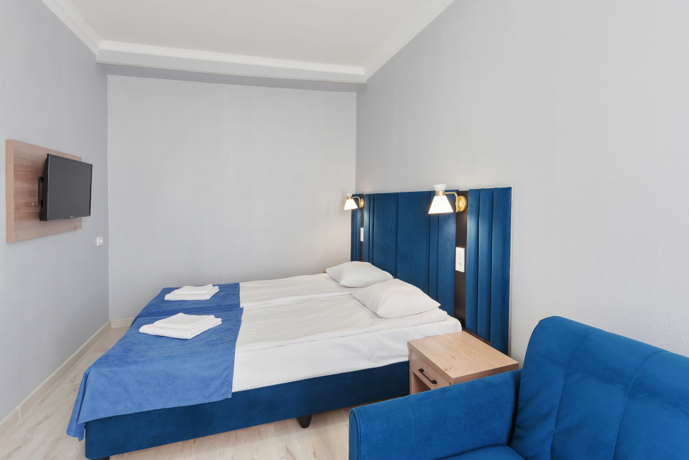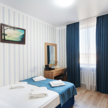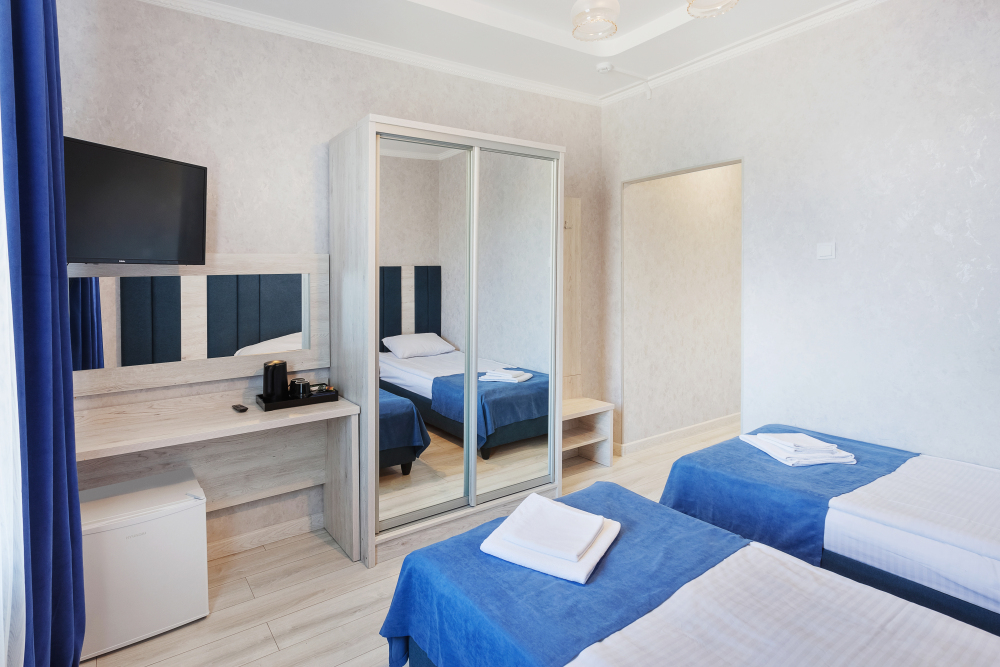 Стандартный трёхместный номер с двумя односпальными кроватями и раскладным диваном. В номере есть всё необходимое для комфортного проживания: телевизор, мини-холодильник, электрический чайник, фен, зеркало, место для хранения одежды и небольшой набор посуды.