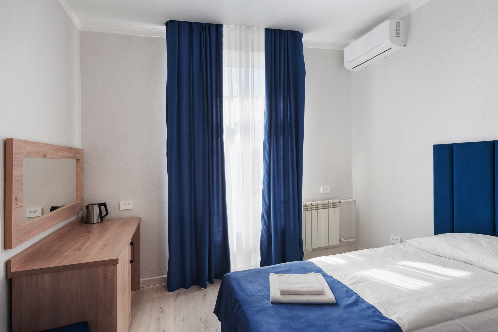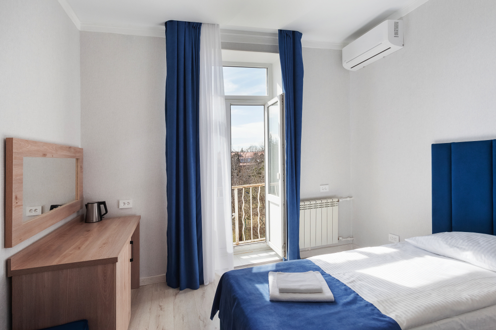 Двухместный номер комфорт с одной двуспальной кроватью. В номере есть всё необходимое для проживания: кондиционер, телевизор, мини-холодильник, электрический чайник, фен, зеркало, место для хранения одежды и набор посуды. Собственная ванная комната оборудована душем. Предоставляются туалетные принадлежности, халаты и тапочки. Для общего пользования гостей — кулер с горячей и холодной водой, микроволновка, утюг и гладильная доска.