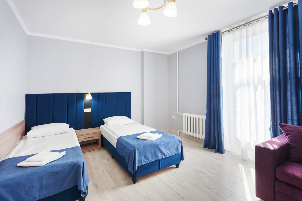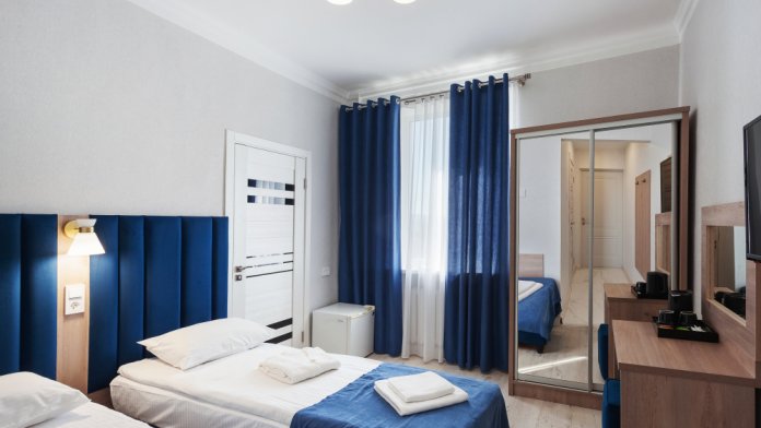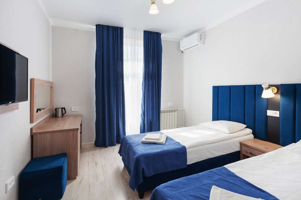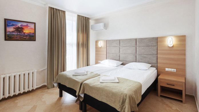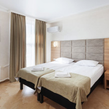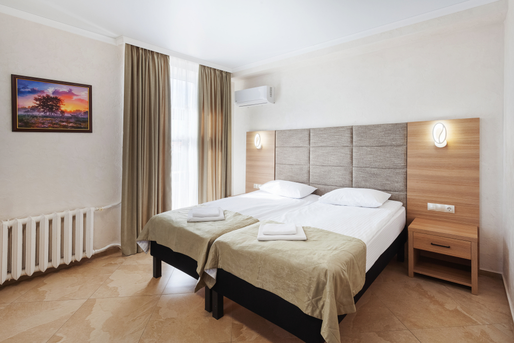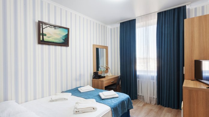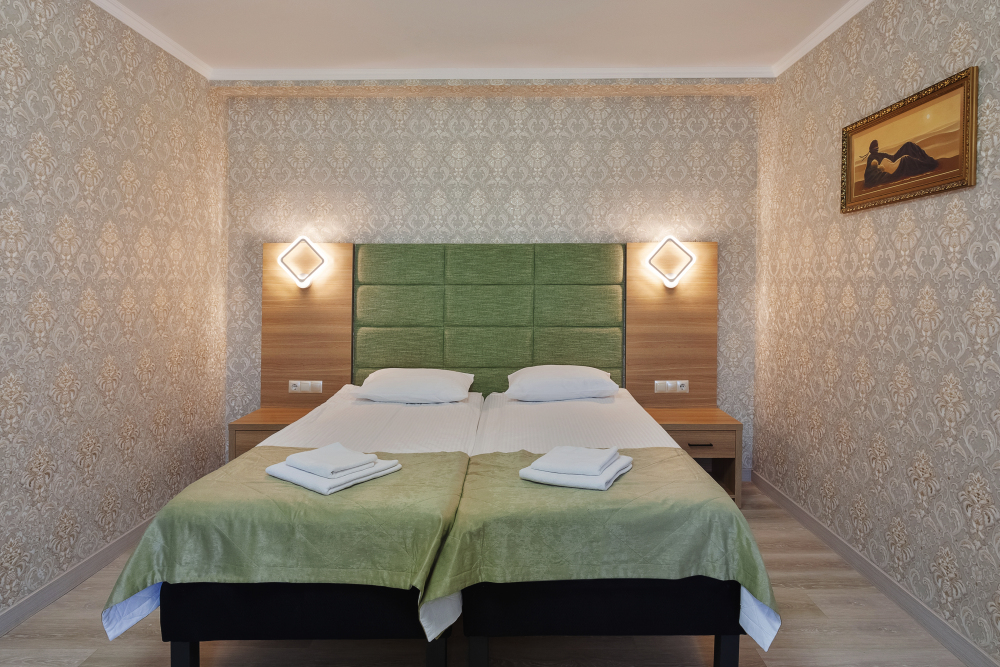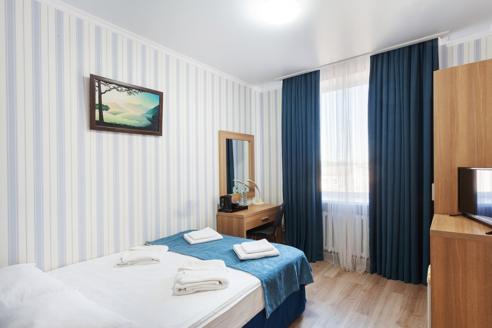 Стандартный двухместный номер с двумя односпальными кроватями. В номере есть всё необходимое для комфортного проживания: телевизор, кондиционер, мини-холодильник, электрический чайник, фен, зеркало, место для хранения одежды и набор посуды. Собственная ванная комната оборудована душем. Предоставляются туалетные принадлежности, халаты и тапочки. Для общего пользования гостей — WI-FI, кулер с горячей и холодной водой, микроволновка, утюг и гладильная доска.