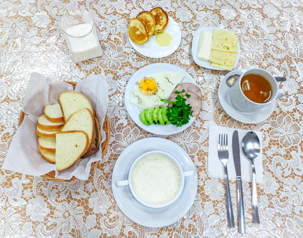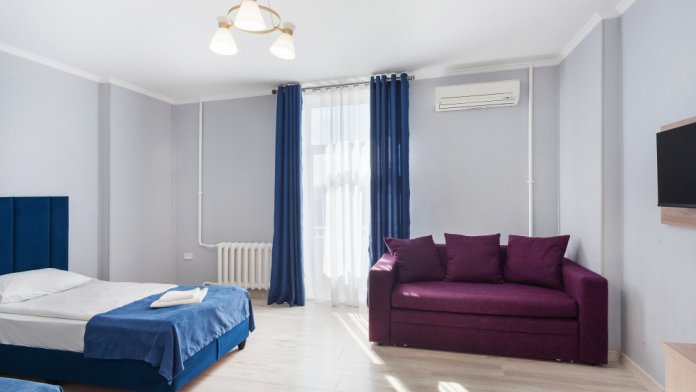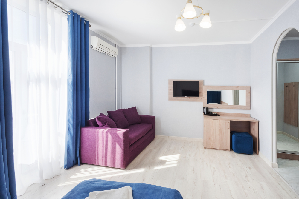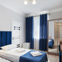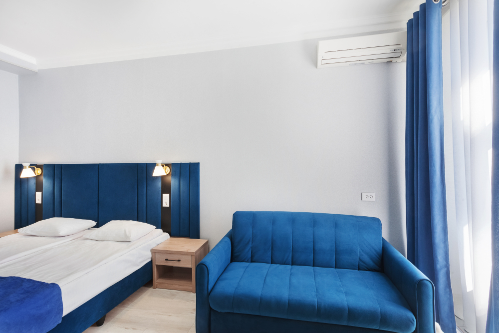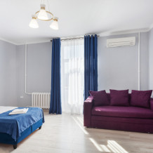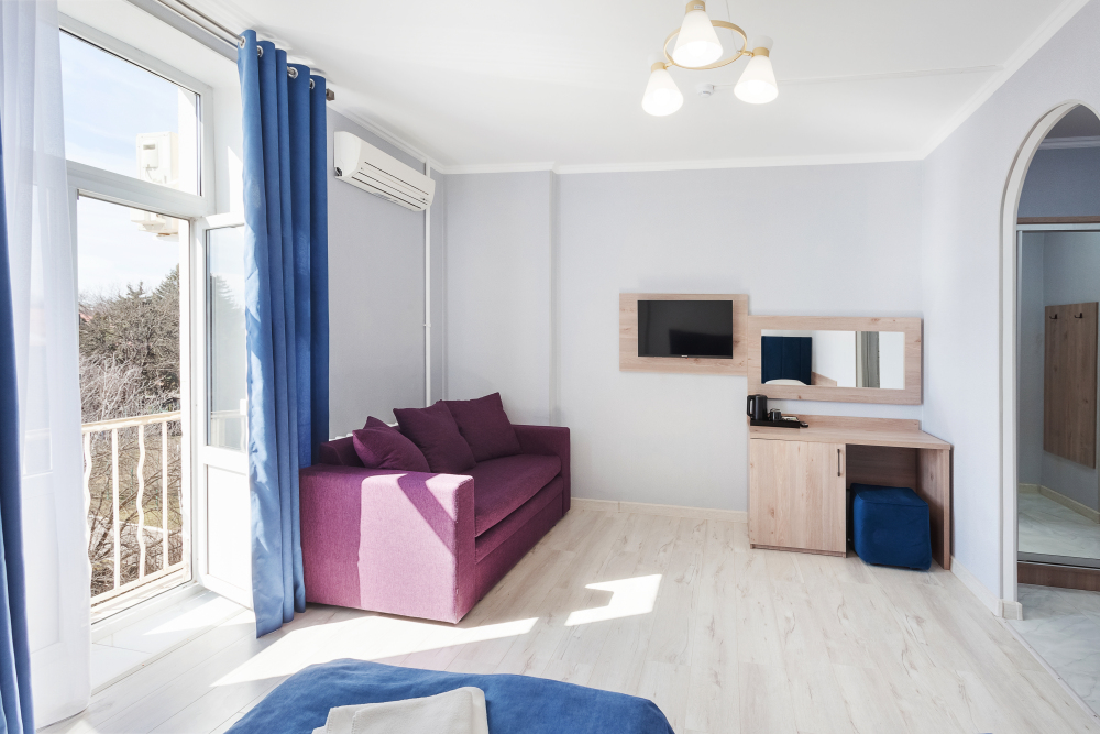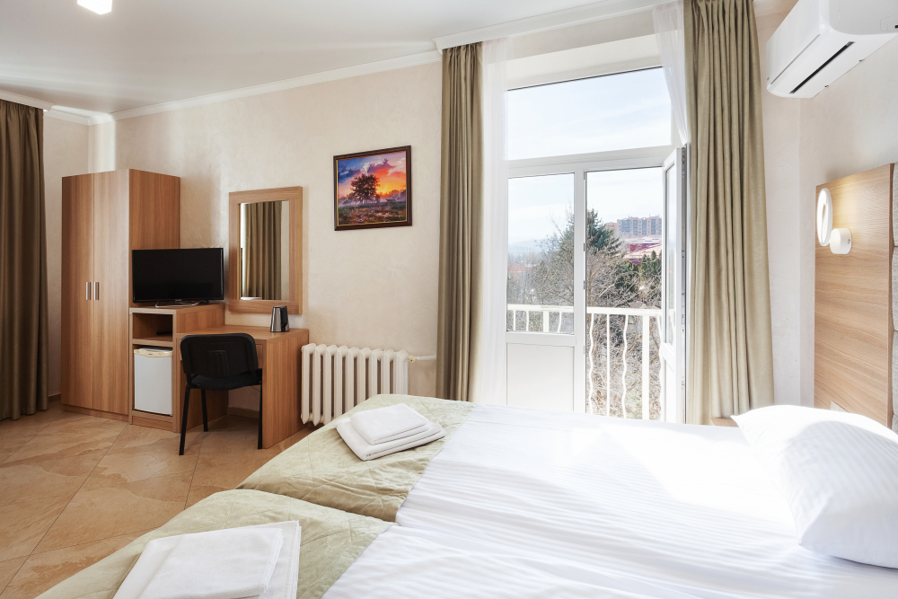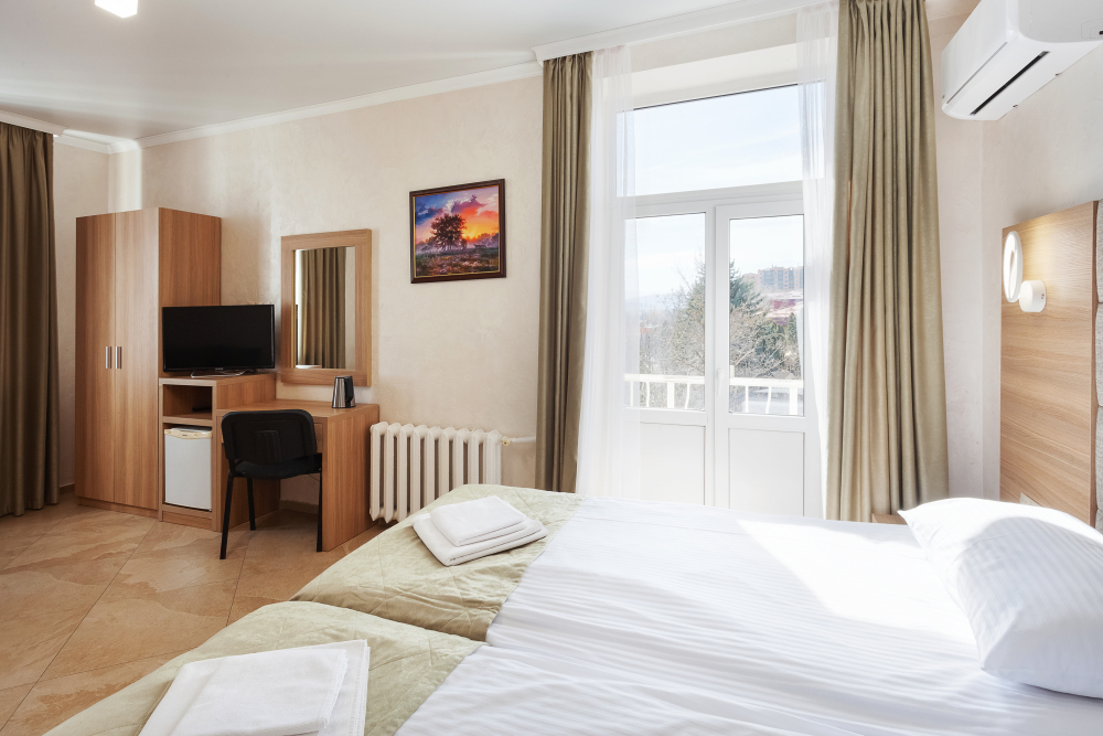 Улучшенный двухместный номер с двумя односпальными кроватями и раскладным диваном. В номере есть всё необходимое для комфортного проживания: телевизор, мини-холодильник, электрический чайник, фен, зеркало, небольшой балкон, место для хранения одежды и набор посуды.