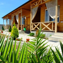 Одноэтажное строение выполнено в стиле коттеджных номеров с отдельными входами. Деревянные уютные домики обустроенными навесами и благоустроенными верандами.