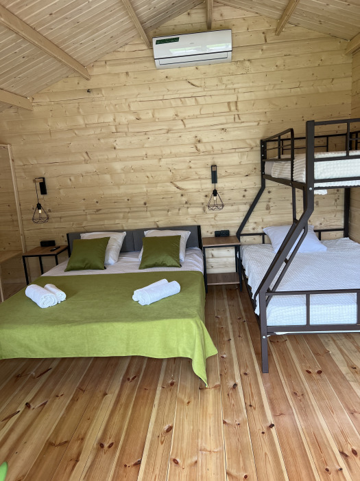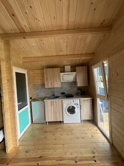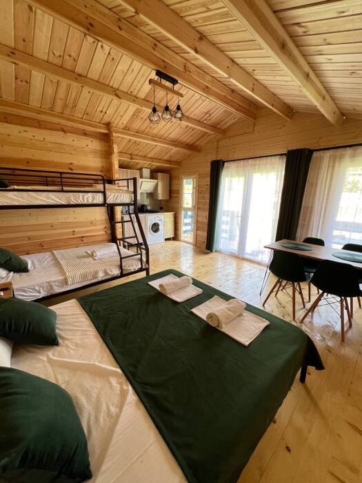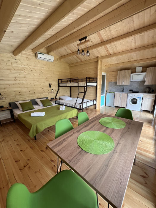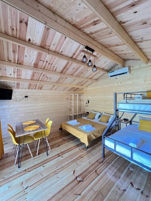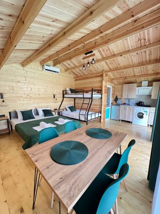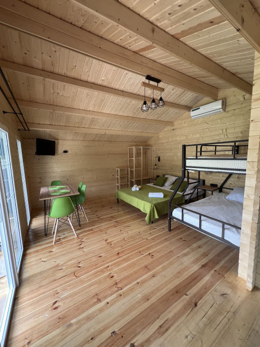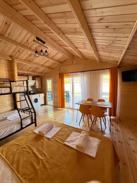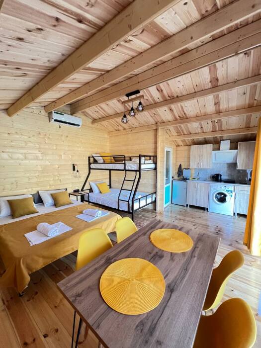 Роскошный домик с дизайнерской отделкой экологичным материалами площадью 30кв.м. с собственной ванной комнатой, двуспальной кроватью, большой двухъярусной железной кроватью (нижнее спальное место 1.2м в ширину, верхнее 90 см в ширину, длина 1.9м) , Smart TV, сплит-системой, полностью оборудованной кухней, стиральной машиной, обеденным столом и стульями.