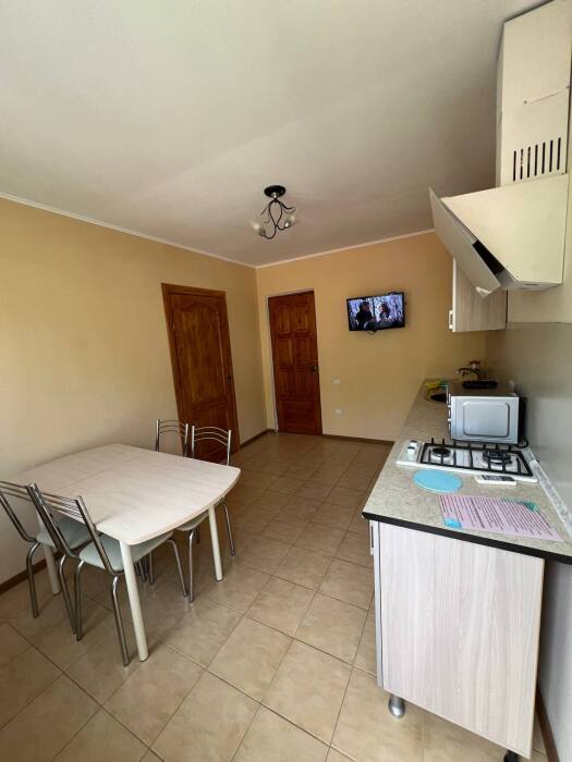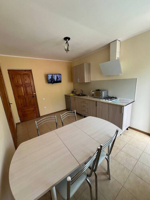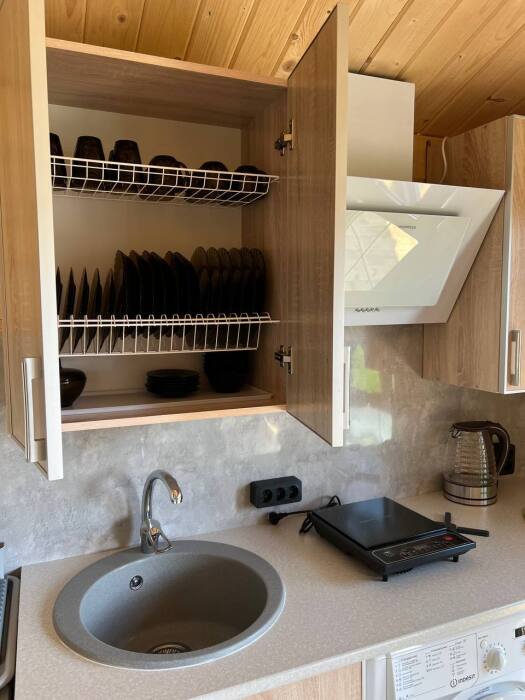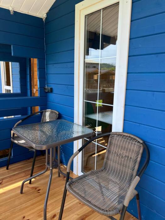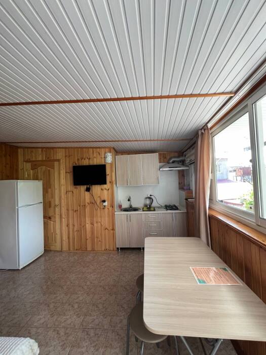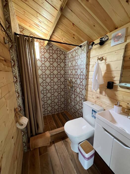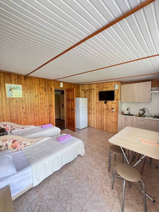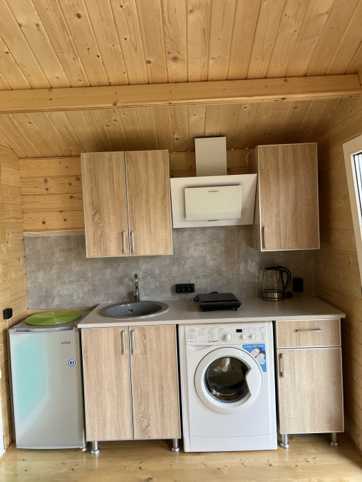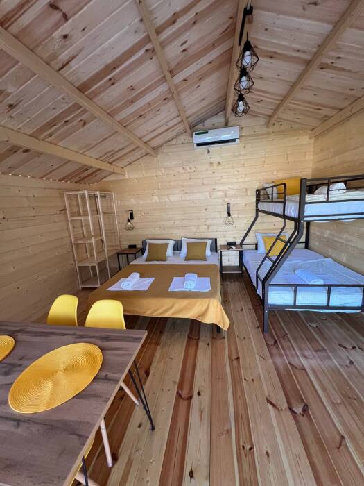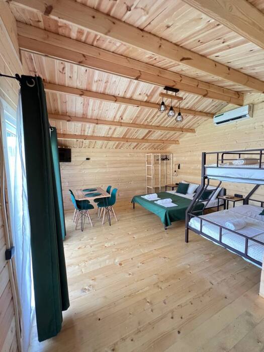 Роскошный домик с дизайнерской отделкой экологичным материалами площадью 30кв.м. с собственной ванной комнатой, двуспальной кроватью, большой двухъярусной железной кроватью (нижнее спальное место 1.2м в ширину, верхнее 90 см в ширину, длина 1.9м) , Smart TV, сплит-системой, полностью оборудованной кухней, стиральной машиной, обеденным столом и стульями.
