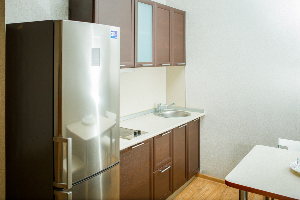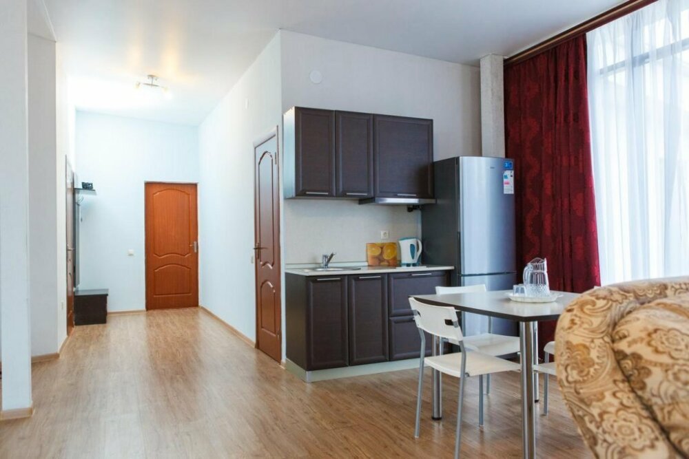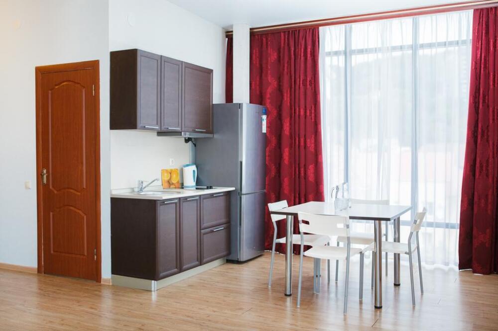 Номер оснащён комнатой с двуспальной кроватью и диваном-кроватью, кухонной зоной.