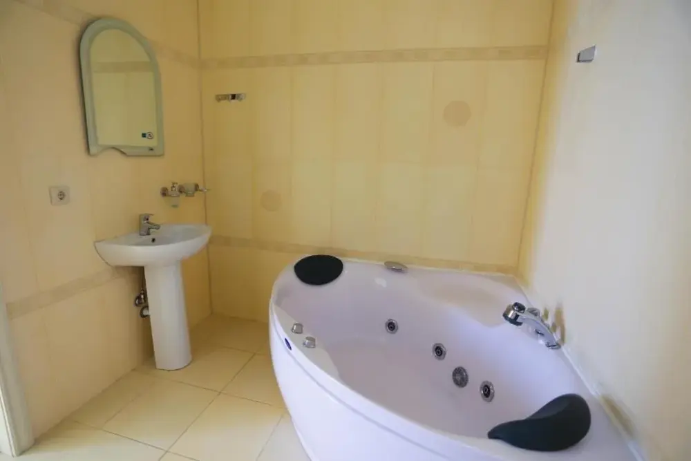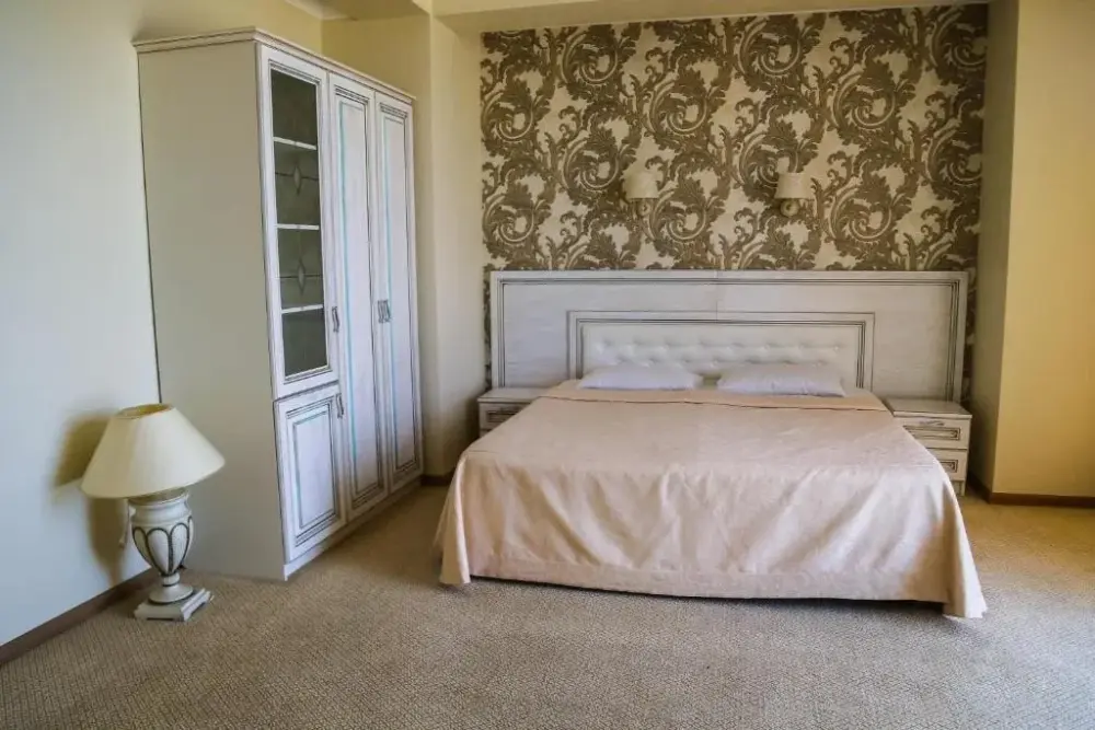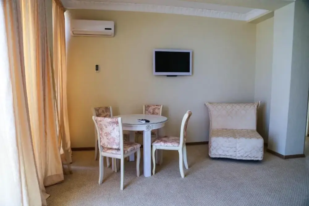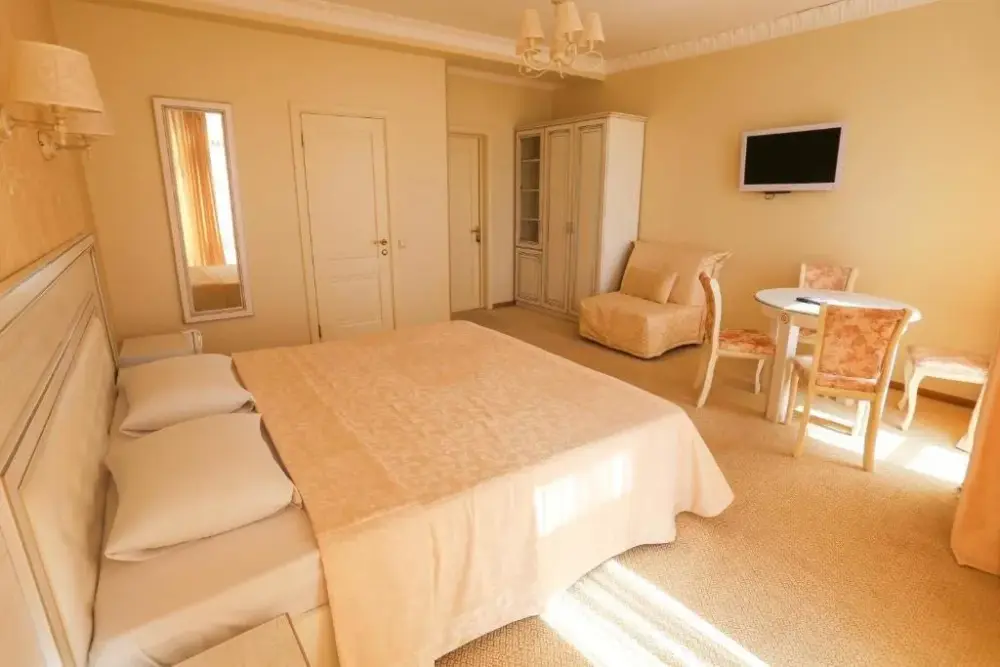 В номере: телевизор, кондиционер, ванна джакузи, туалет, двухспальная кровать, мягкая мебель, холодильник, гардероб. Дополнительное место - евро раскладушка.