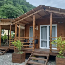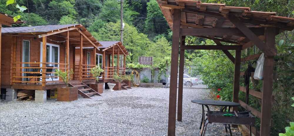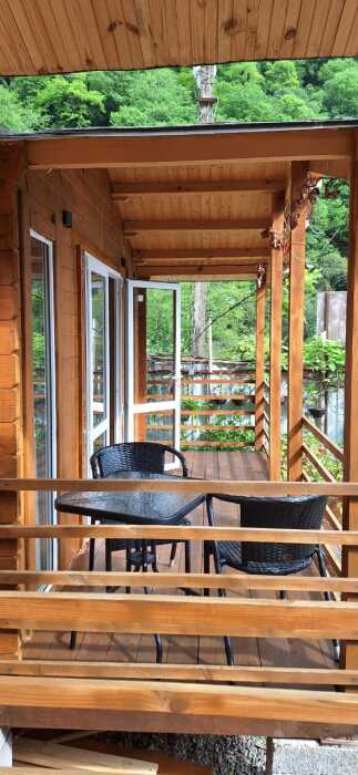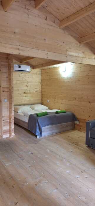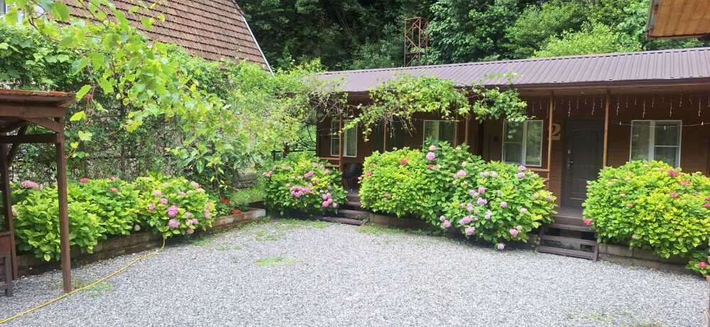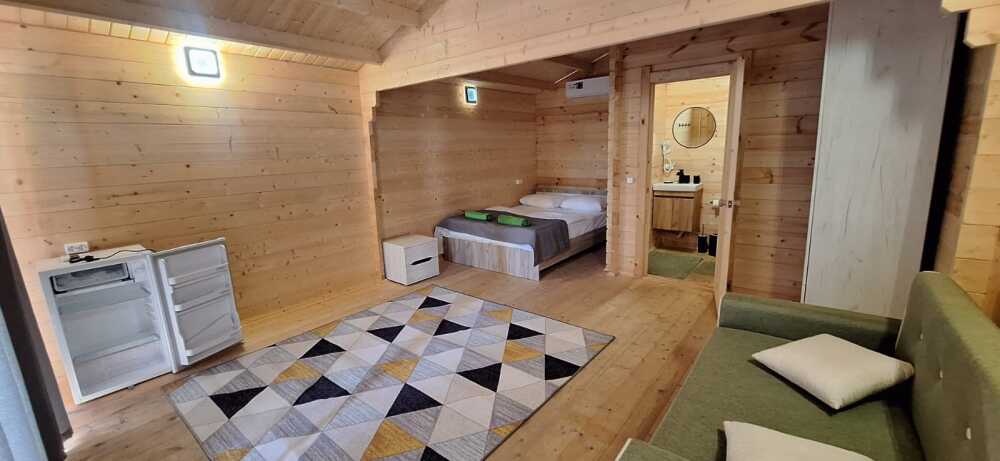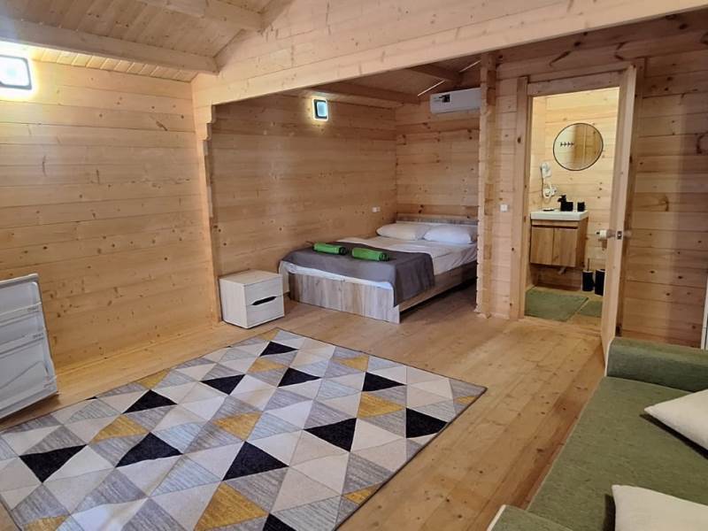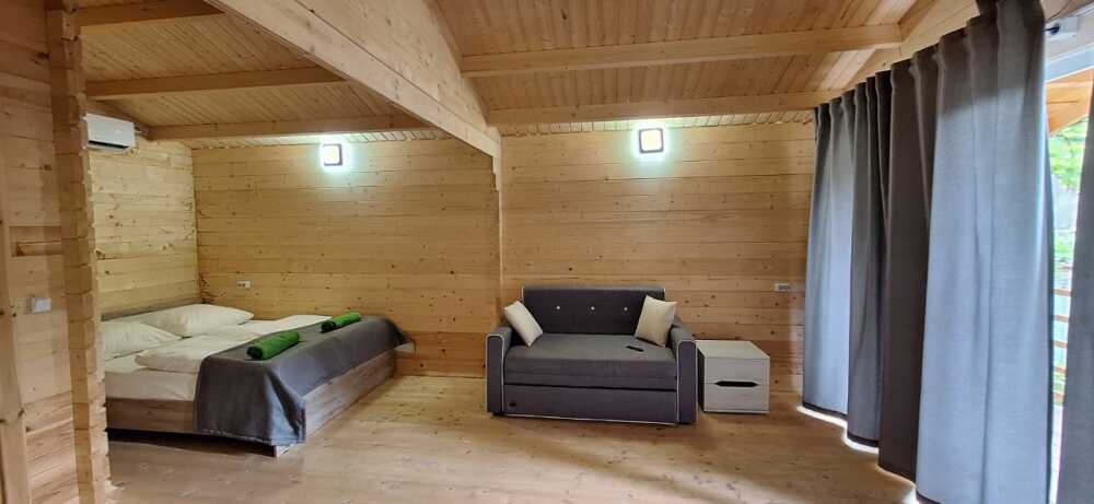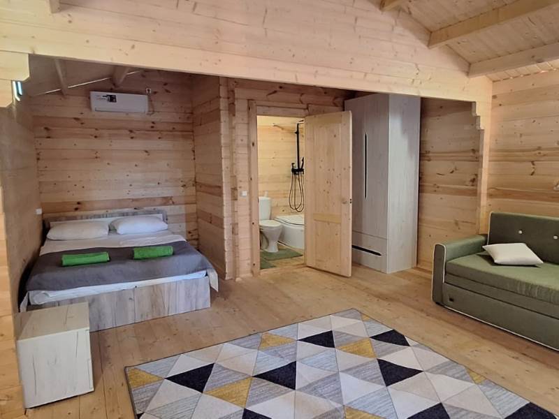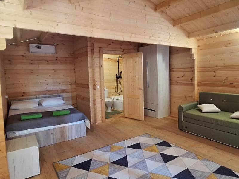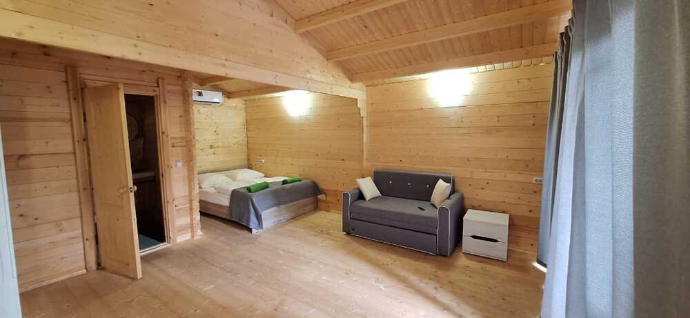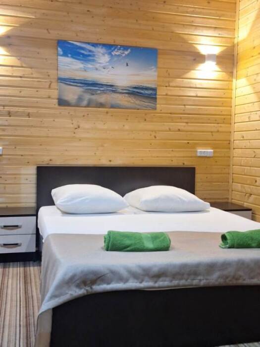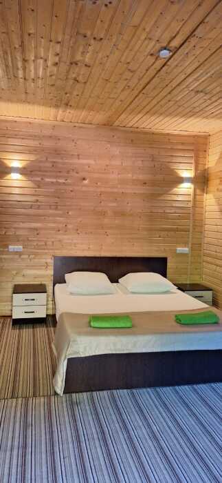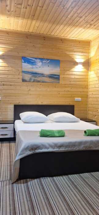 Сдаются деревянные коттеджи со всеми необходимыми условиями, на территории стоят 5 коттеджей и одна общая кухня, есть зона барбекю. В номерах: одна двуспальная кровать, односпальная, есть детские кроватки, диваны и доп места. ТВ, холодильник, кондиционер, фен, чайная станция. Горячая, холодная вода. Есть домики, где установлены двуспальная и односпальная кровати, двуспальная кровать и диван.