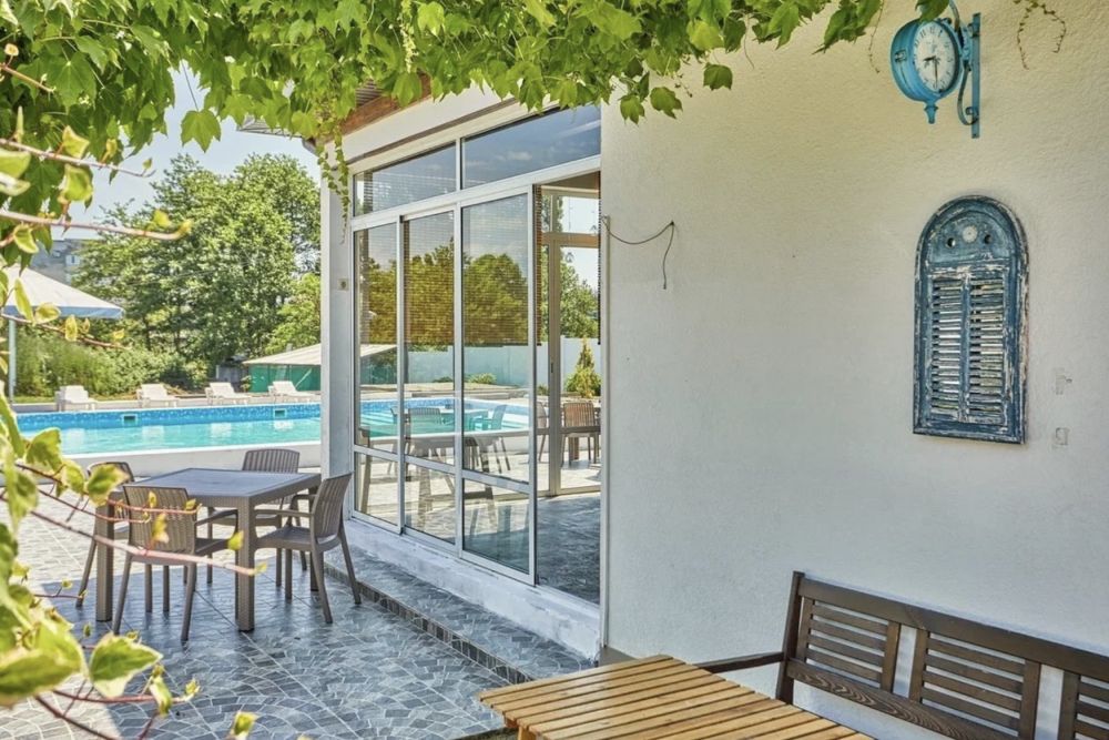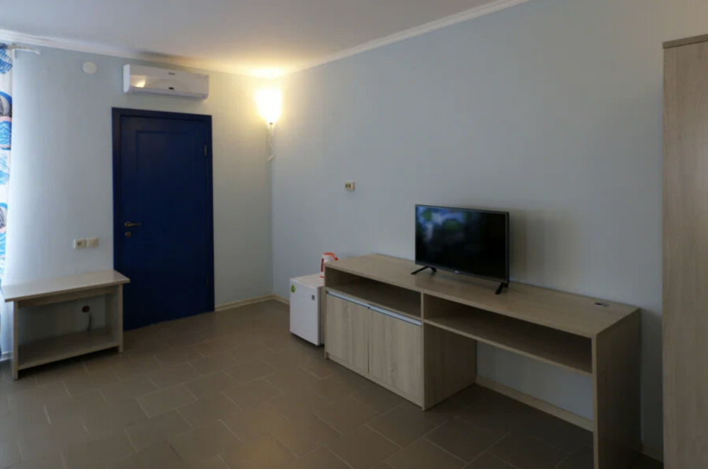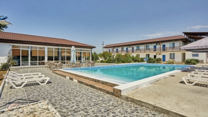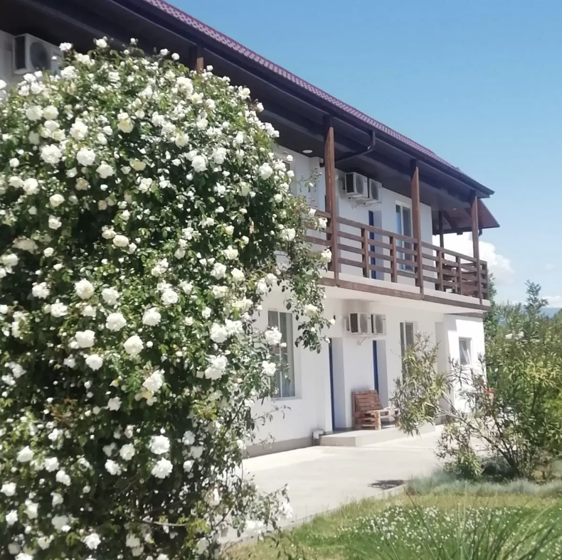 Отель «Серебряный пляж» напоминает кусочек Греции. Белый дом с синими дверцами, который утопает в зелени. Отель небольшой, уютный, с теплым бассейном в любое время года.