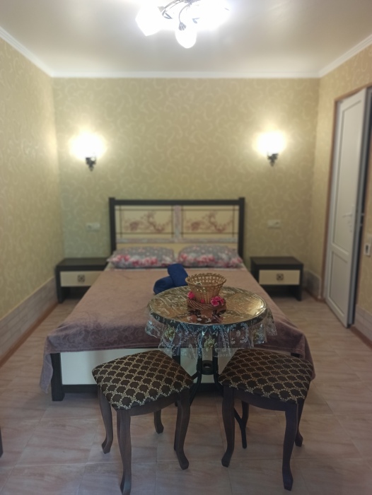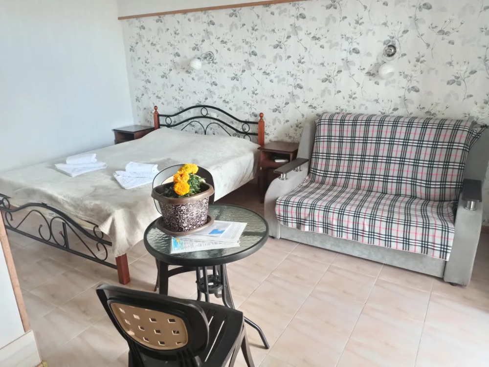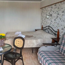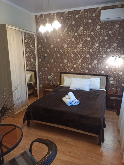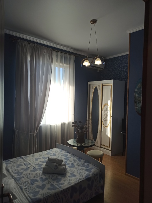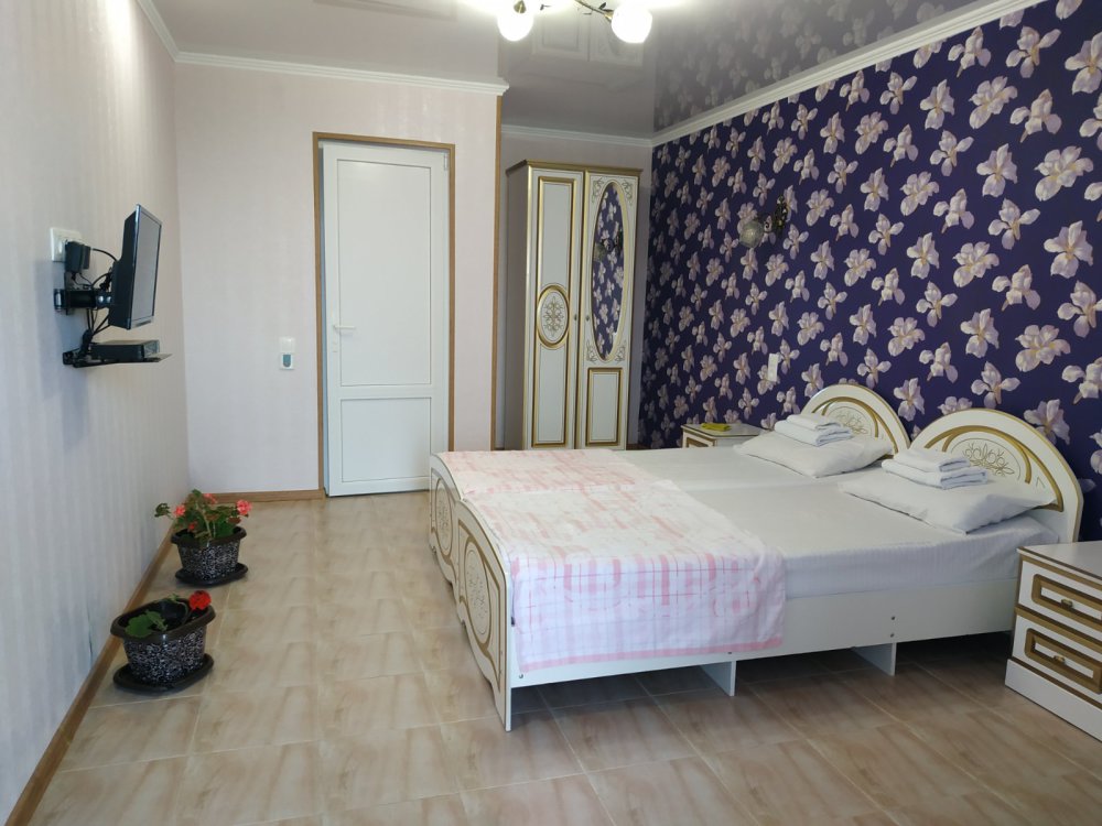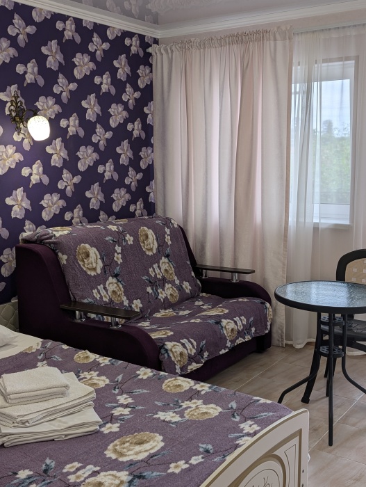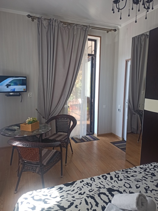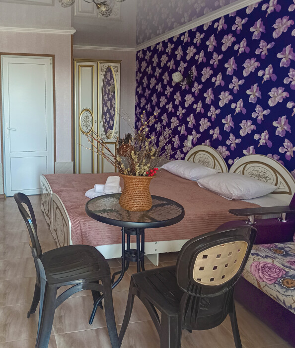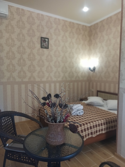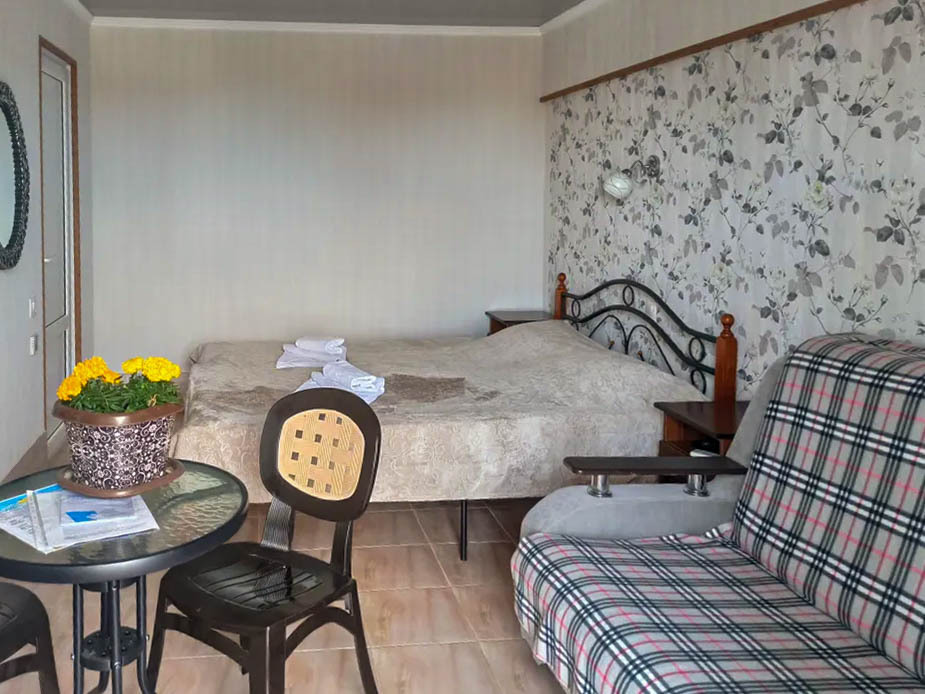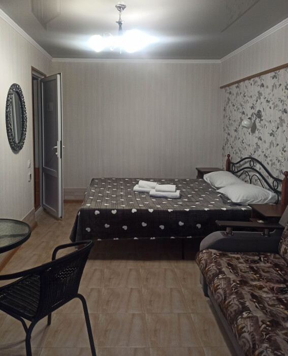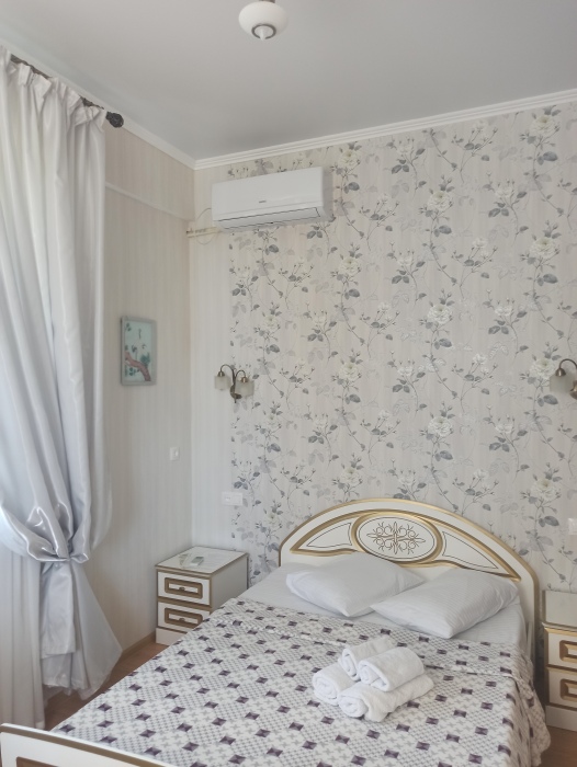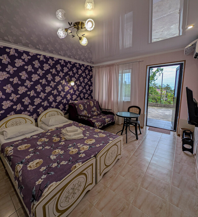 Семейный номер на первом этаже с двуспальной кроватью и раскладным двуспальным диваном, с выходом на террасу внутренний двор с садом и видом на море В номере: двуспальная кровать, диван-кровать, шкаф, прикроватные тумбочки, вешалка, зеркало, столик. Удобства: сплит-система, телевизор, спутниковое ТВ, интернет, фен.