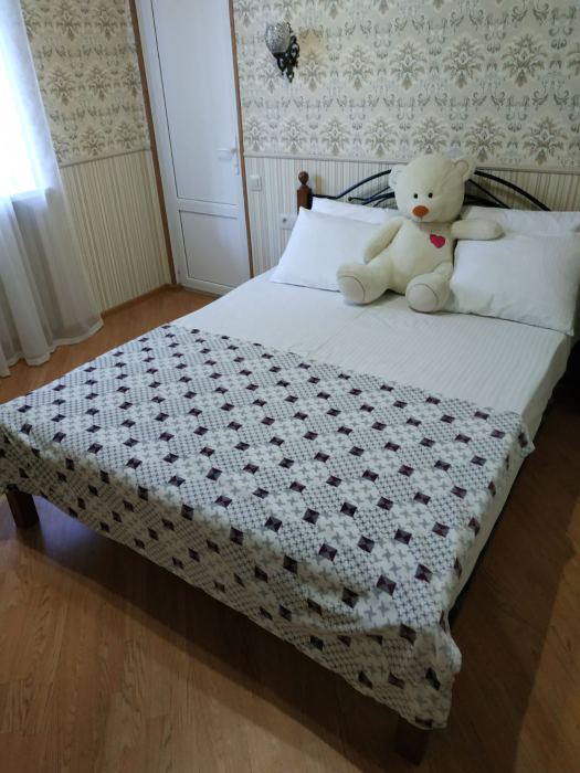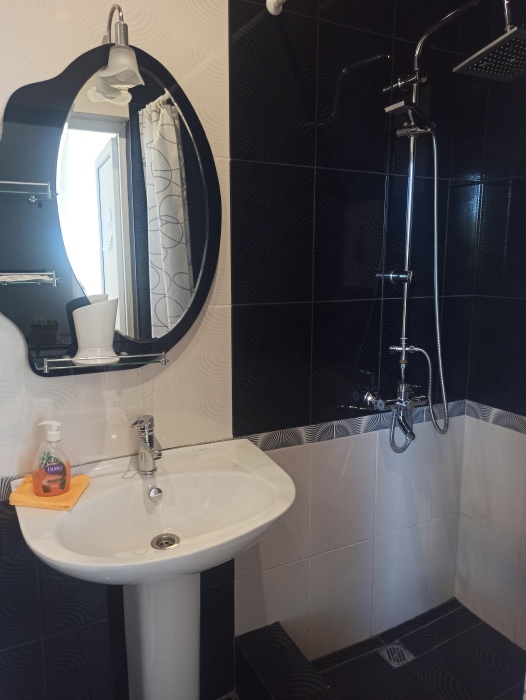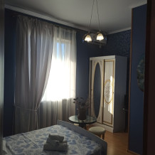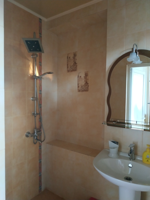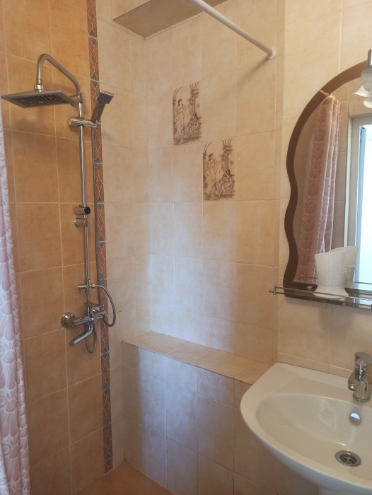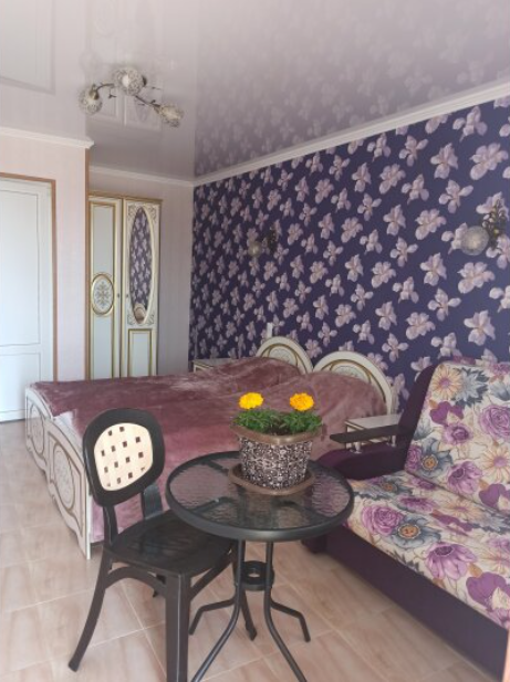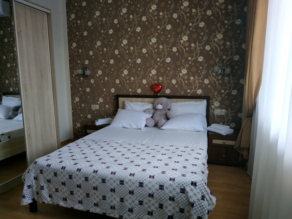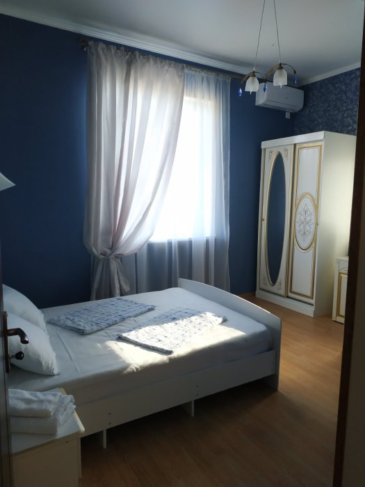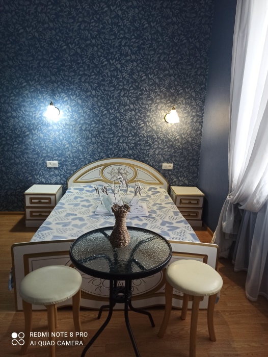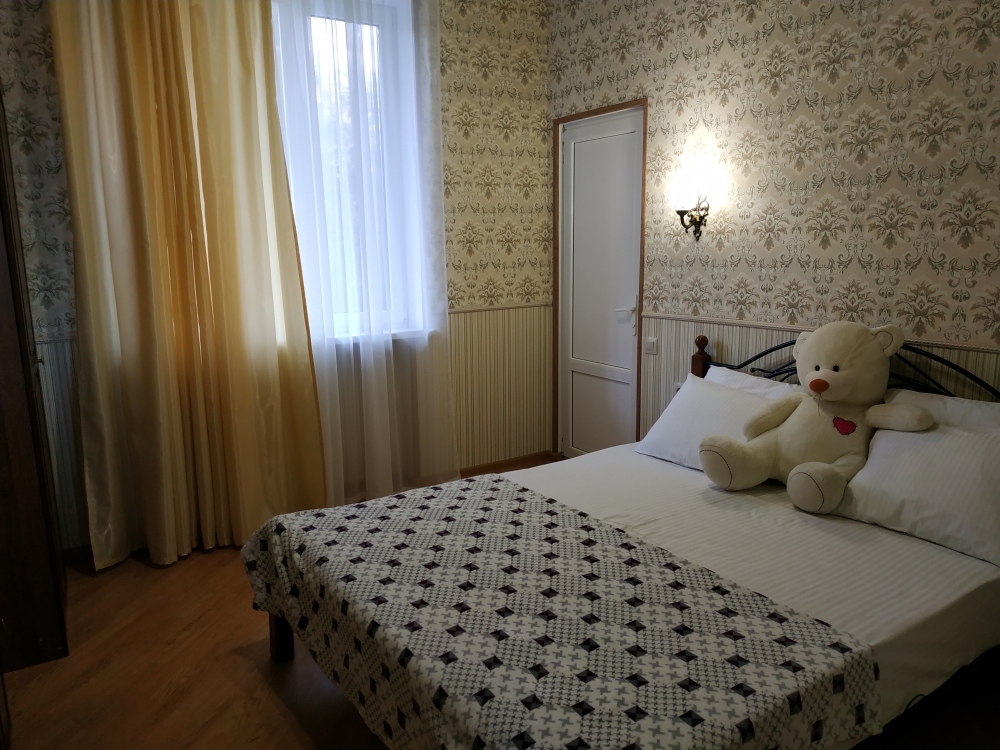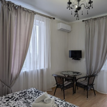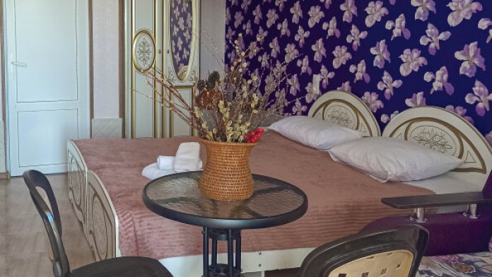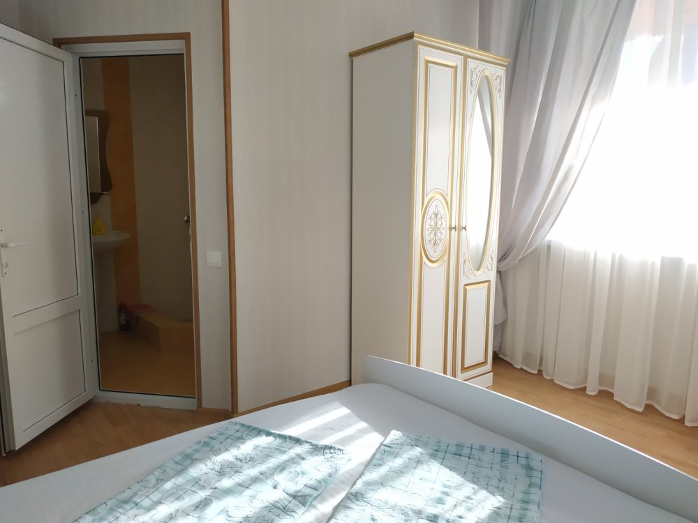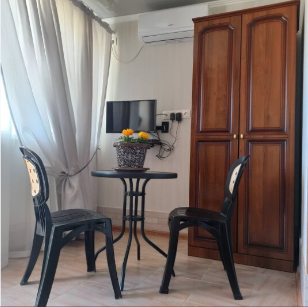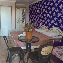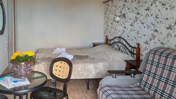 Семейный номер на первом этаже с двуспальной кроватью и раскладным двуспальным диваном, с выходом на террасу внутренний двор с садом и видом на море В номере: двуспальная кровать, диван-кровать, шкаф, прикроватные тумбочки, вешалка, зеркало, столик. Удобства: сплит-система, телевизор, спутниковое ТВ, интернет, фен.