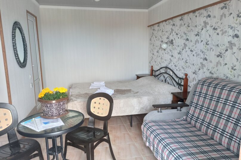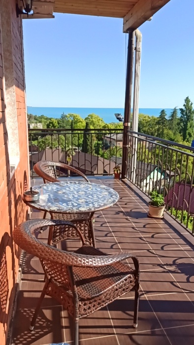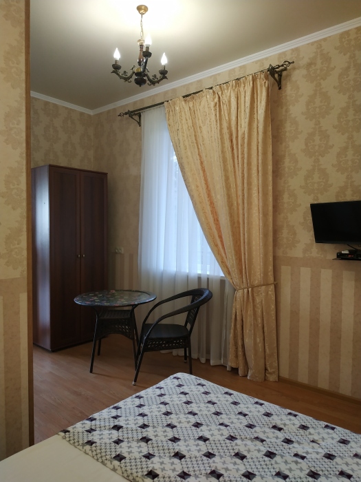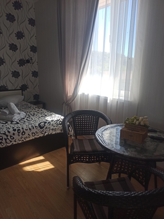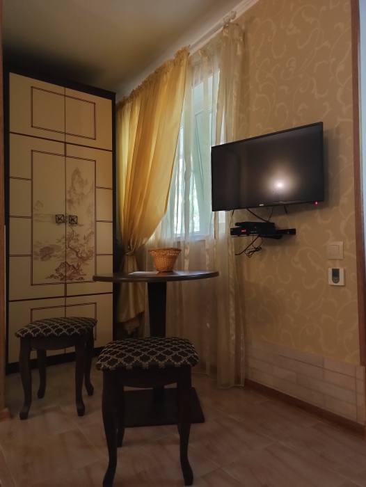 Полулюкс на втором этаже с двуспальной кроватью и раскладным диваном, с видом на море и выходом на общий балкон-терассу с видом на море, горы и внутренний сад В номере: двуспальная кровать, диван-кровать, шкаф, прикроватные тумбочки, вешалка, зеркало, столик. Удобства: сплит-система, телевизор, спутниковое ТВ, интернет, фен.