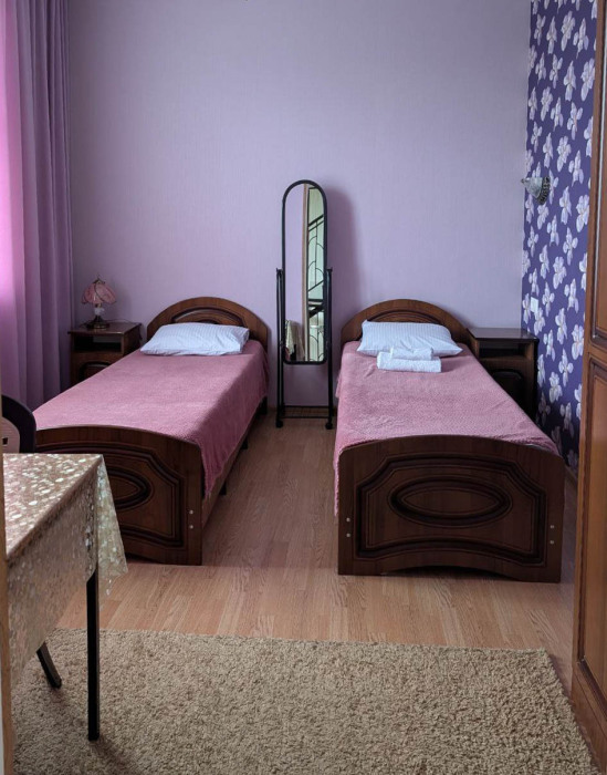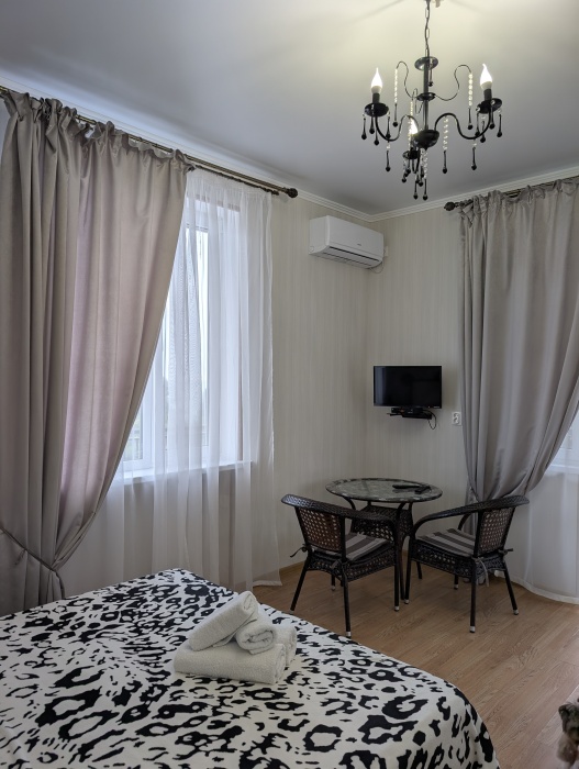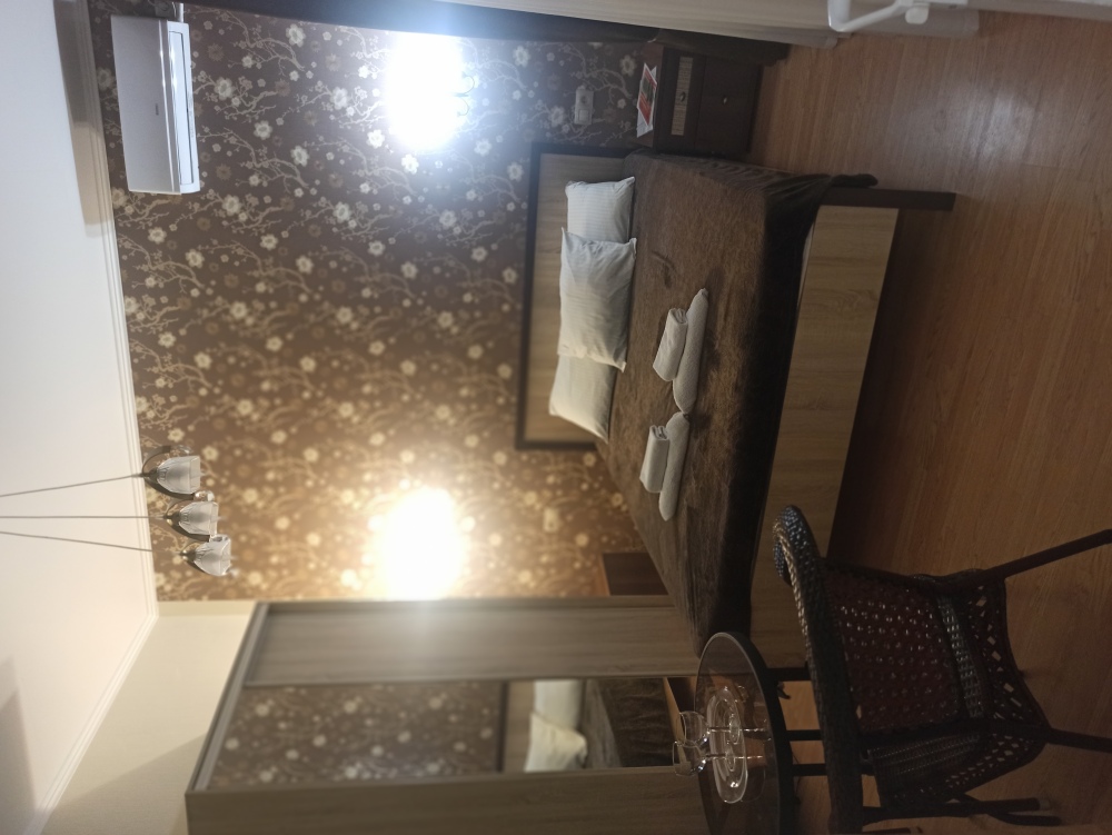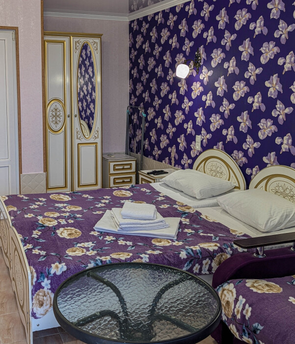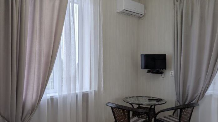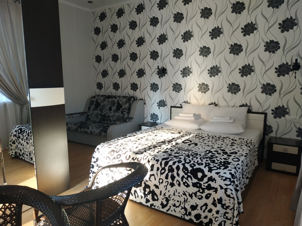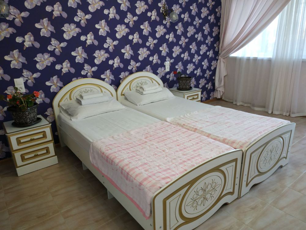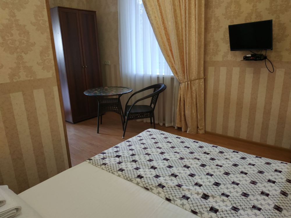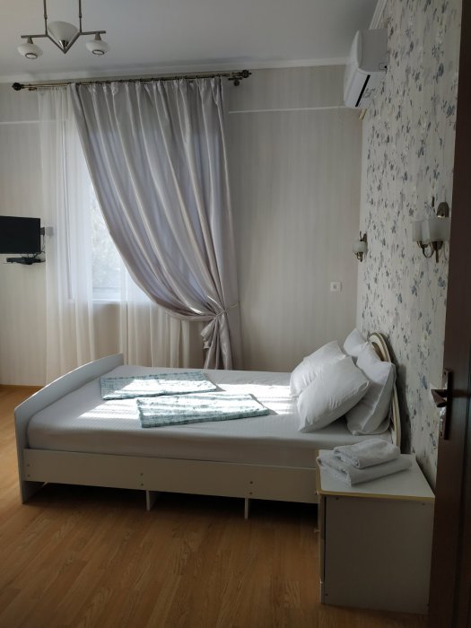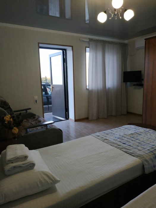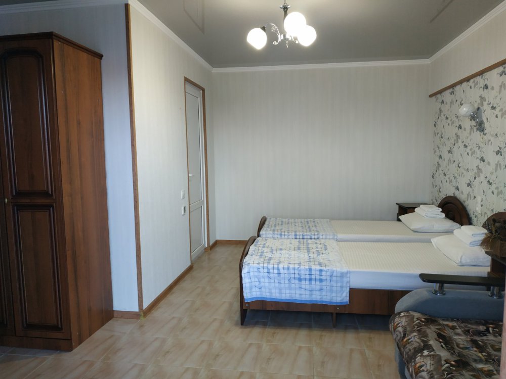 В номере: две односпальные кровати, диван-кровать, шкаф, прикроватные тумбочки, вешалка, зеркало, столик. Удобства: сплит-система, телевизор, спутниковое ТВ, интернет, фен.