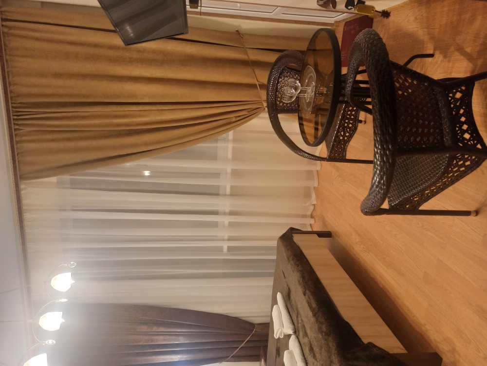 Люкс на втором этаже с видом на море, с двуспальной кроватью в спальне и раскладным диваном в гостиной. Имеет выход на общий балкон-тераасу с видом на море, горы и внутренний сад