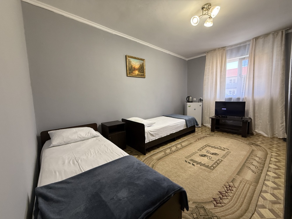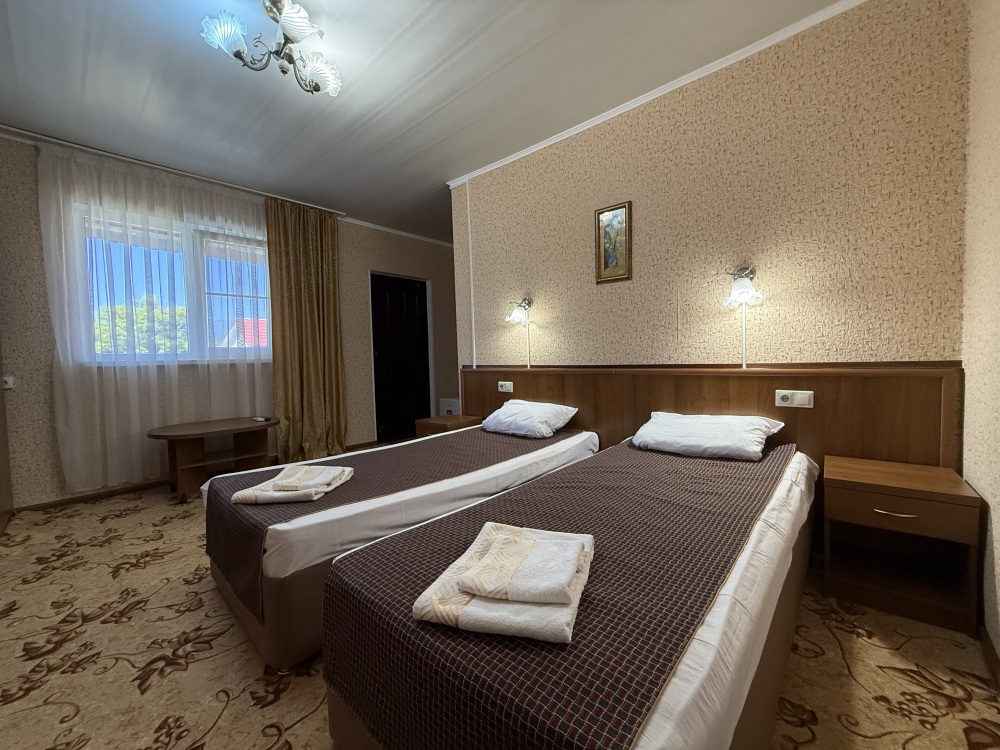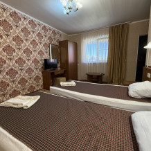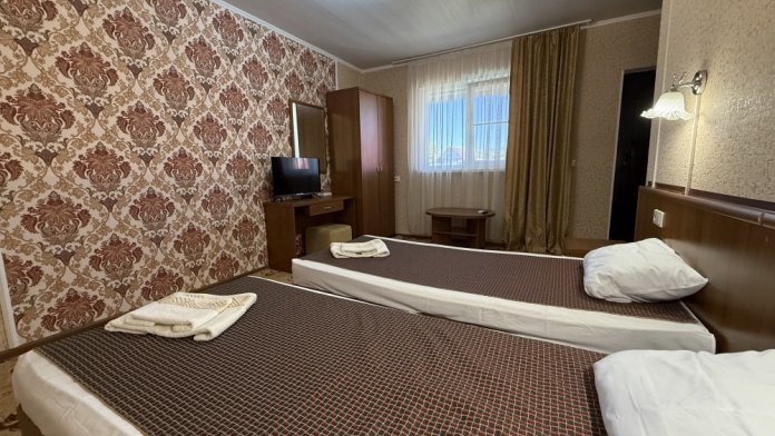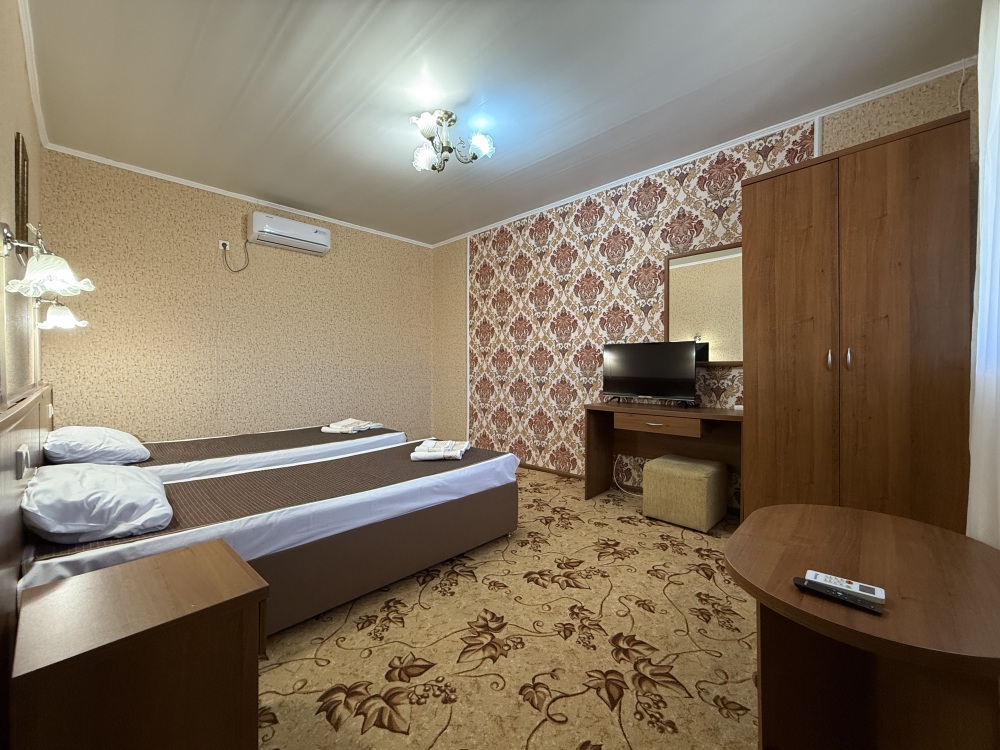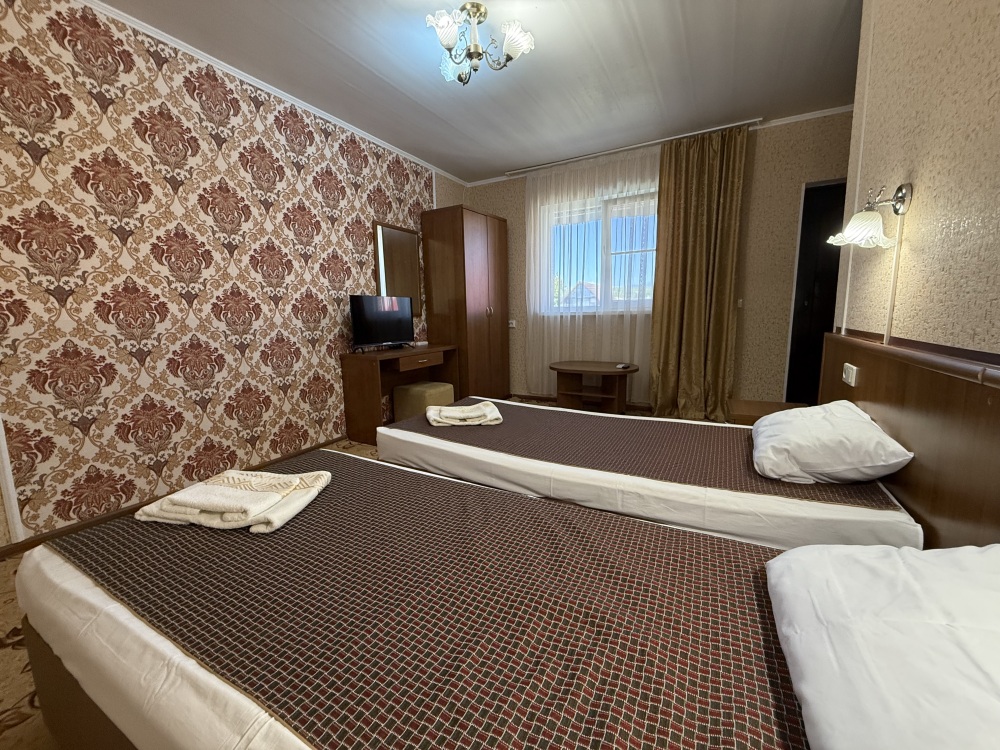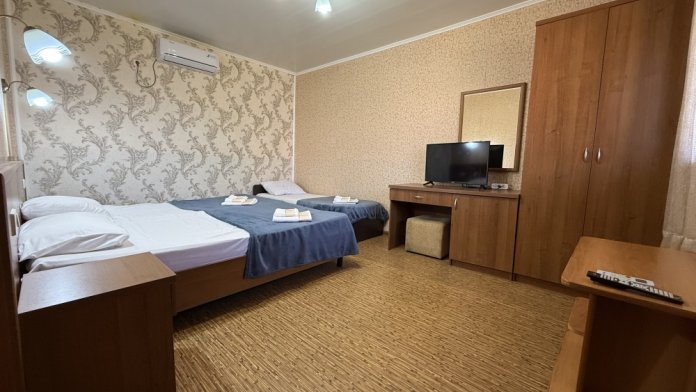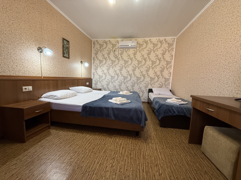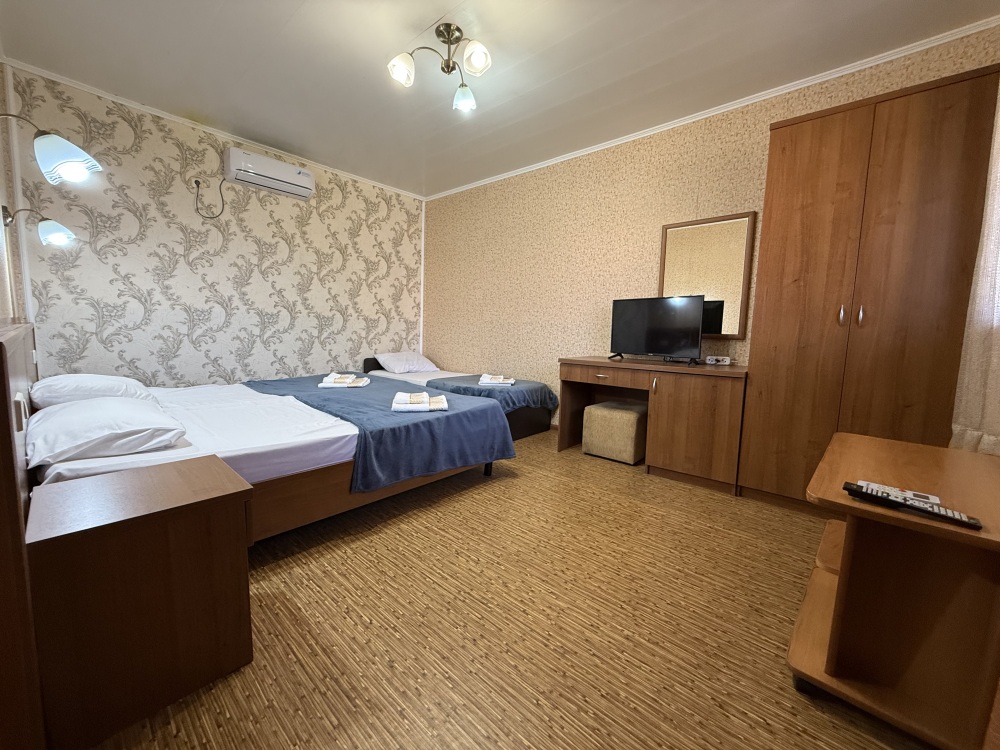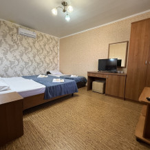 3х местный номер, возможна установка дополнительной кровати для детей до 12 лет. В номере набор необходимой мебели: шкаф для одежды, прикроватные тумбочки, стол, стул, пуфик, зеркала, холодильник, телевизор, кондиционер.