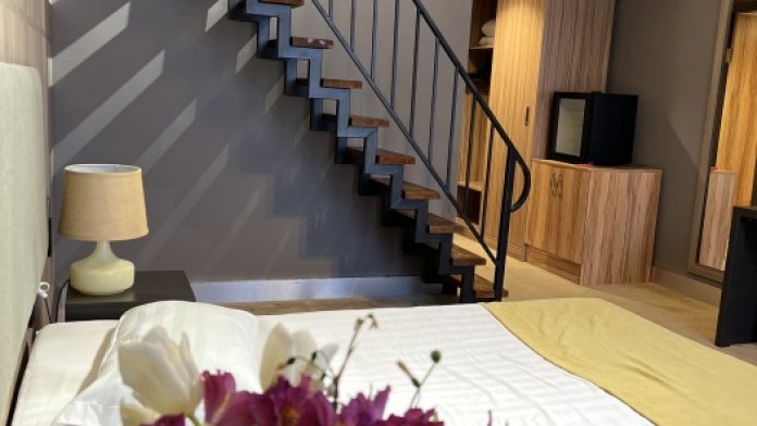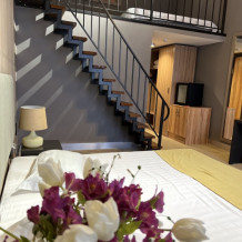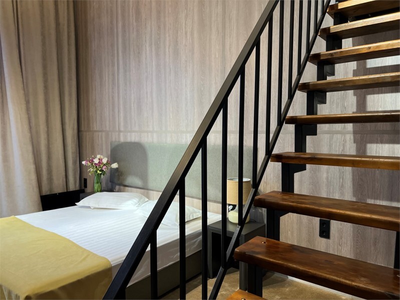 Номер в два этажа с высотой потолков 4,2 метра, площадью 30 м2 по периметру и антресолью площадью 5 м2 подойдет маленькой компании или семье из четырех-5 человек. В номере располагаются 2 двуспальные кровати, а также диван, на котором может разместиться ребенок до 12 лет. Лестница и перила антресоли построены из прочной стали и отвечают всем требованиям безопасности. Панорамные окна высотой до потолка пропускают достаточно света на оба яруса. Балкон площадью 5 метров оборудован балконной мебелью.