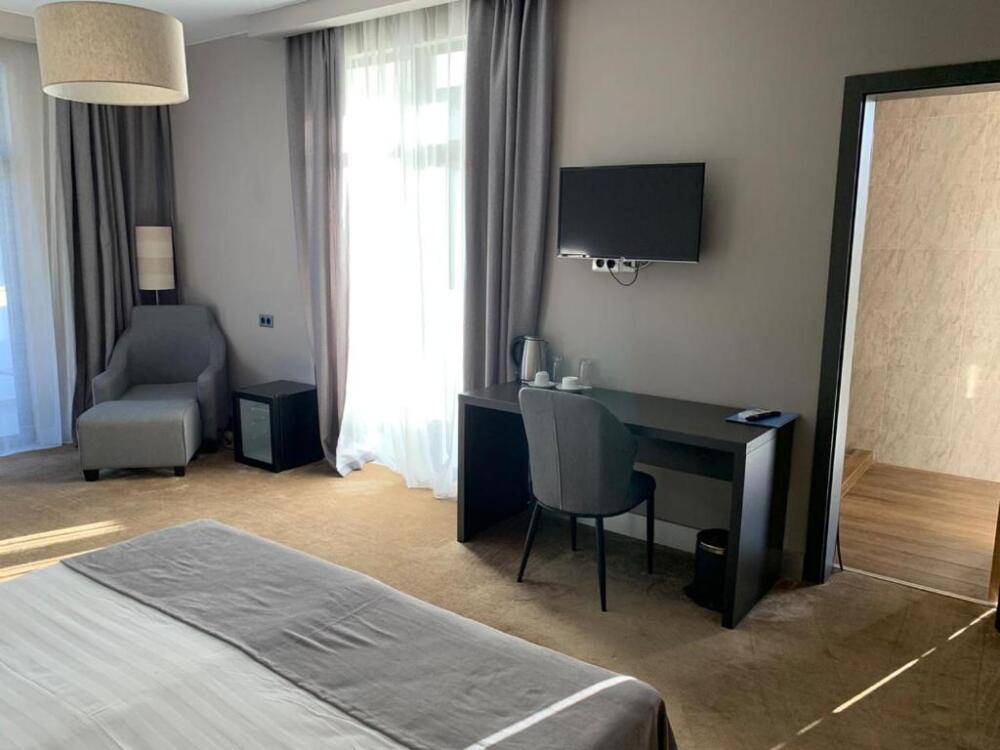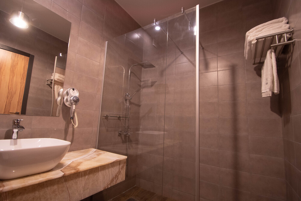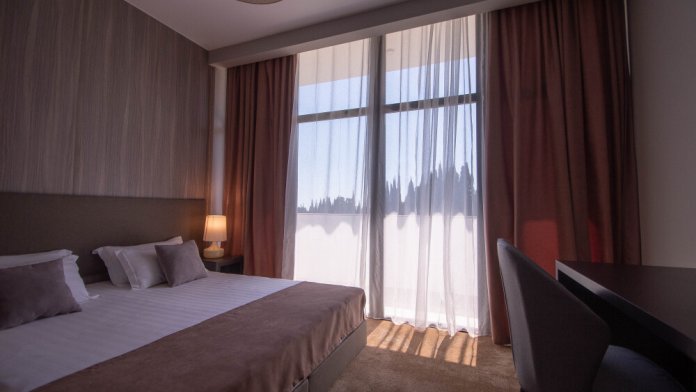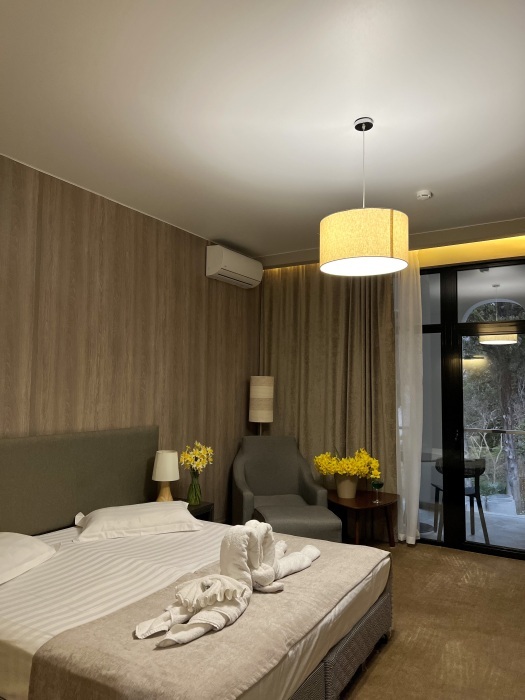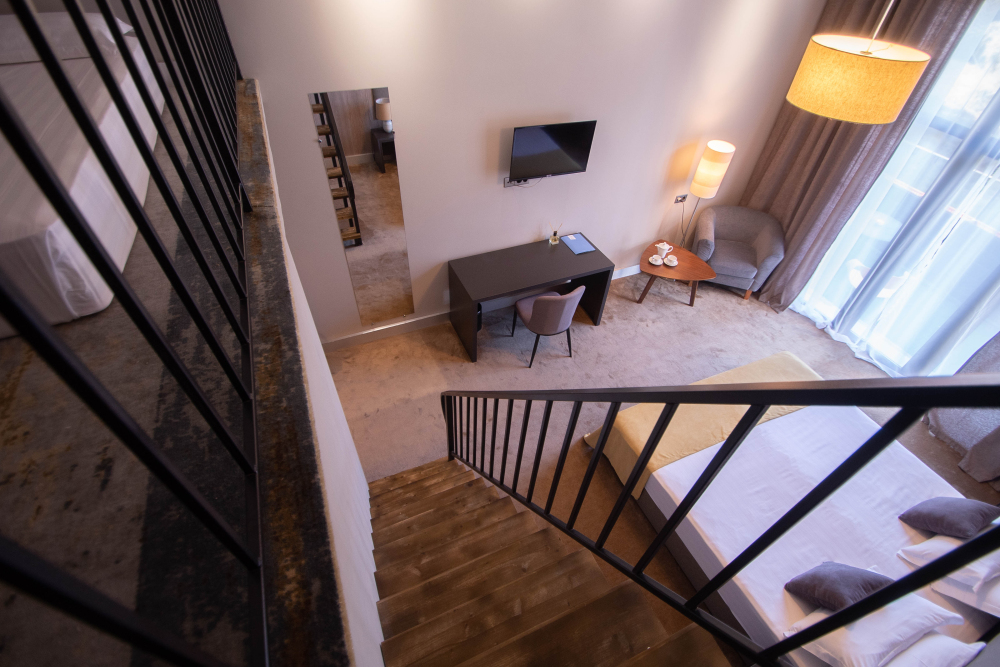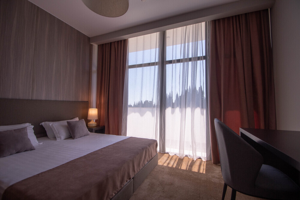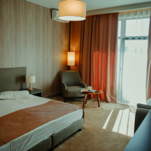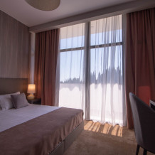 Просторный номер площадью 30 м2 с большой двухместной или двумя отдельно стоящими кроватями с матрасами класса Премиум-комфорт вмещает двух человек, с возможной дополнительной кроватью для 1 взрослого и ребенка до 12 лет на диване. В номере есть гостиный уголок с диваном и креслом, а также балкон с мебелью. Панорамные окна заливают комнату светом и открывают живописные виды на водопад, монастырь, горы или парк в зависимости от расположения номера.