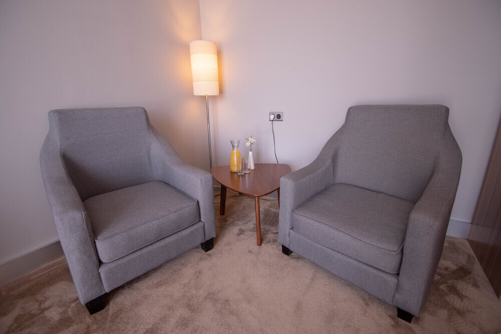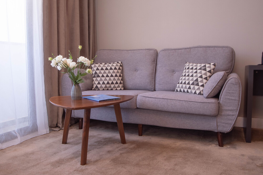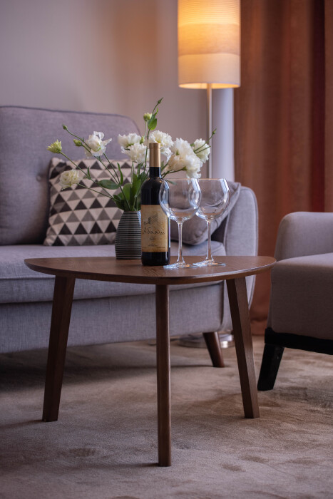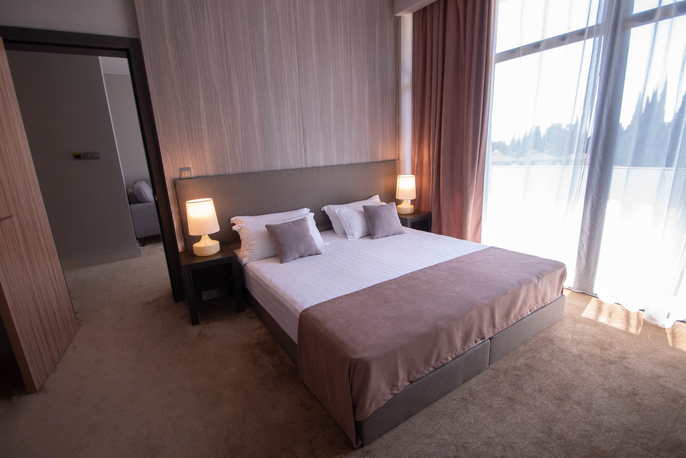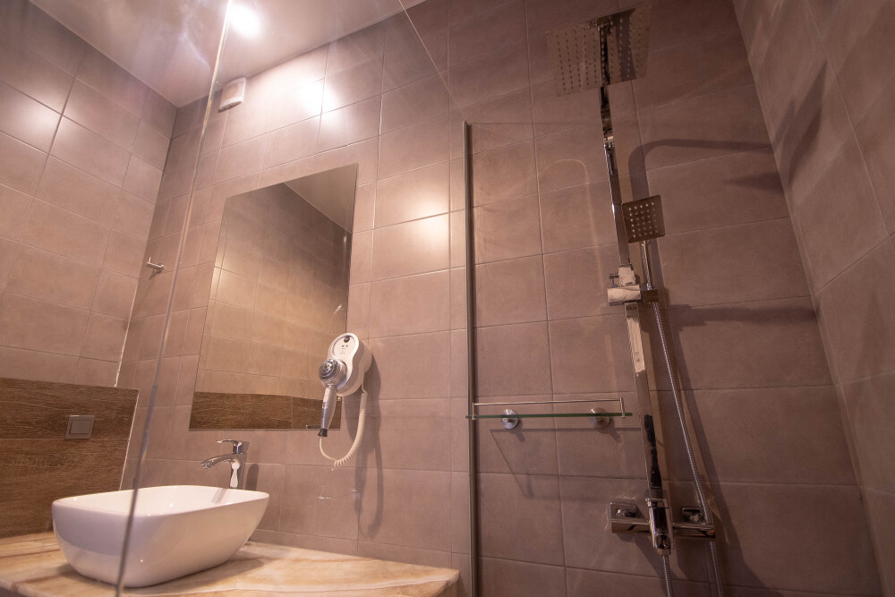 Просторный номер площадью 30 м2 с большой двухместной или двумя отдельно стоящими кроватями с матрасами класса Премиум-комфорт вмещает двух человек, с возможной дополнительной кроватью для 1 взрослого и ребенка до 12 лет на диване. В номере есть гостиный уголок с диваном и креслом, а также балкон с мебелью. Панорамные окна заливают комнату светом и открывают живописные виды на водопад, монастырь, горы или парк в зависимости от расположения номера.