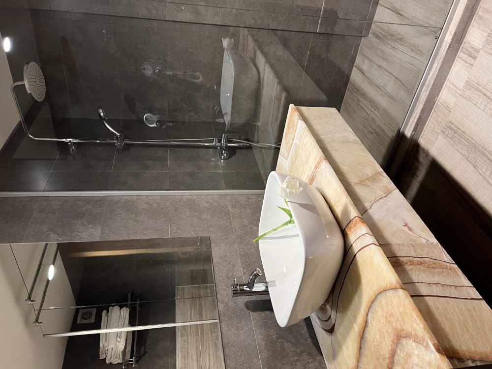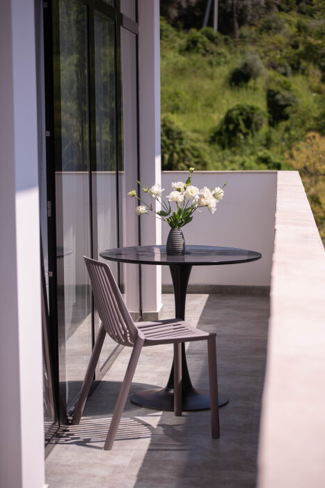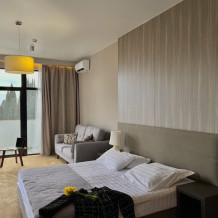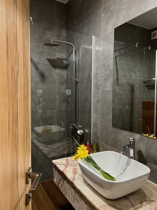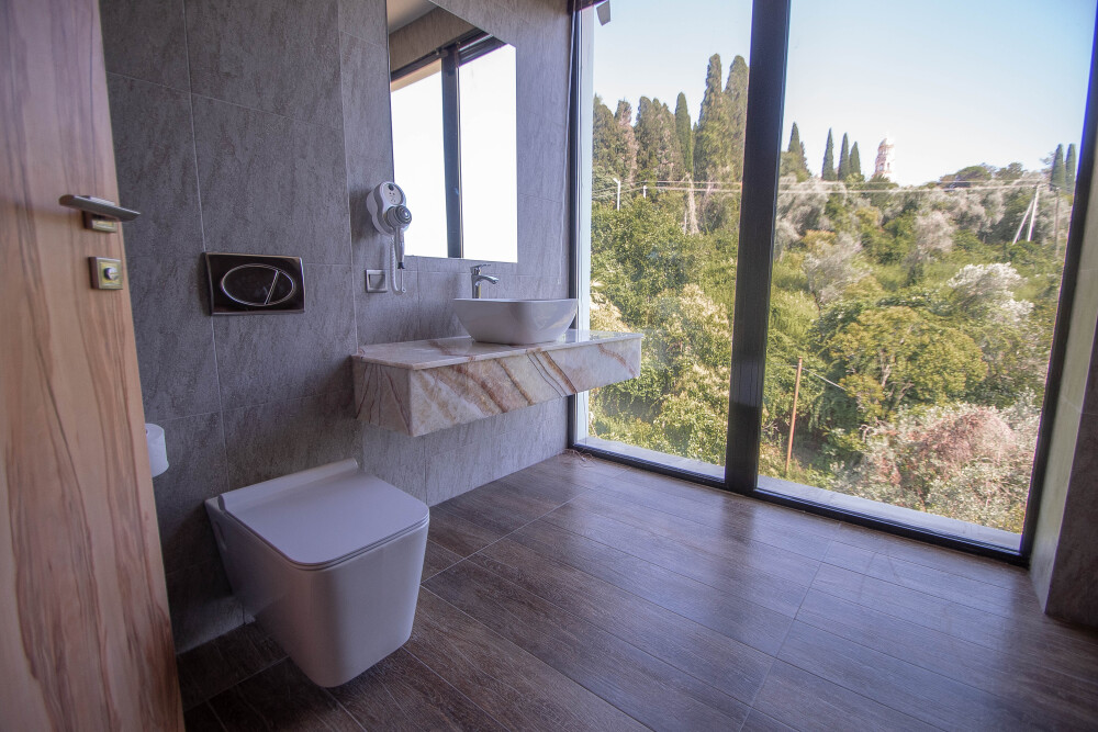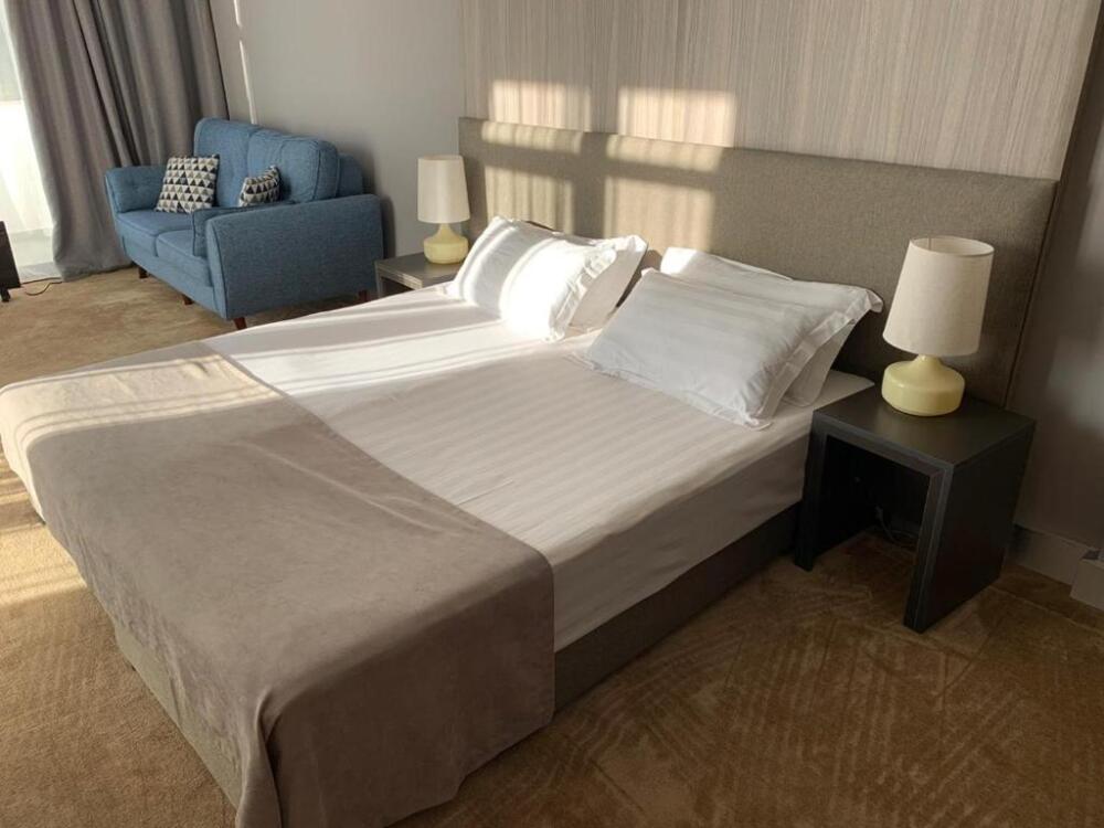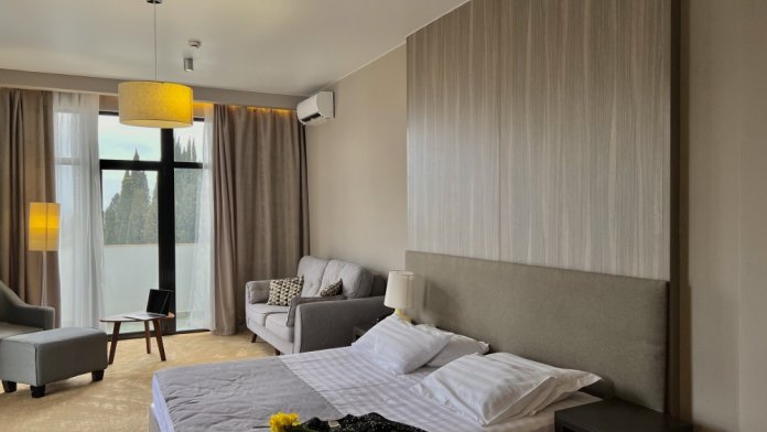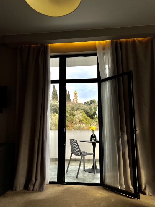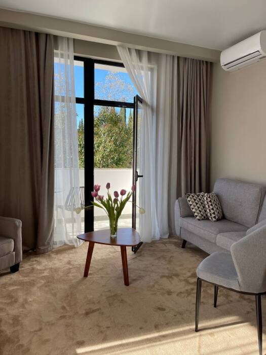 Просторный номер для ценителей комфорта! В номере двуспальная кровать, уютный дивани кресло для отдыха и чтения у торшера, достаточно много места для дополнительного спального места, большая и светлая ванная комната с окном в пол и видом на Новоафонский монастырь, 2 балкона с лежаками и мебелью для утреннего кофепития или вечернего бокала вина - все сделано для вашего релакса и уюта.