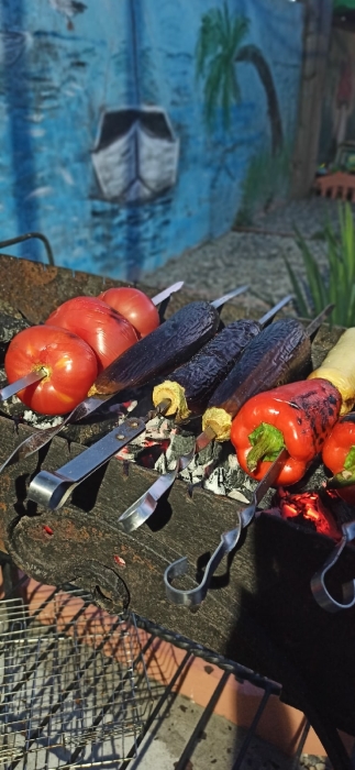 Кухня с полным набором посуды и мангал находятся во дворе, а также : игровая площадка,шезлонги и качели.