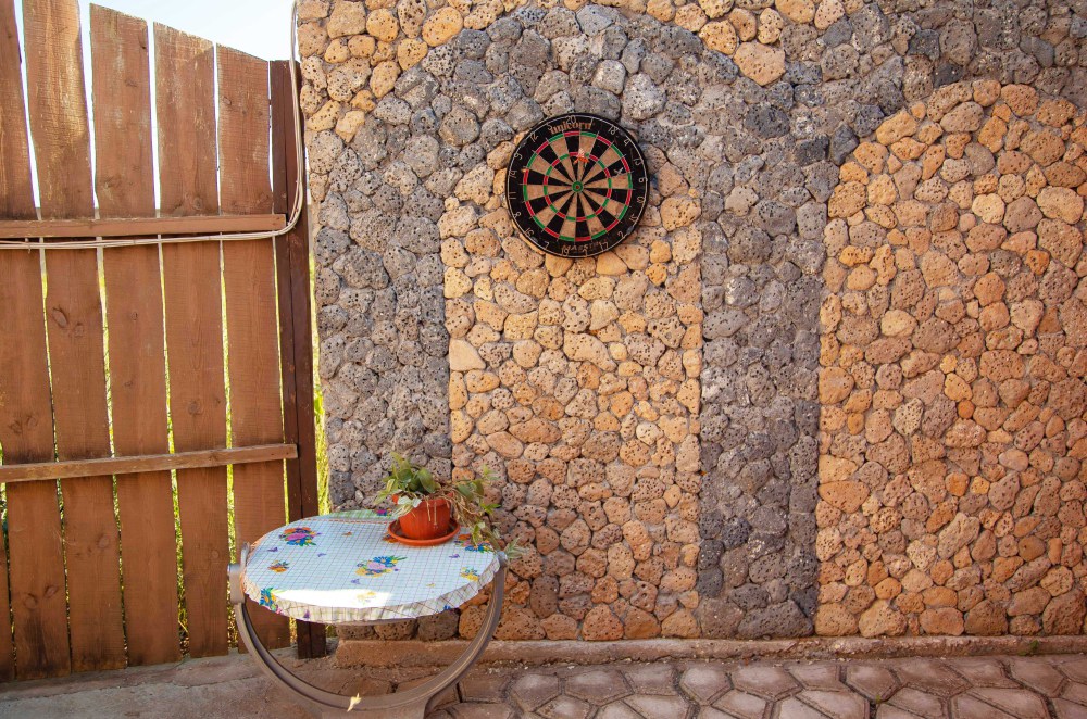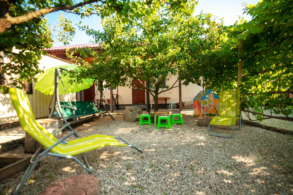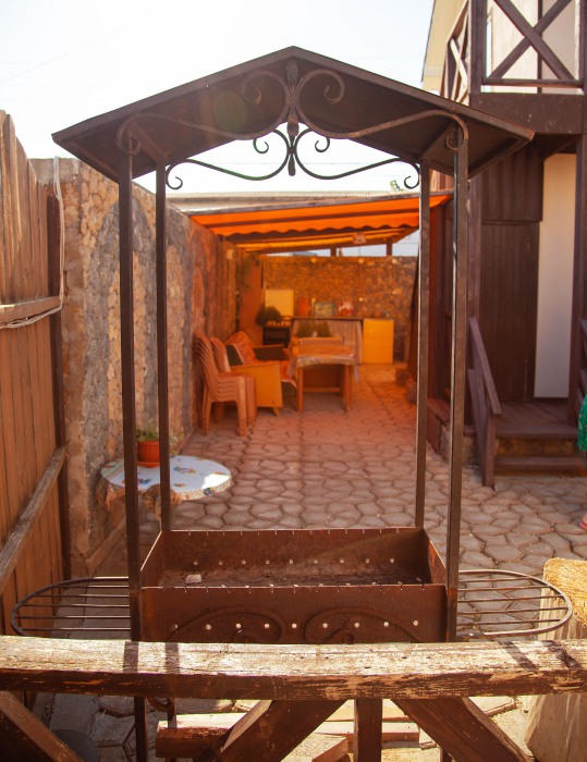 Во дворе кухня с полным набором посуды,мангал,качели,шезлонги,зона отдыха.Двор уютный,тенистый, возле беседки розарий и гутой виноградник,потому во время отдыха вам будет комфортно и не жарко.