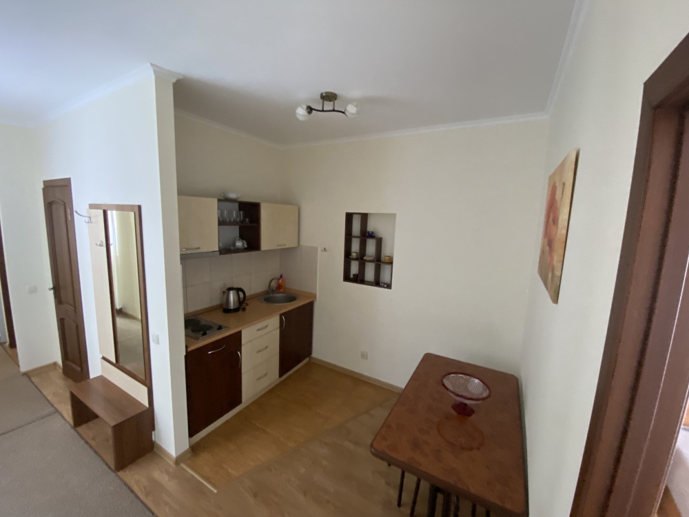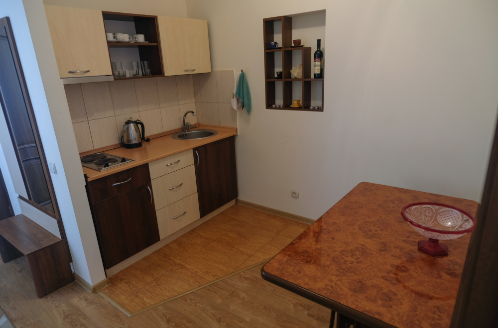 Кухня оборудована:Чайник эл., холодильник, плита на две конфорки, вытяжка, мойка, кухонная утварь.