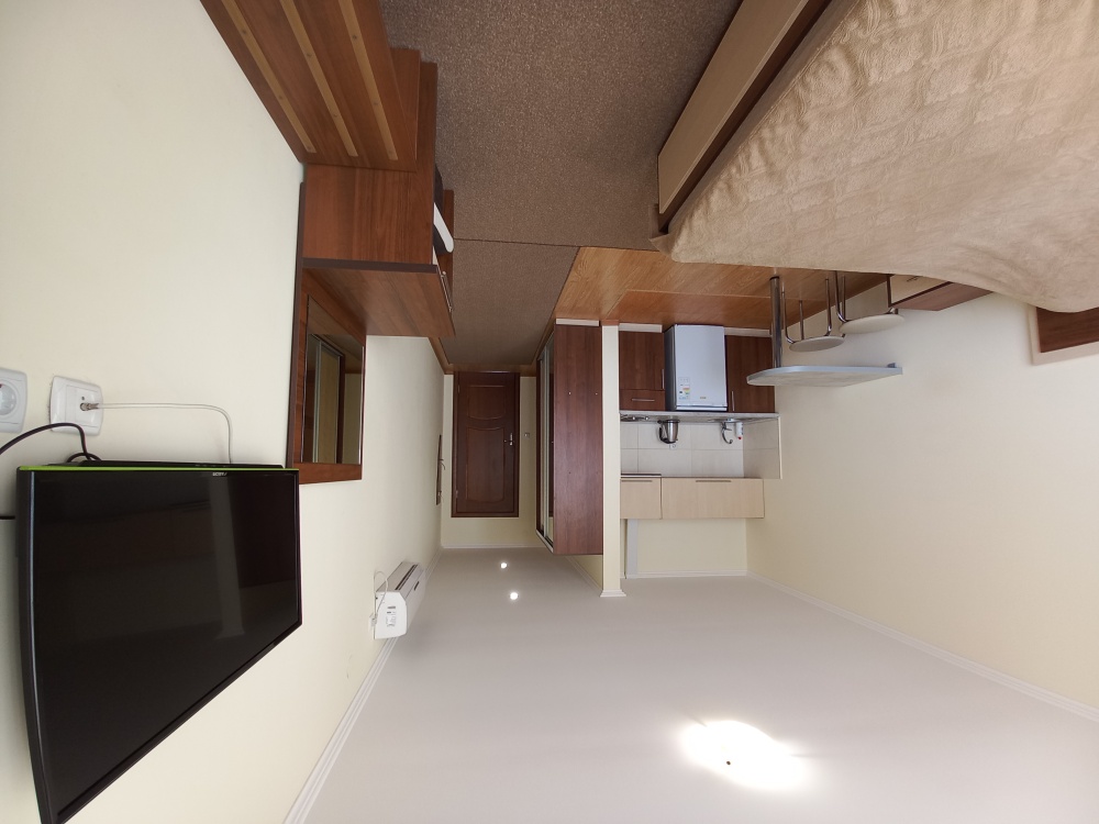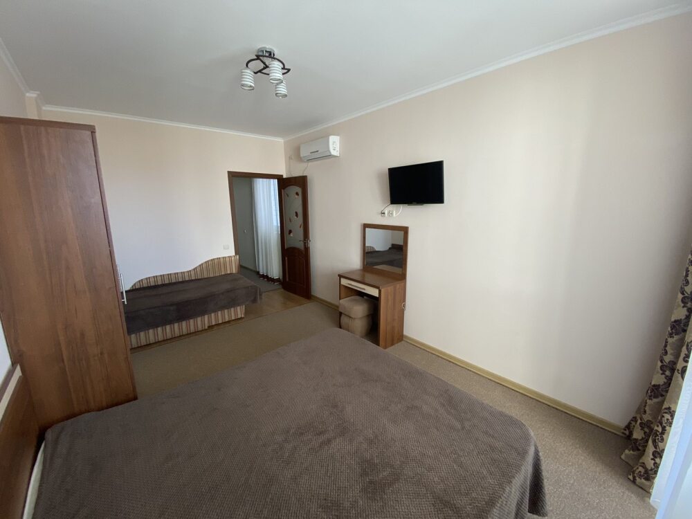 Санузел (унитаз, умывальник, душ). В номере имеется кондиционер, ж\к телевизор, обеденная зона (стол и три стула)