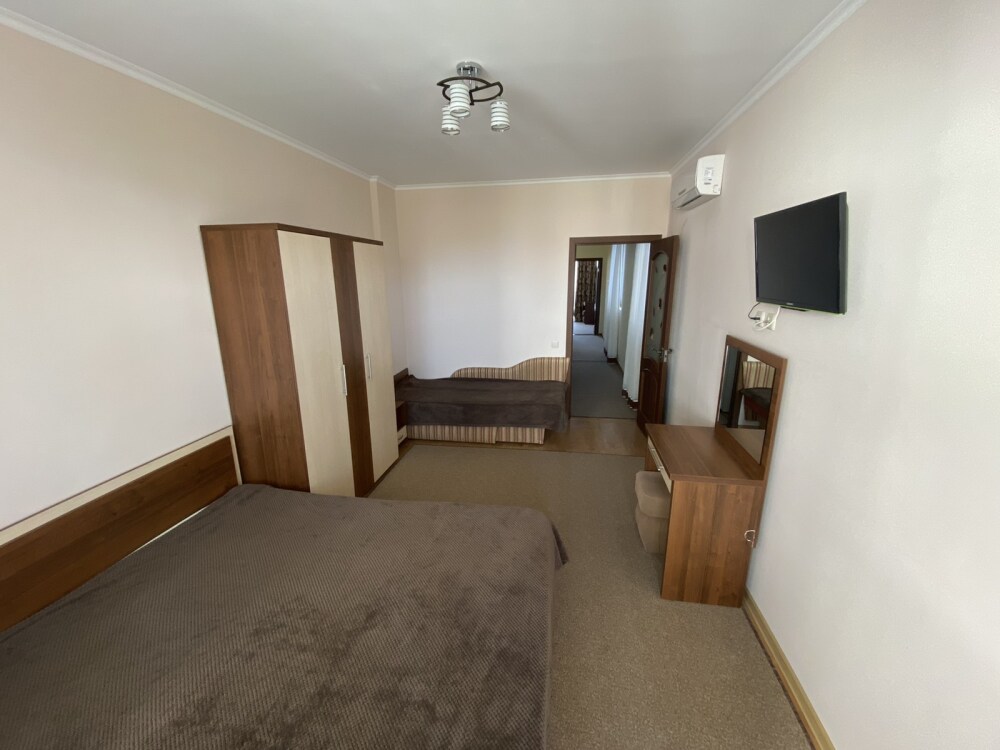 Трехместный номер с балконом и кухонным блоком. Кухонный блок оборудован: Эл. чайником., холодильником, плитой на две конфорки, вытяжкой, мойкой, кухонной утварью. В номере имеется обеденная зона (стол и три стула).