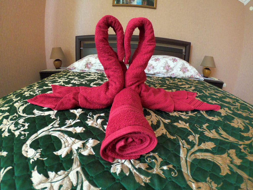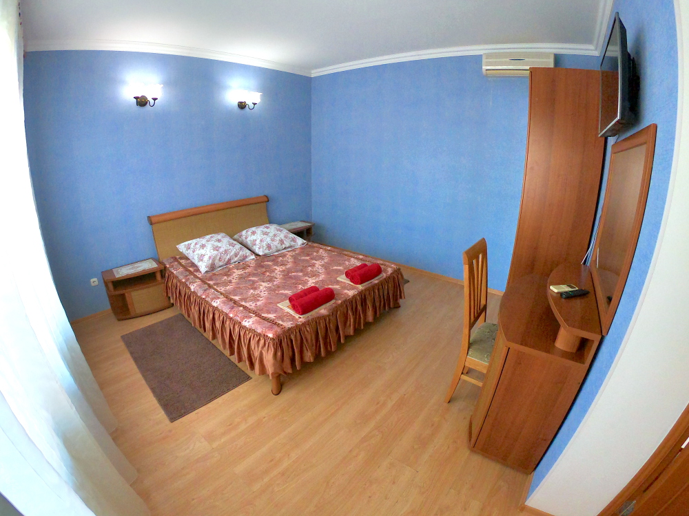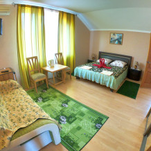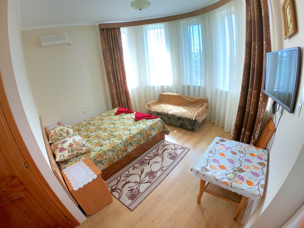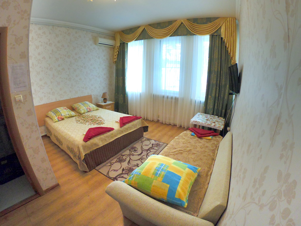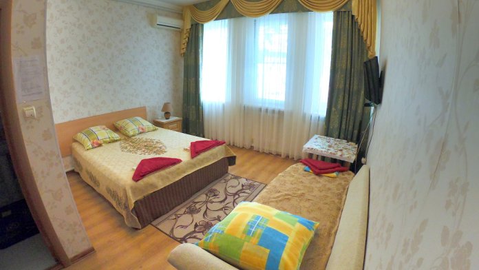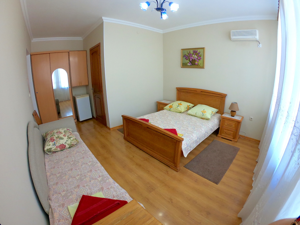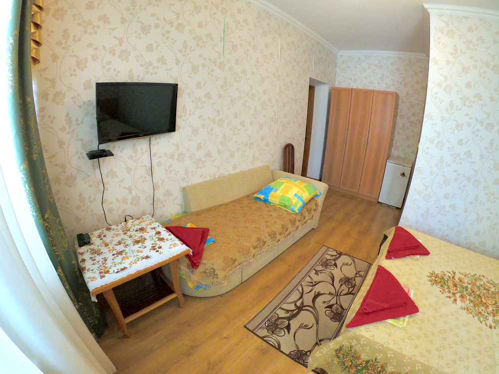 Трёхместный номер стандарт: в номере двухспальная кровать, односпальная кровать, ЖК телевизор, холодильник, сплит-система, чайник, фен. Предоставляются полотенца.