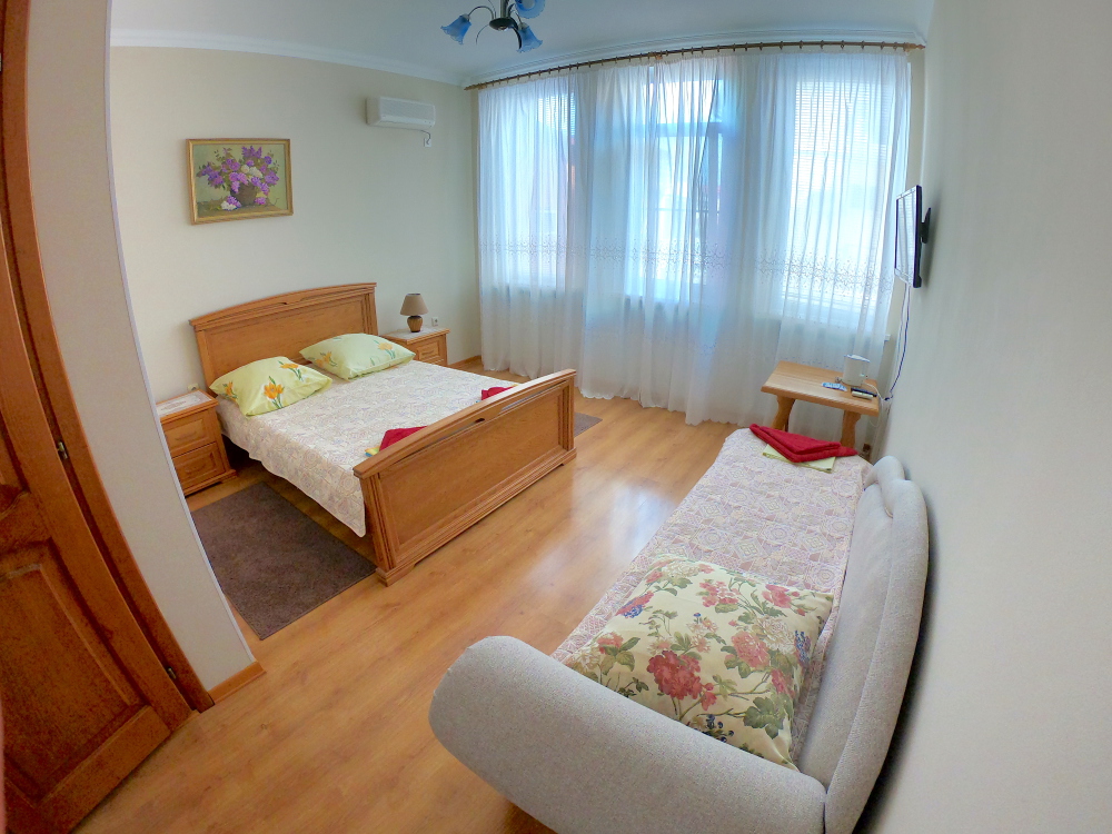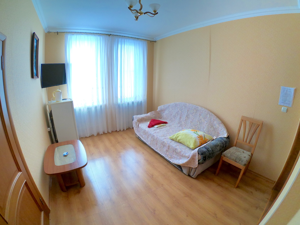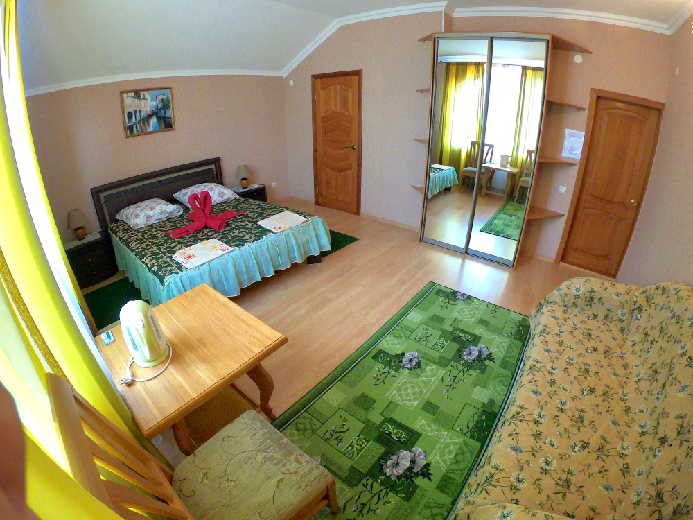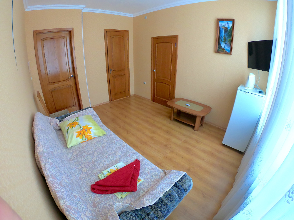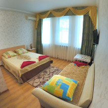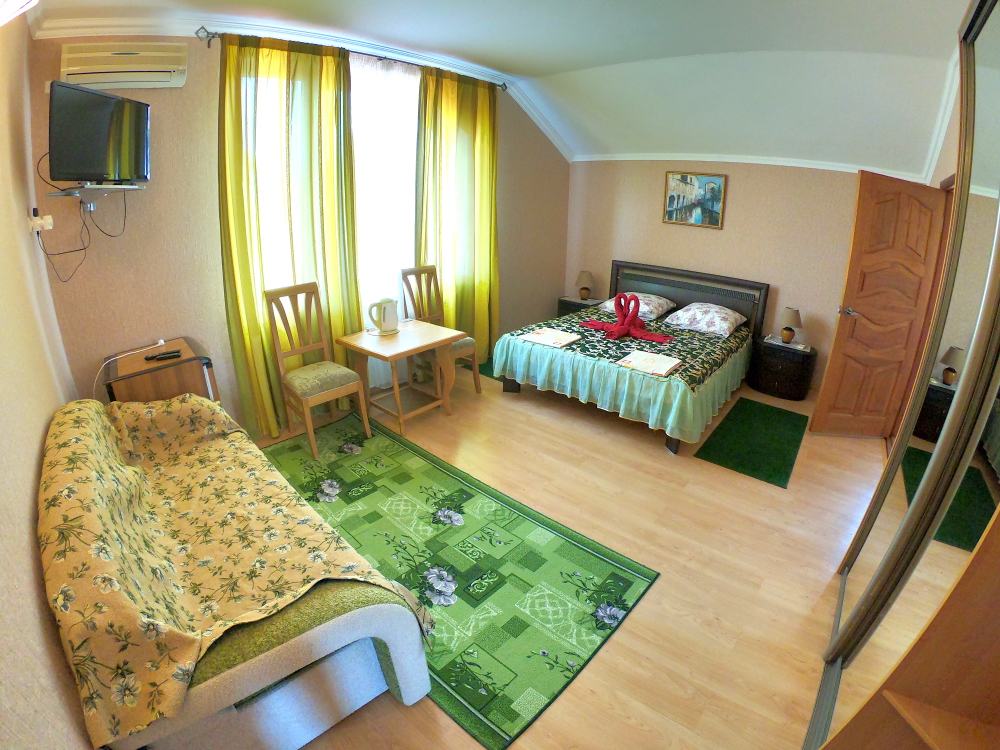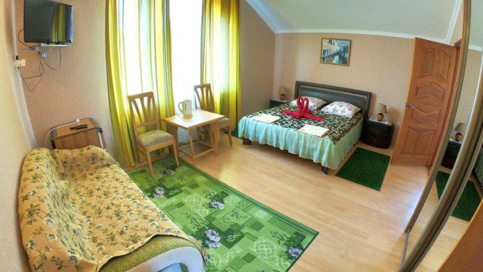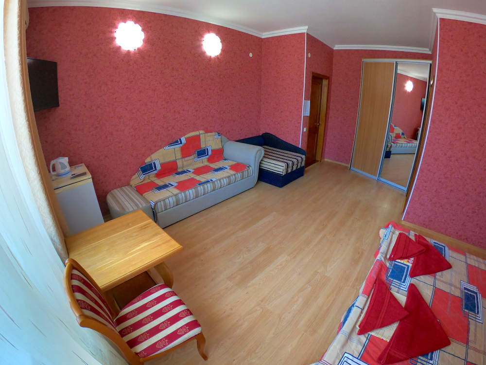Двухкомнатный семейный номер идеально подойдёт для отдыха большой семьёй. В номере имеется сплит-система, ЖК телевизоры, холодильник, чайник, фен.