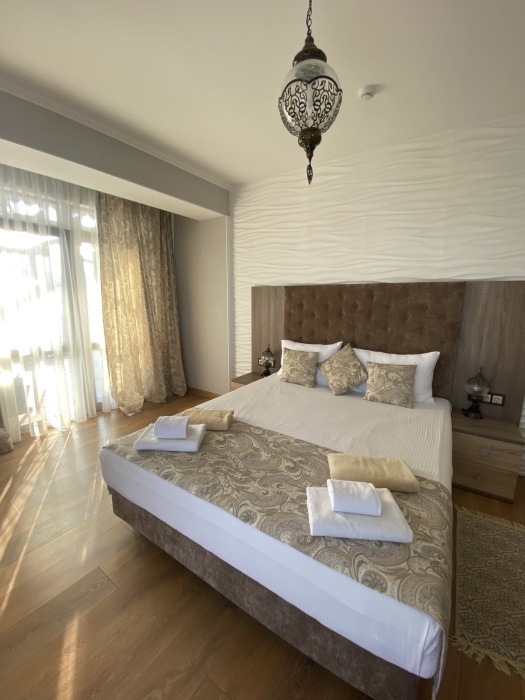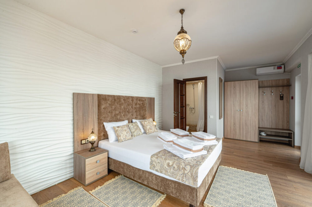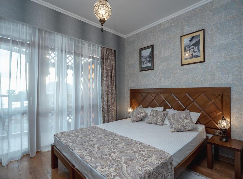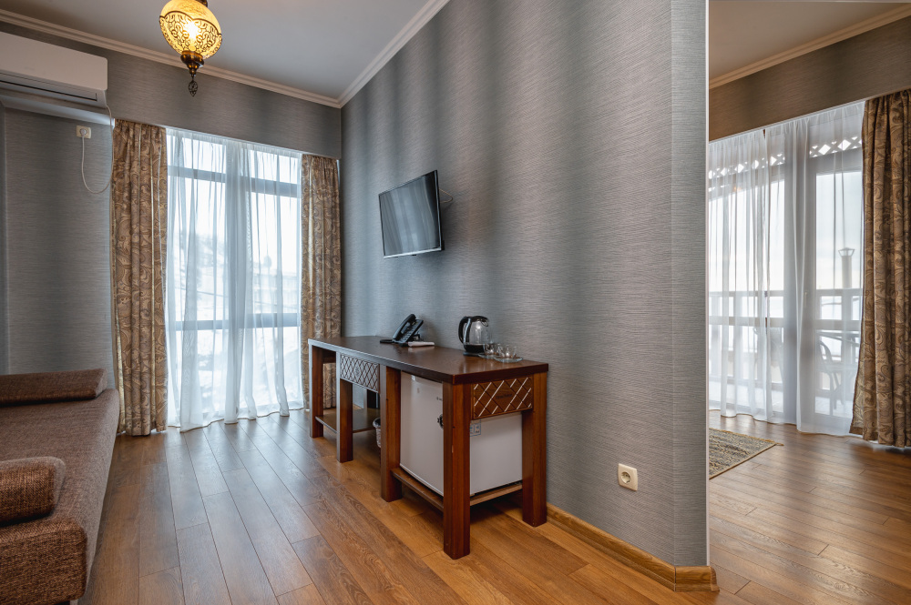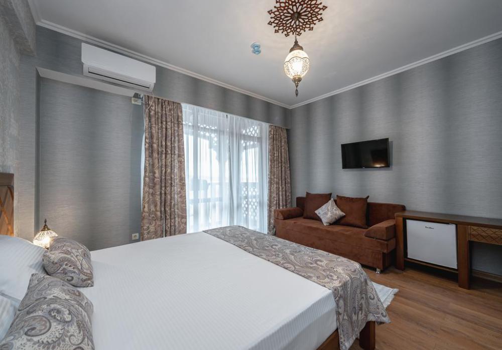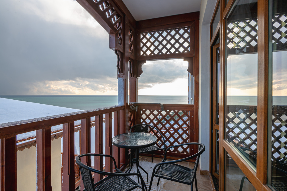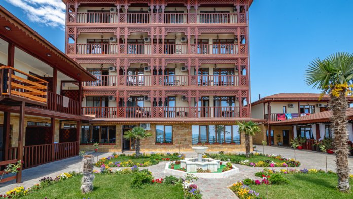 И дополняет мечту незабываемый интерьер и экстерьер нашего отеля. Отель выполнен в восточном стиле, напоминая собой великолепные восточные дворцы Крымского ханства. Весь интерьер и мебель выполнены из натурального резного дерева и экологичных материалов (деревянные фасады балконов, мебель из массива ясеня, отделка из натурального камня). Используются передовые экологические системы отопления и водоочистки.