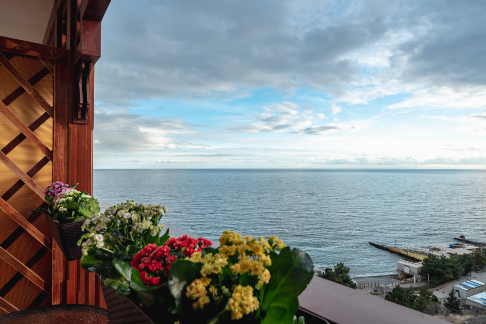Наш отель расположился на склоне горы Къара Бурун, и это позволяет Вам наблюдать великолепный и незабываем вид из окон отеля на нетронутую Крымскую природу и чудесную набережную Черного моря (все окна отеля выходят на море).