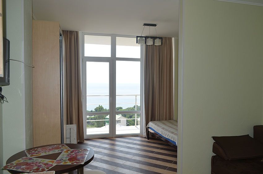 Уютная квартира на четвертом этаже шестиэтажного дома. С балкона открывается шикарный вид на море.